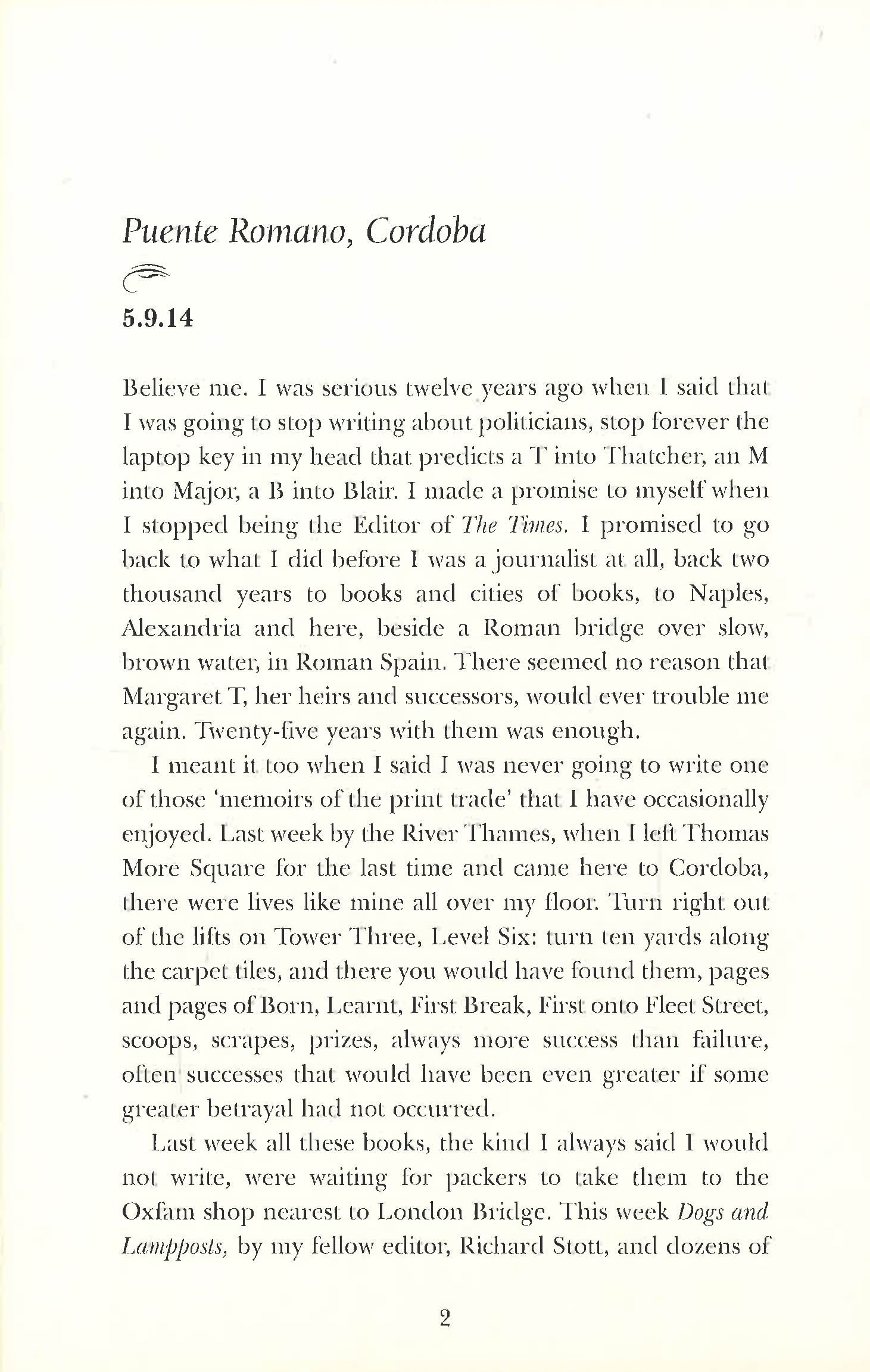 A year after the death of Margaret Thatcher, a young woman arrives to ask Peter Stothard, former Editor of The Times, some sharp questions about his memories of the Thatcher era. During her interview the offices from where he has long observed British politics are being flattened by wrecking balls. Forgotten stories return.