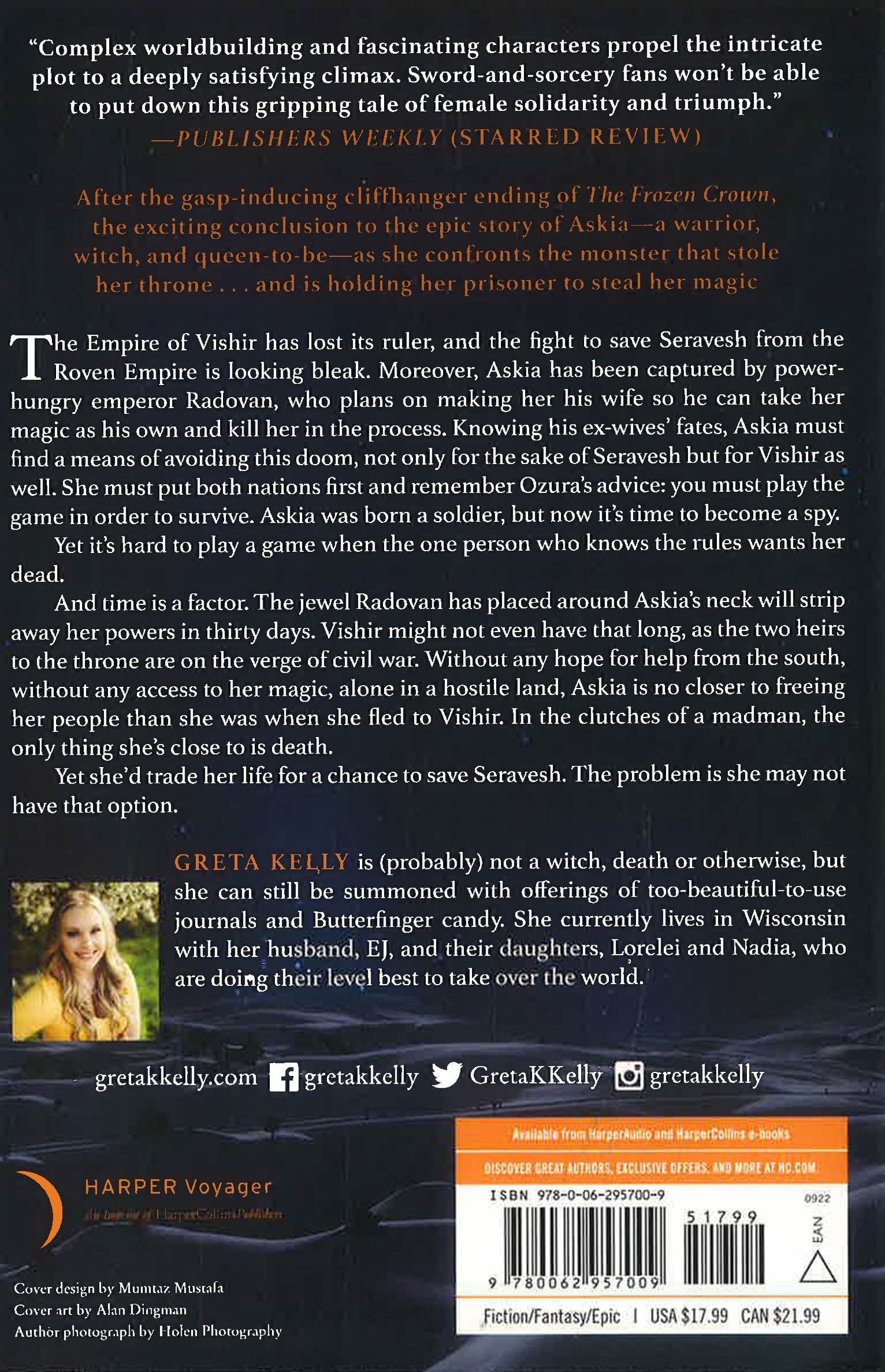 The Empire of Vishir has lost its ruler, and the fight to save Seravesh from the Roven Empire is looking bleak. Moreover, Askia has been captured by power-hungry Emperor Radovan, who plans on making her his wife simply so he can take her magic as his own, killing her in the process. Aware of his ex-wives’ fates, Askia must find a means of avoiding this doom, not only for the sake of Seravesh, but now for Vishir as well. She must put both nations first and remember Ozura’s advice: you must play the game in order to survive. Askia was born a soldier, but now it’s time to become a spy.