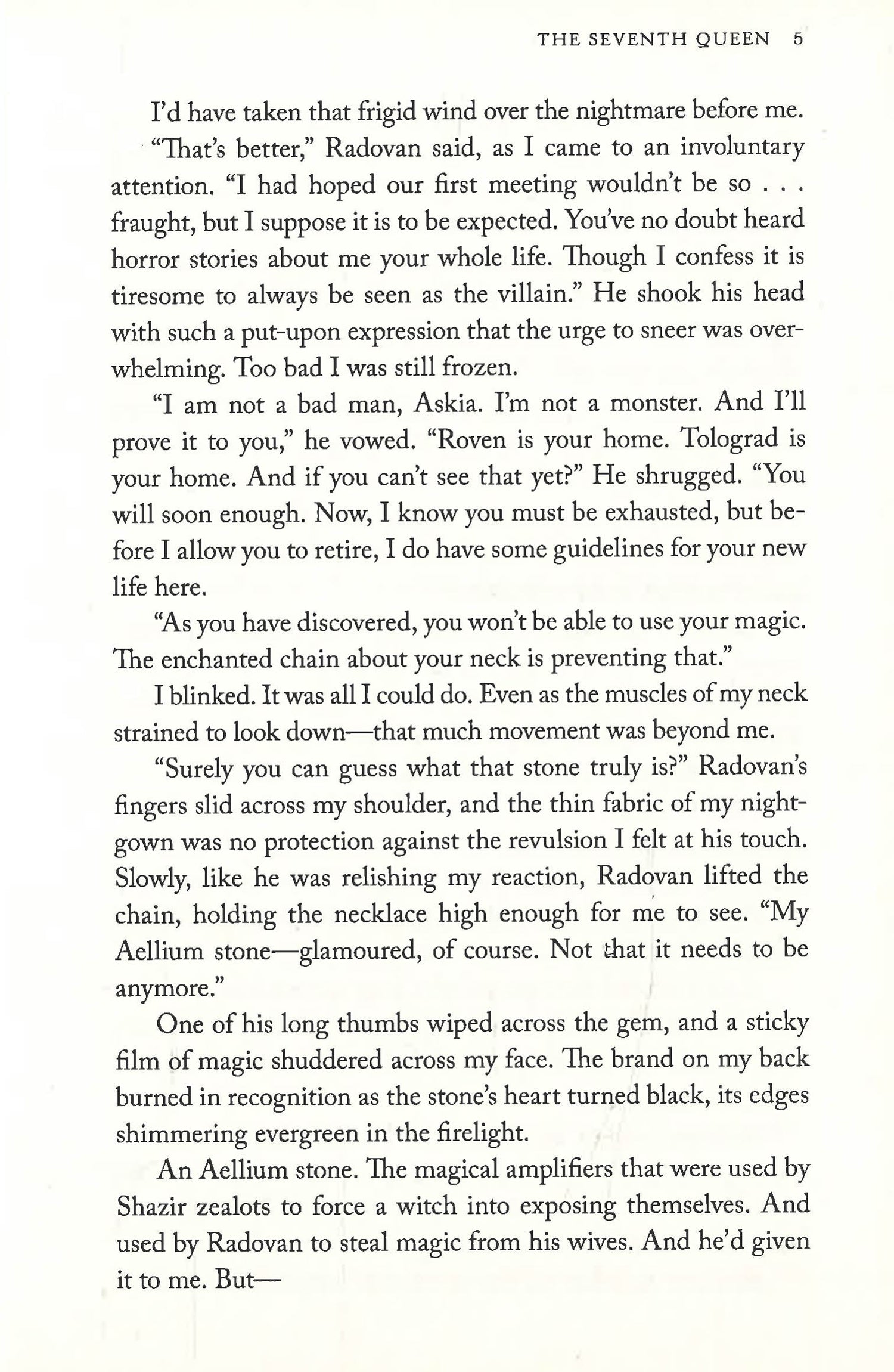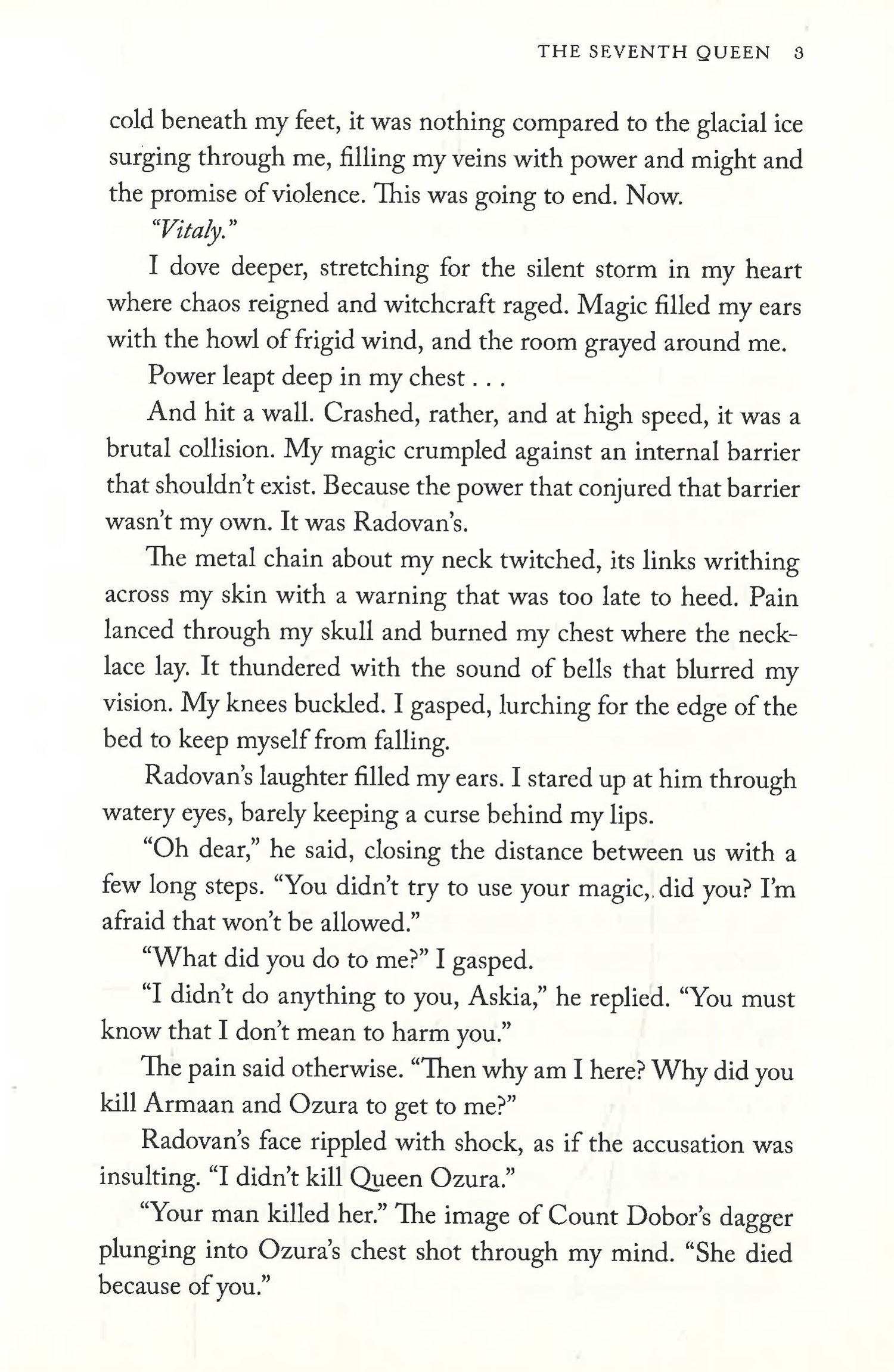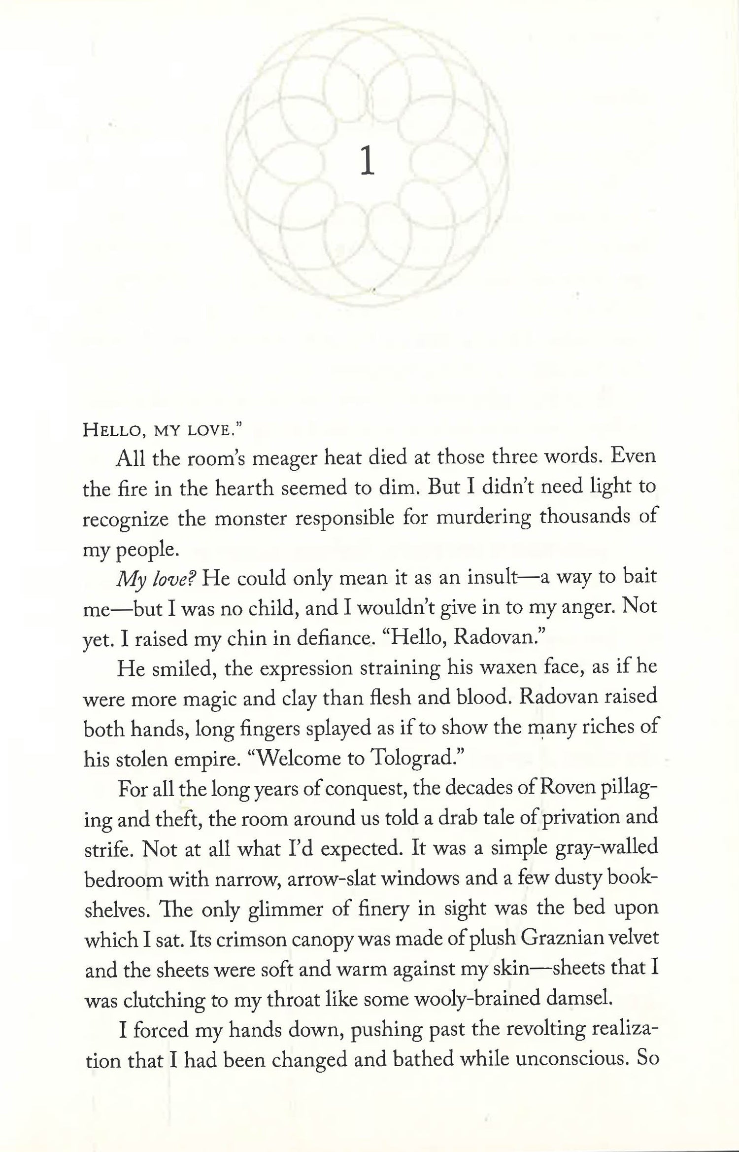 And time is a factor. The jewel Radovan has put around her neck will pull her power from her in thirty days. Worse, Vishir might not even have that long, as the two heirs to the throne are on the verge of civil war. Without any hope for help from the south, without any access to her magic, alone in a hostile land, Askia is no closer to freeing her people than she was when she fled to Vishir. In the clutches of a madman, the only thing she’s close to is death.