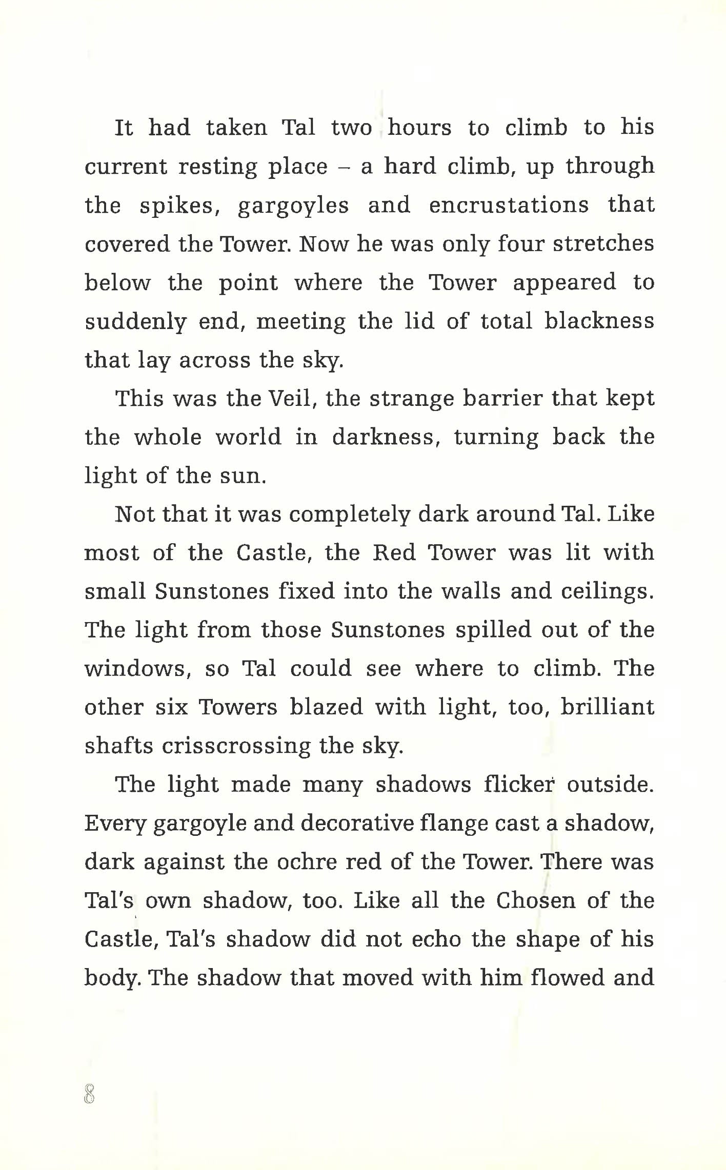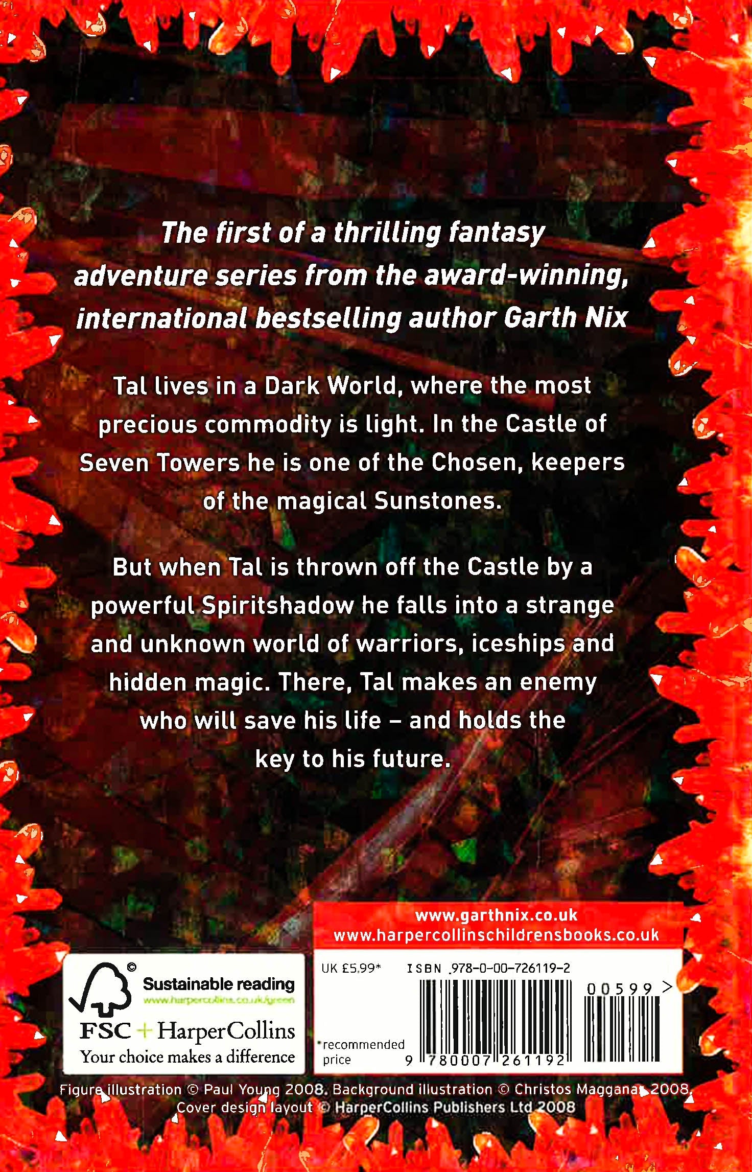 First of a thrilling fantasy adventure series set on the Dark World, where society is ranked according to its colour clan and the most precious commodity is light. In all the world there is only one place that ever sees the sun. A seven-towered castle built upon a mountain high above the desolate ice lands below. Tal is getting ready for the Day of Ascension – a day when all the 13-year-old Chosen from the Castle of Seven Towers enter the spirit world of Aenir. Then his father disappears with the family's Primary Sunstone. Without it, Tal cannot enter Aenir and bind himself to a Spiritshadow – a guardian being, both protector and friend. Tal tries to steal a Sunstone, but during his act of thievery is thrown off the Castle of Seven Towers by a powerful Spiritshadow Keeper. He falls down to the iceworld below, where he is captured by Icecarls. To save his life, he must team up with Milla – a Shield-Maiden-in-training – and offer his aid to the nomads. Which complicates his task immeasurably…