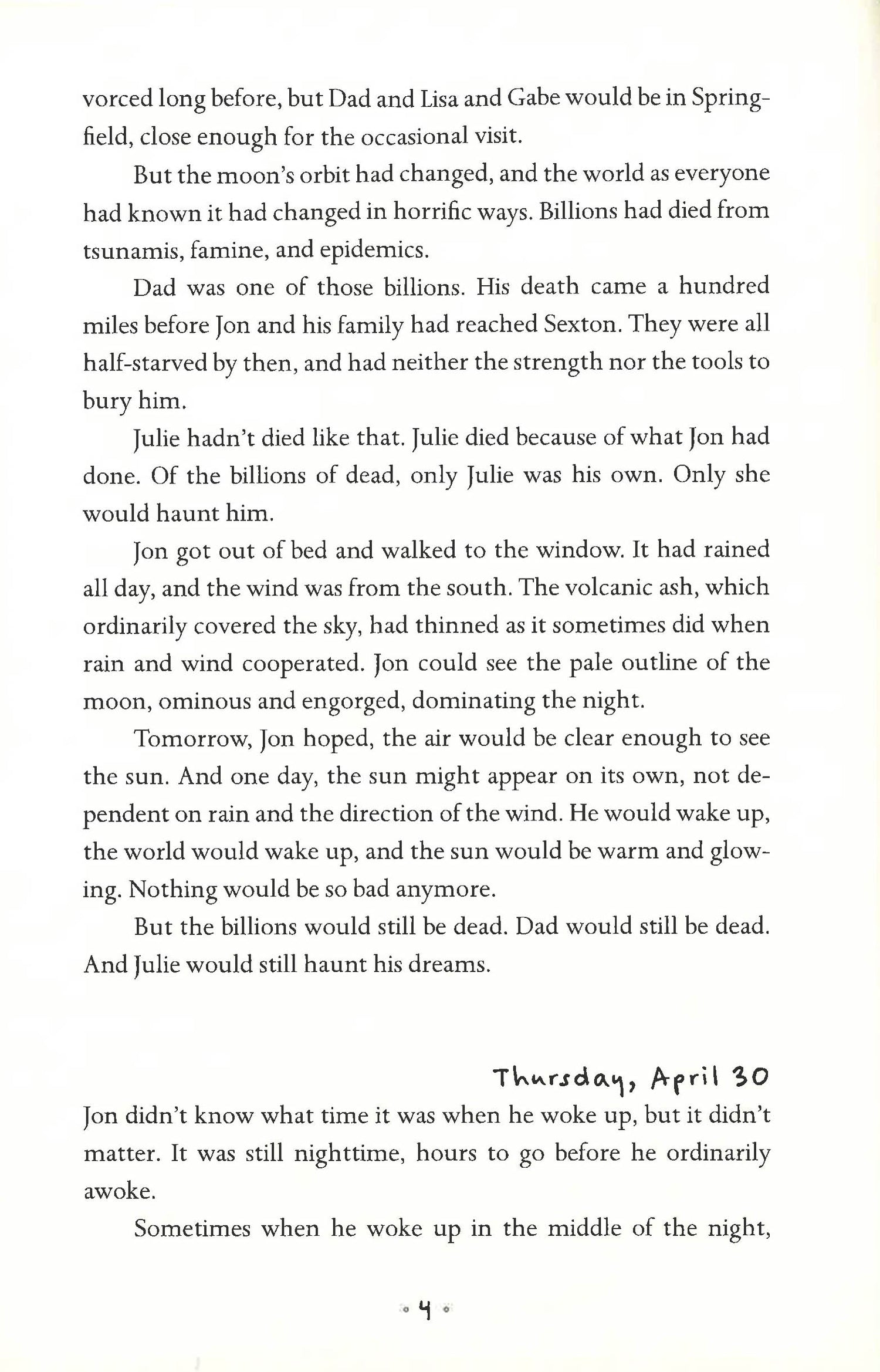 It's been more than two years since Jon Evans and his family left Pennsylvania, hoping to find a safe place to live, yet Jon remains haunted by the deaths of those he loved. His prowess on a soccer field has guaranteed him a home in a well-protected enclave. But Jon is painfully aware that a missed goal, a careless word, even falling in love, can put his life and the lives of his mother, his sister Miranda, and her husband, Alex, in jeopardy. Can Jon risk doing what is right in a world gone so terribly wrong?