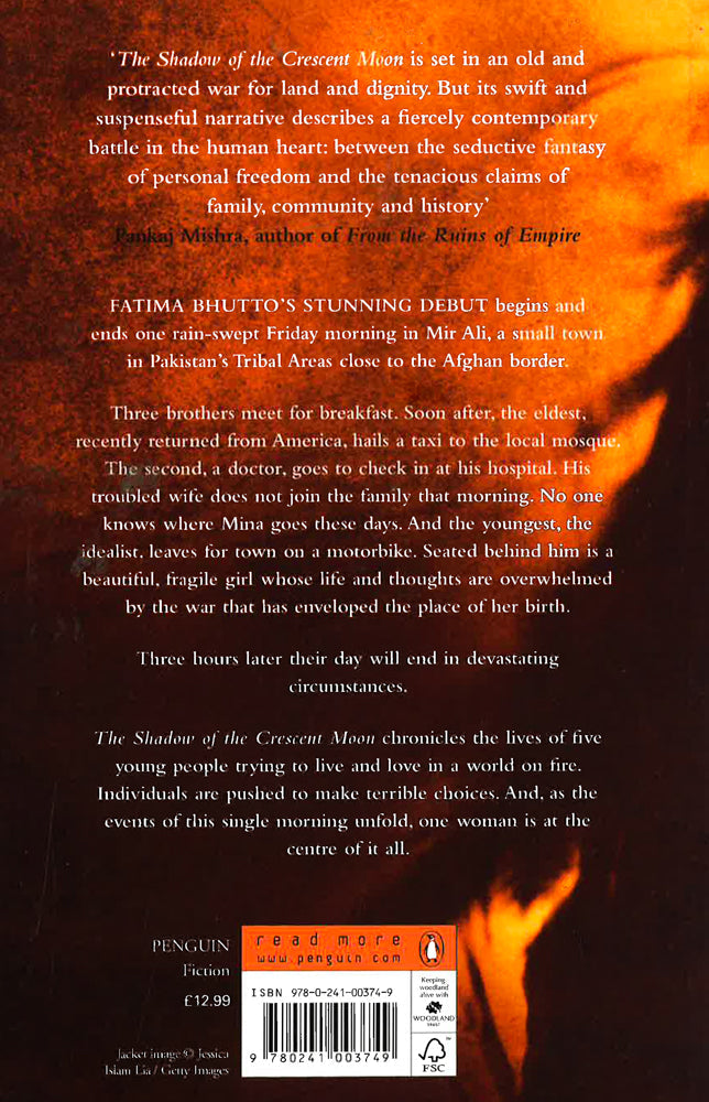 Fatima Bhutto’s stunning fiction debut begins and ends one rainswept Friday morning in Mir Ali, a small town in the troubled tribal region of Waziristan. Three brothers meet for breakfast. Soon after, the eldest, recently returned from America, hails a taxi to the local mosque. The second brother, a doctor, goes to check in at his hospital. His troubled wife does not join the family that morning for no one knows where Mina goes these days. And the youngest, the idealist, leaves for town on a motorbike. Seated behind him is a beautiful, fragile girl whose world has been overwhelmed by war. Three hours later, their day will end in devastating circumstances. Beautifully written, full of emotion and heartbreak, The Shadow of the Crescent Moon is an extraordinary novel.