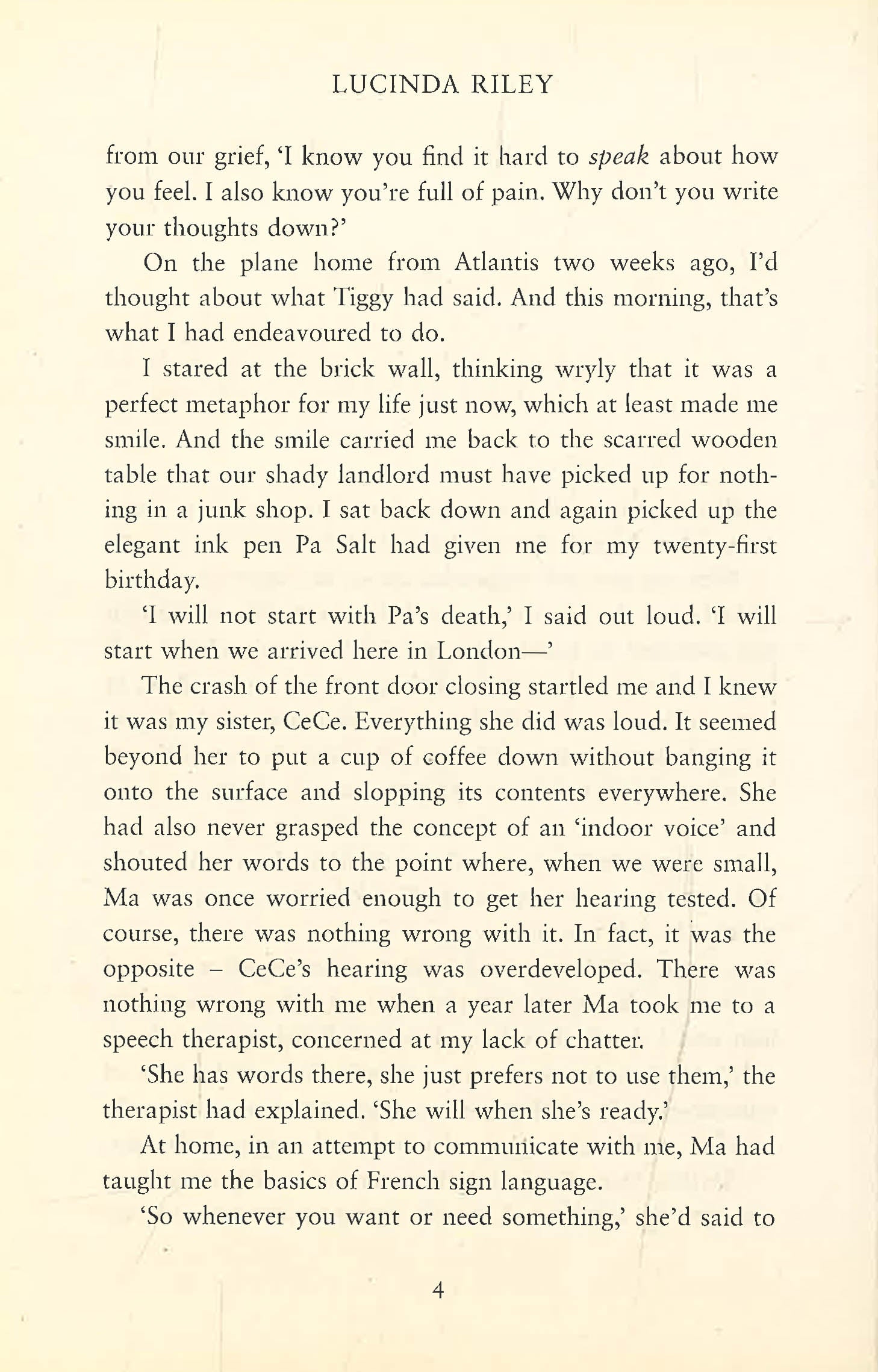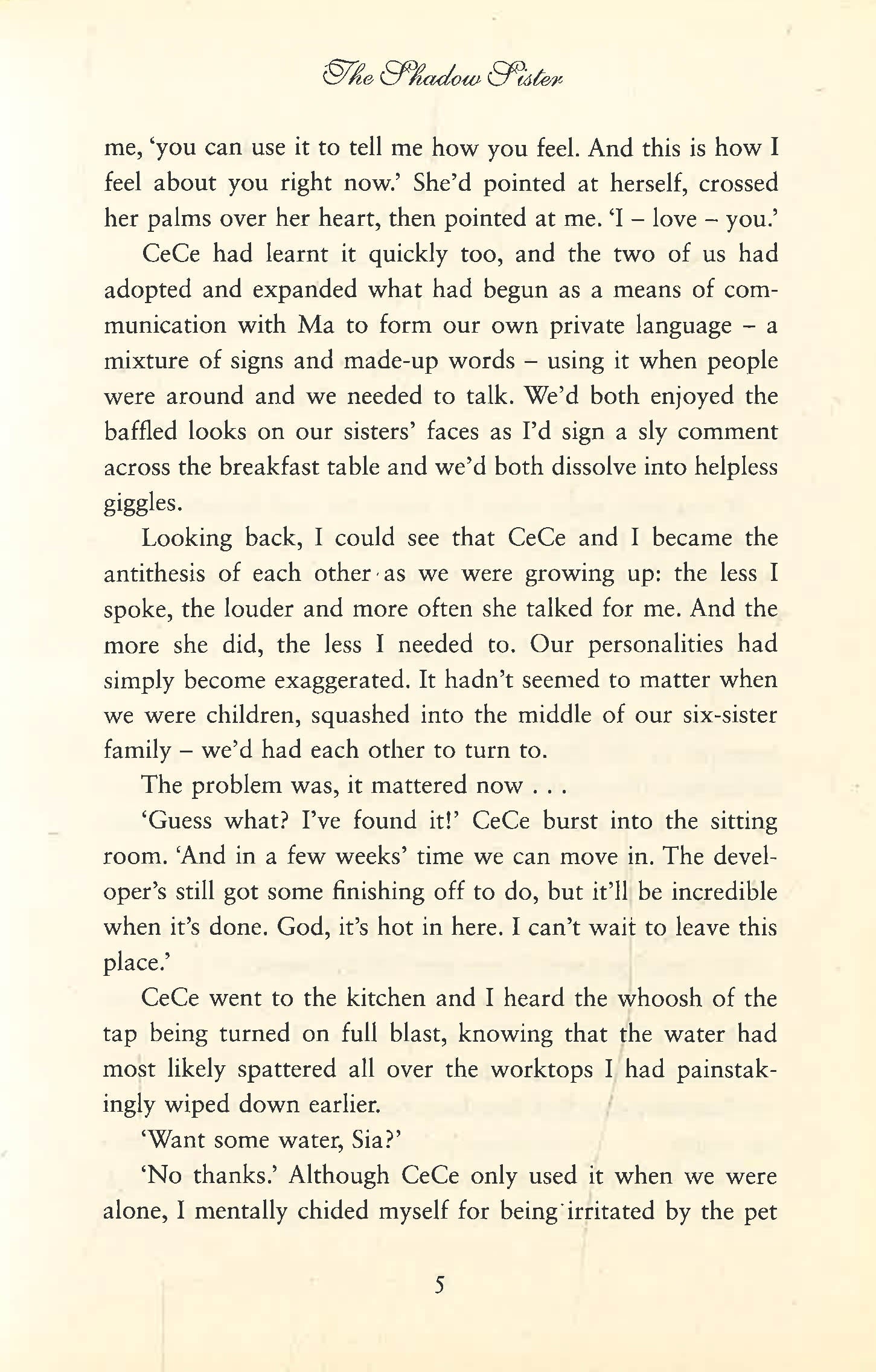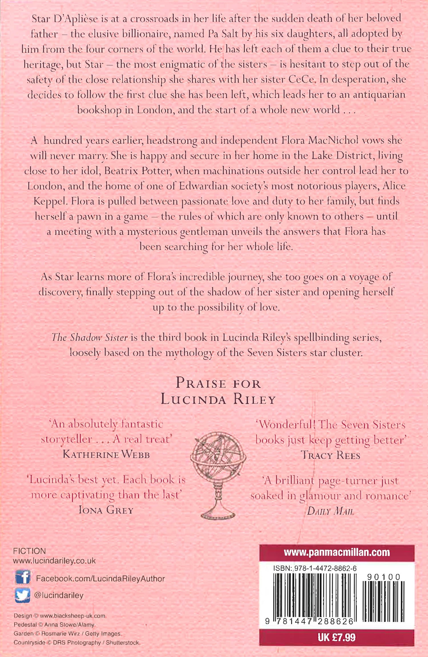 Following on from the bestselling The Seven Sisters and The Storm Sister, The Shadow Sister is the third book in Lucinda Riley's spellbinding series, loosely based on the mythology of the Seven Sisters star cluster.Star D'Apliese is at a crossroads in her life after the sudden death of her beloved father - the elusive billionaire, named Pa Salt by his six daughters, all adopted by him from the four corners of the world. He has left each of them a clue to their true heritage, but Star - the most enigmatic of the sisters - is hesitant to step out of the safety of the close relationship she shares with her sister CeCe. In desperation, she decides to follow the first clue she has been left, which leads her to an antiquarian bookshop in London, and the start of a whole new world . . .A hundred years earlier, headstrong and independent Flora MacNichol vows she will never marry. She is happy and secure in her home in the Lake District, living close to her idol, Beatrix Potter, when machinations outside of her control lead her to London, and the home of one of Edwardian society's most notorious players, Alice Keppel. Flora is pulled between passionate love and duty to her family, but finds herself a pawn in a game - the rules of which are only known to others, until a meeting with a mysterious gentleman unveils the answers that Flora has been searching for her whole life . . .As Star learns more of Flora's incredible journey, she too goes on a voyage of discovery, finally stepping out of the shadow of her sister and opening herself up to the possibility of love.