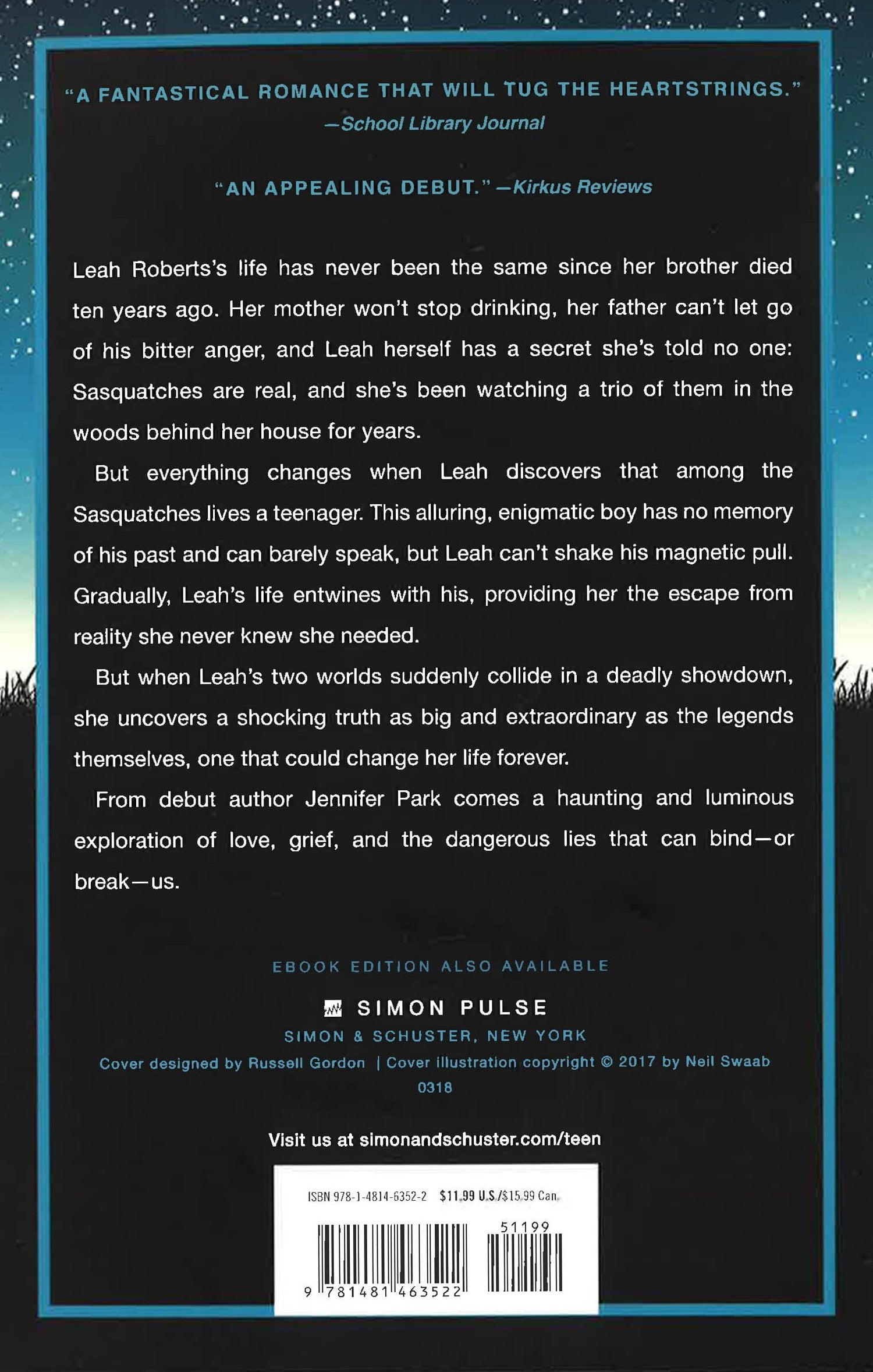 In this haunting and luminescent debut novel, a girl's complicated family life starts to unravel after she finds herself falling for a mysterious boy who lives in the forest behind her house. Leah Roberts's life hasn't been the same since her brother died ten years ago. Her mother won't stop drinking, her father can't let go of his bitter anger, and Leah herself has a secret she's told no one: Sasquatches are real, and she's been watching a trio of them in the woods behind her house for years. Everything changes when Leah discovers that among the sasquatches lives a teenager. This alluring, enigmatic boy has no memory of his past and can barely speak, but Leah can't shake his magnetic pull. Gradually, Leah's life entwines with his, providing her the escape from reality she never knew she needed. But when Leah's two worlds suddenly collide in a deadly showdown, she uncovers a shocking truth as big and extraordinary as the legends themselves, one that could change her life forever. *This book may have a remainder mark