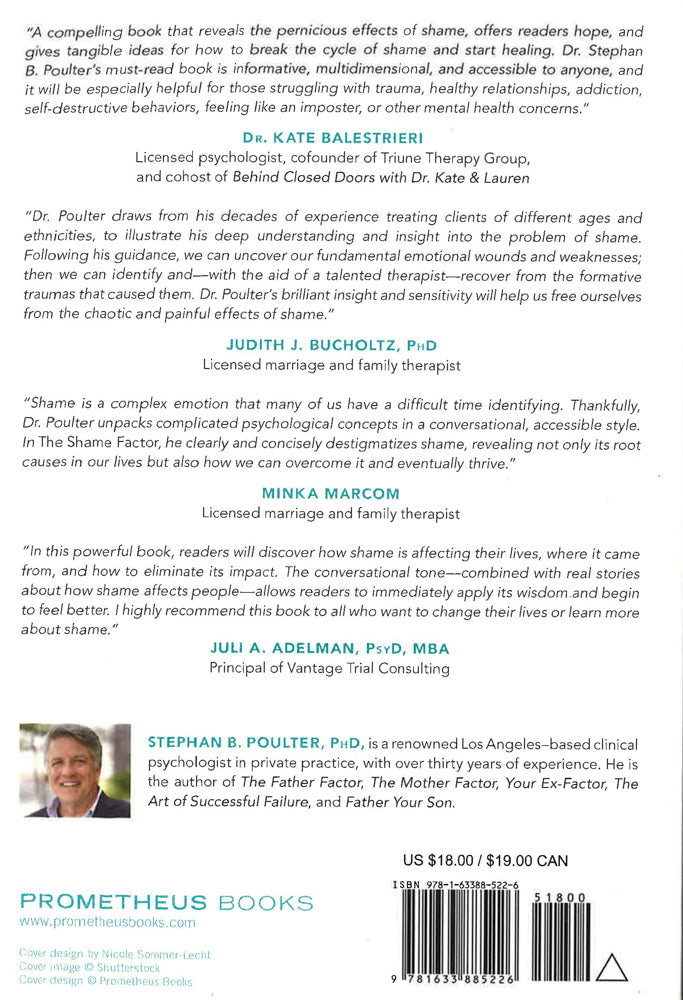 A popular clinical psychologist explores an often misunderstood and unrecognized emotion that's the root cause of many self-defeating and harmful behaviors. Emotional paralysis, a distorted view of self, a feeling of being a fraud, lack of trust in others, fear of criticism resulting in underdeveloped talents, and a chronic sense of being worthless, invisible, or disposable--these are typical symptoms of shame. In this book, psychologist Stephan B. Poulter delves into this "primary emotional wound." Distinguishing it from commonplace guilt over a particular moral failing, he describes this toxic emotion as a pervasive but largely unrecognized "emotional cancer," with the power of undermining many aspects of life. Dr. Poulter guides the reader through exercises that teach one to expose this "big secret" and to recognize the triggers in daily life that arouse fears and other negative emotions. Beyond these first steps, he shows how we can continue the healing process of self-acceptance, self-forgiveness, empathy, and a new sense of inner well-being. Based on thirty years of experience with patients of all ages and from many walks of life, this is a book full of insight and understanding, one that can help most of us discover and realize our full potentials.