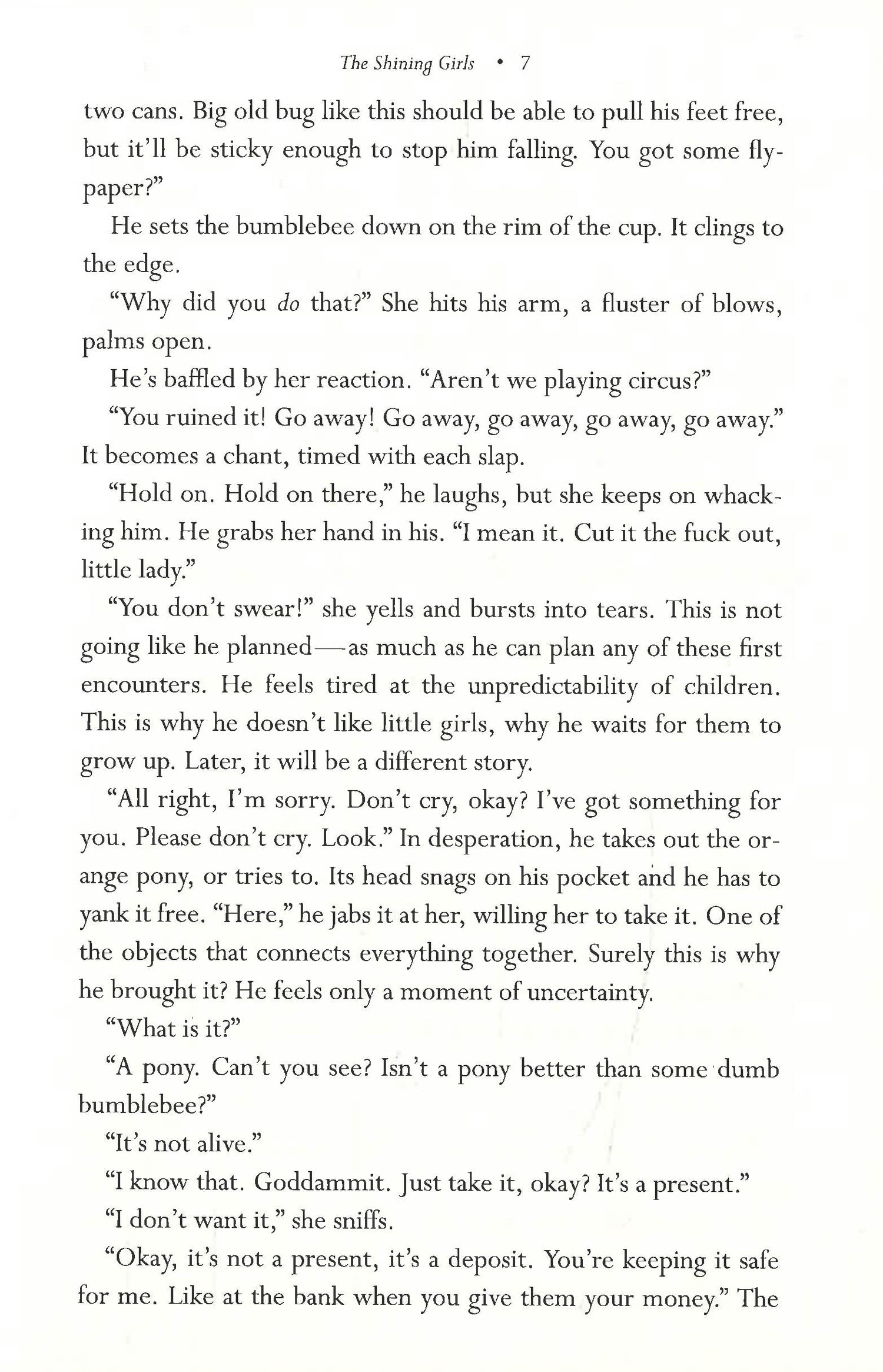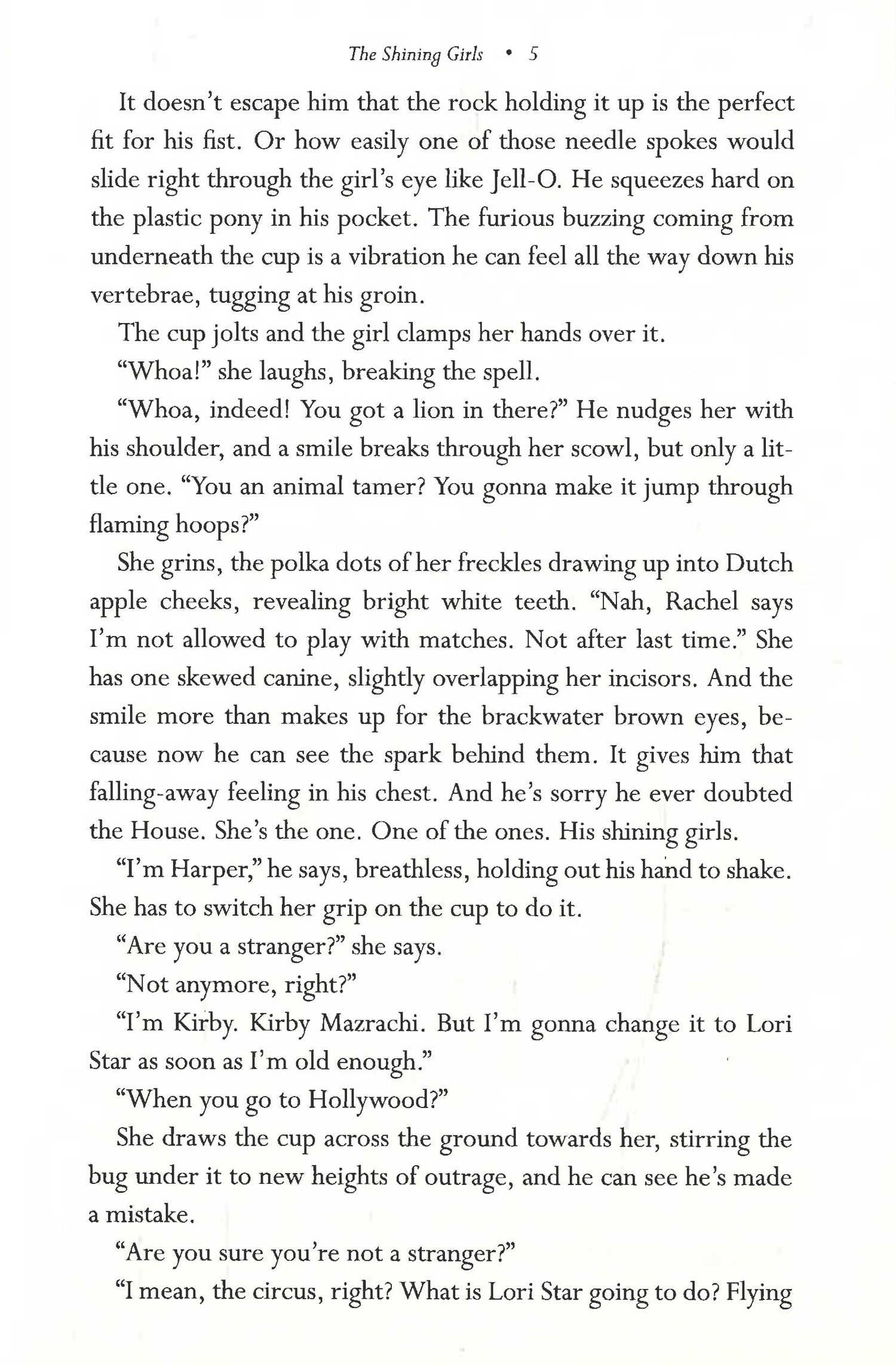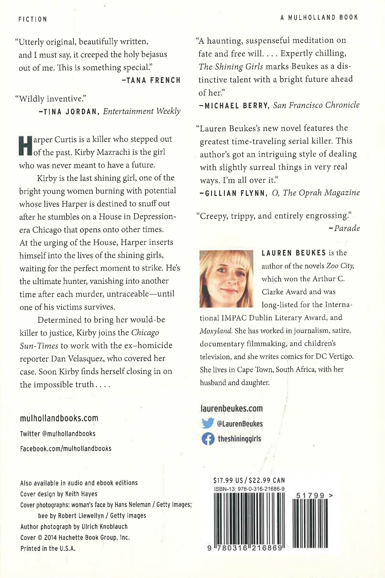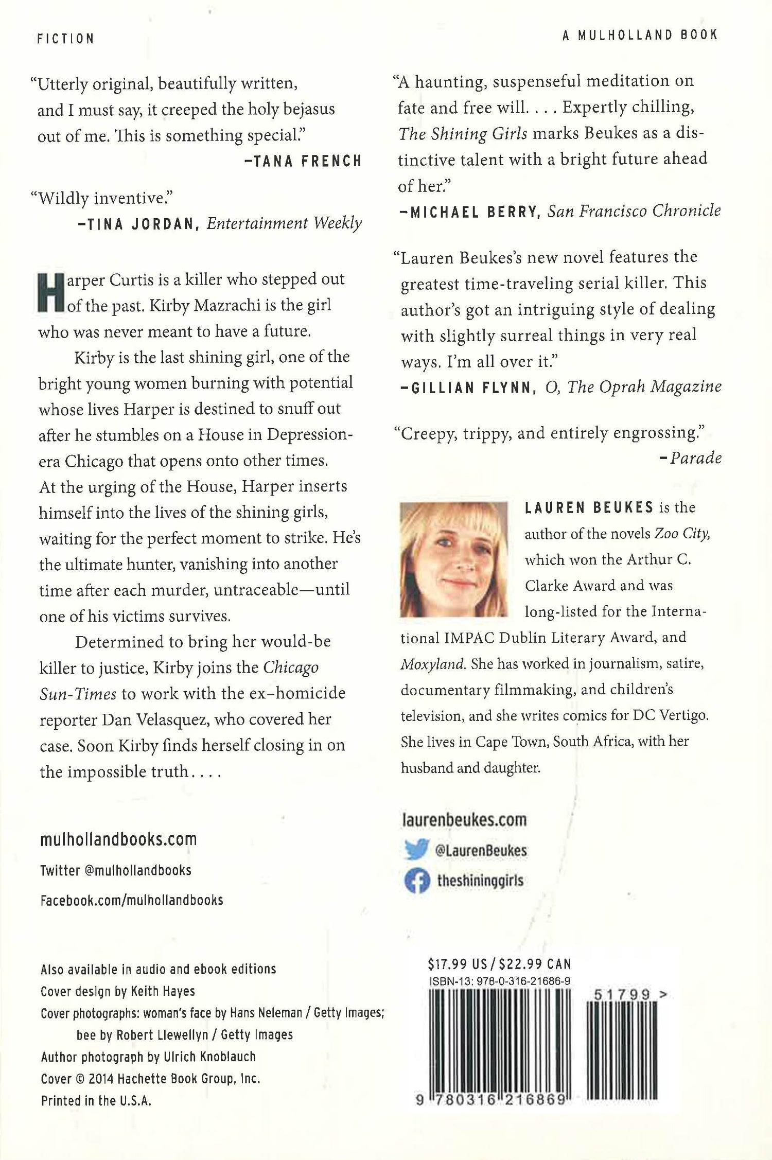 Harper Curtis is a killer who stepped out of the past. Kirby Mazrachi is the girl who was never meant to have a future. Kirby is the last shining girl, one of the bright young women, burning with potential, whose lives Harper is destined to snuff out after he stumbles on a House in Depression-era Chicago that opens on to other times.