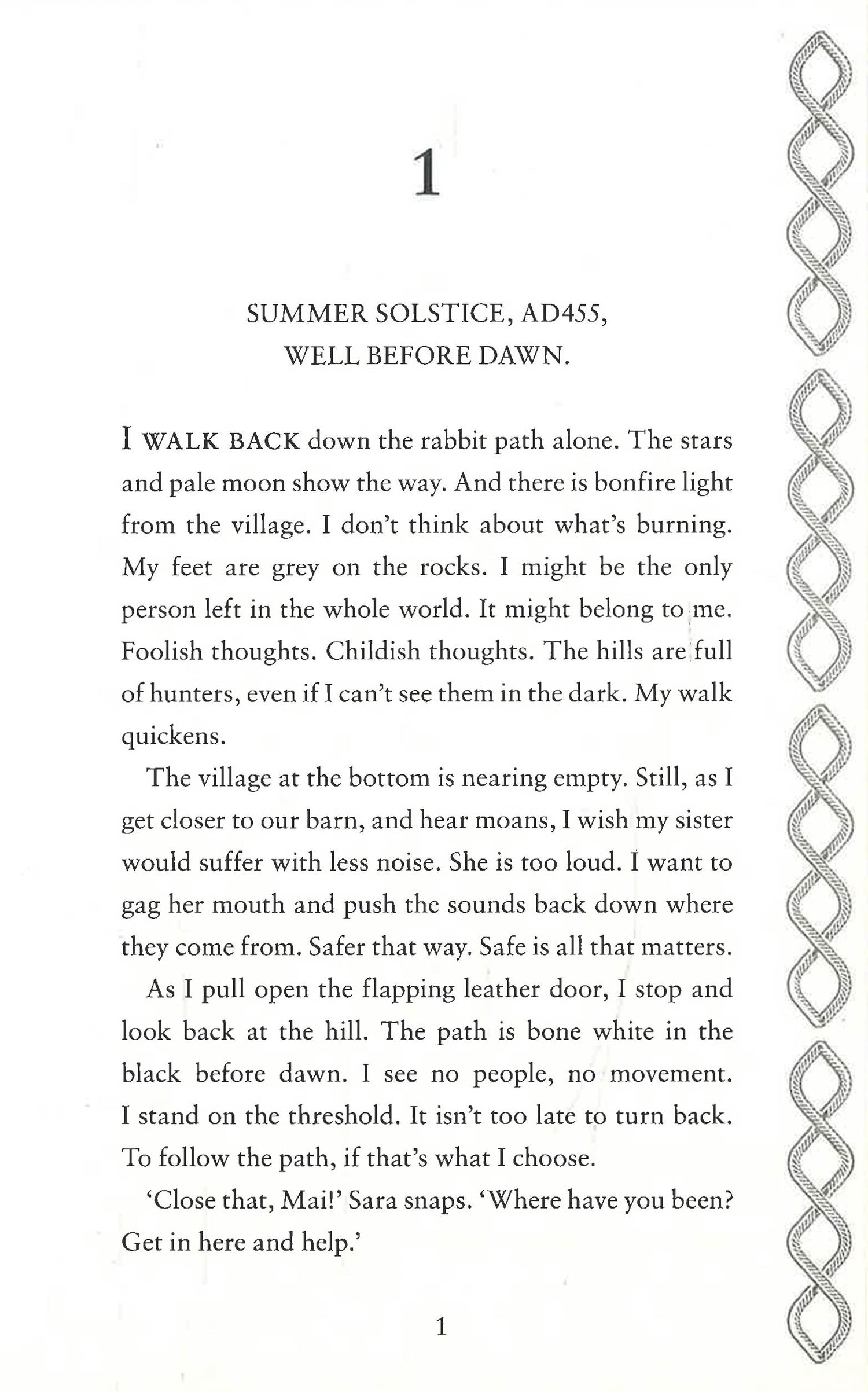 It is the year 454AD. The Roman Empire has withdrawn from Britain, throwing it into the chaos of the Dark Ages. Mai has been kept safe by her father and her sister, Haf. But when Saxon warriors arrive at their farm, the family is forced to flee to the hills where British warlords lie in wait. Can Mai survive in a dangerous world where speaking her mother tongue might be deadly, and where even the people she loves the most can't be trusted?
