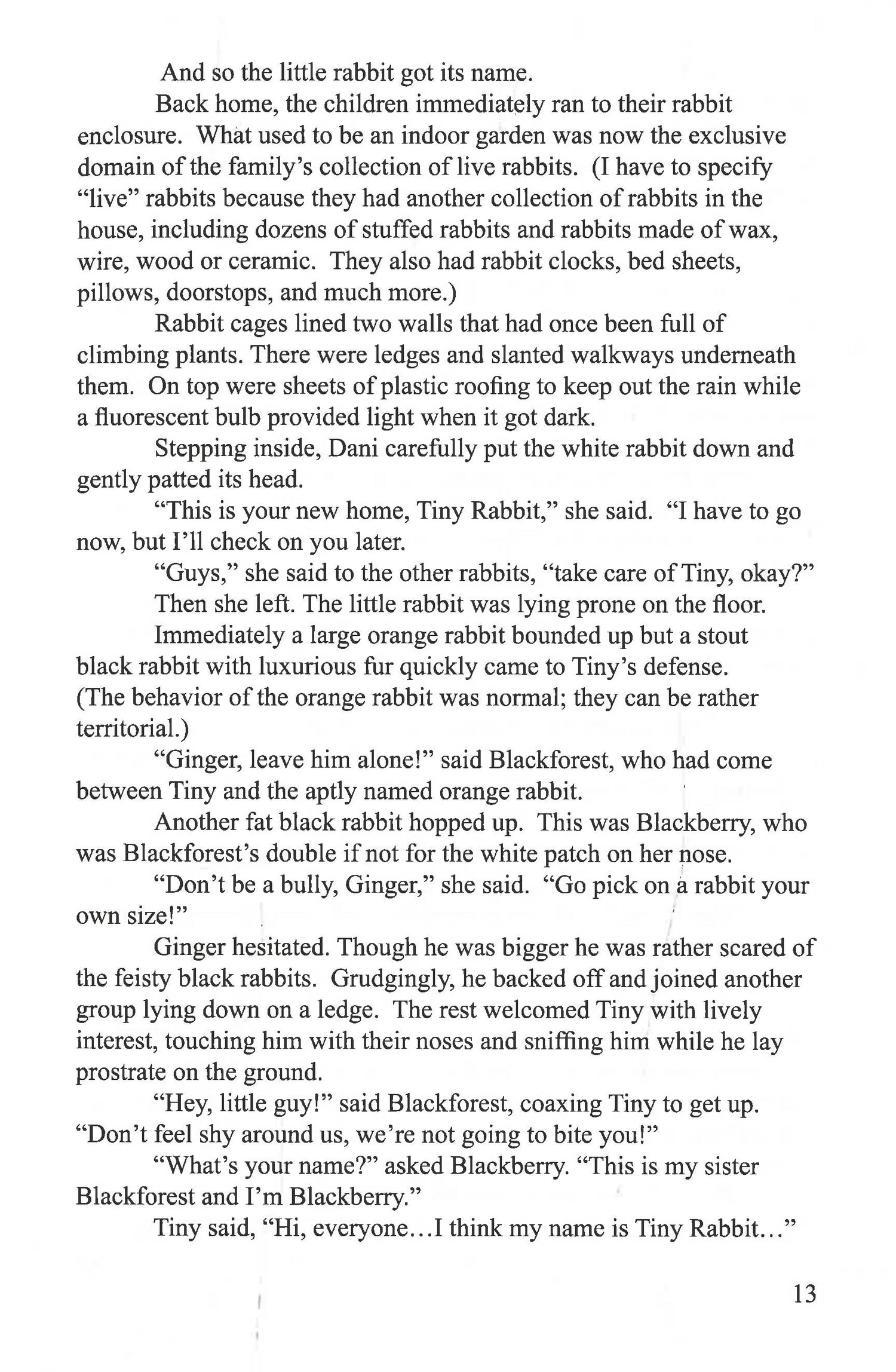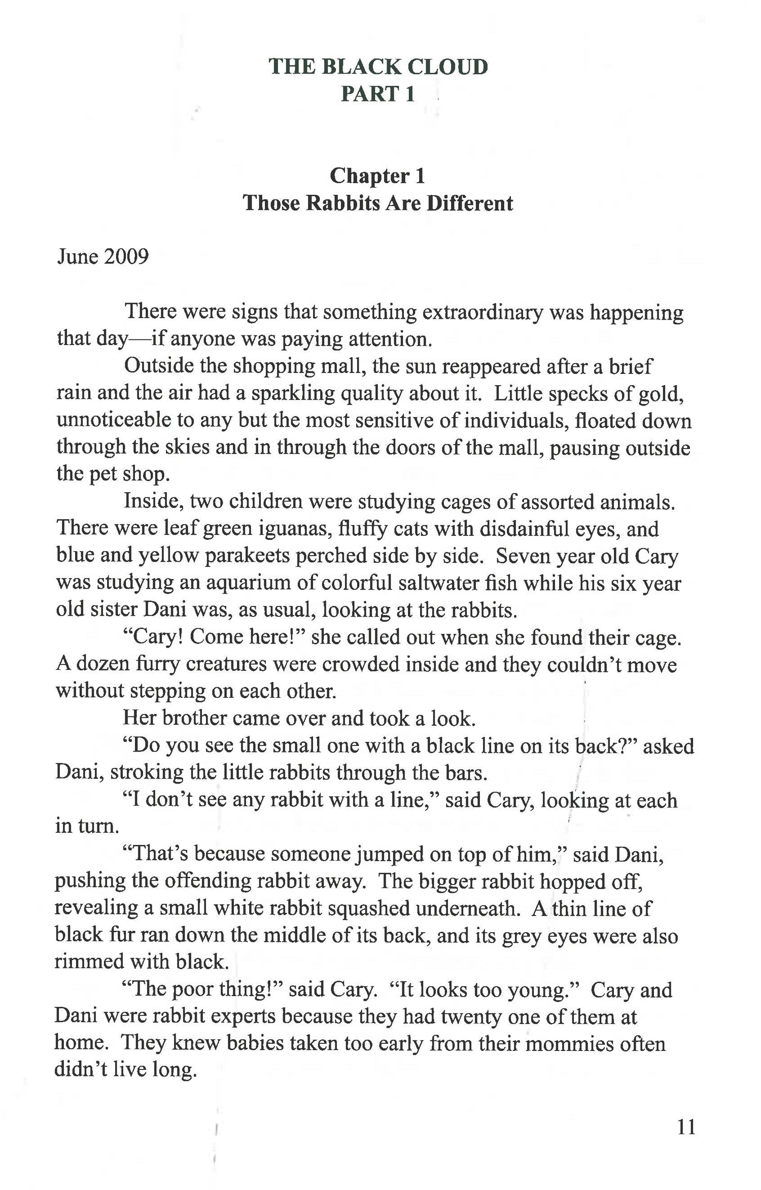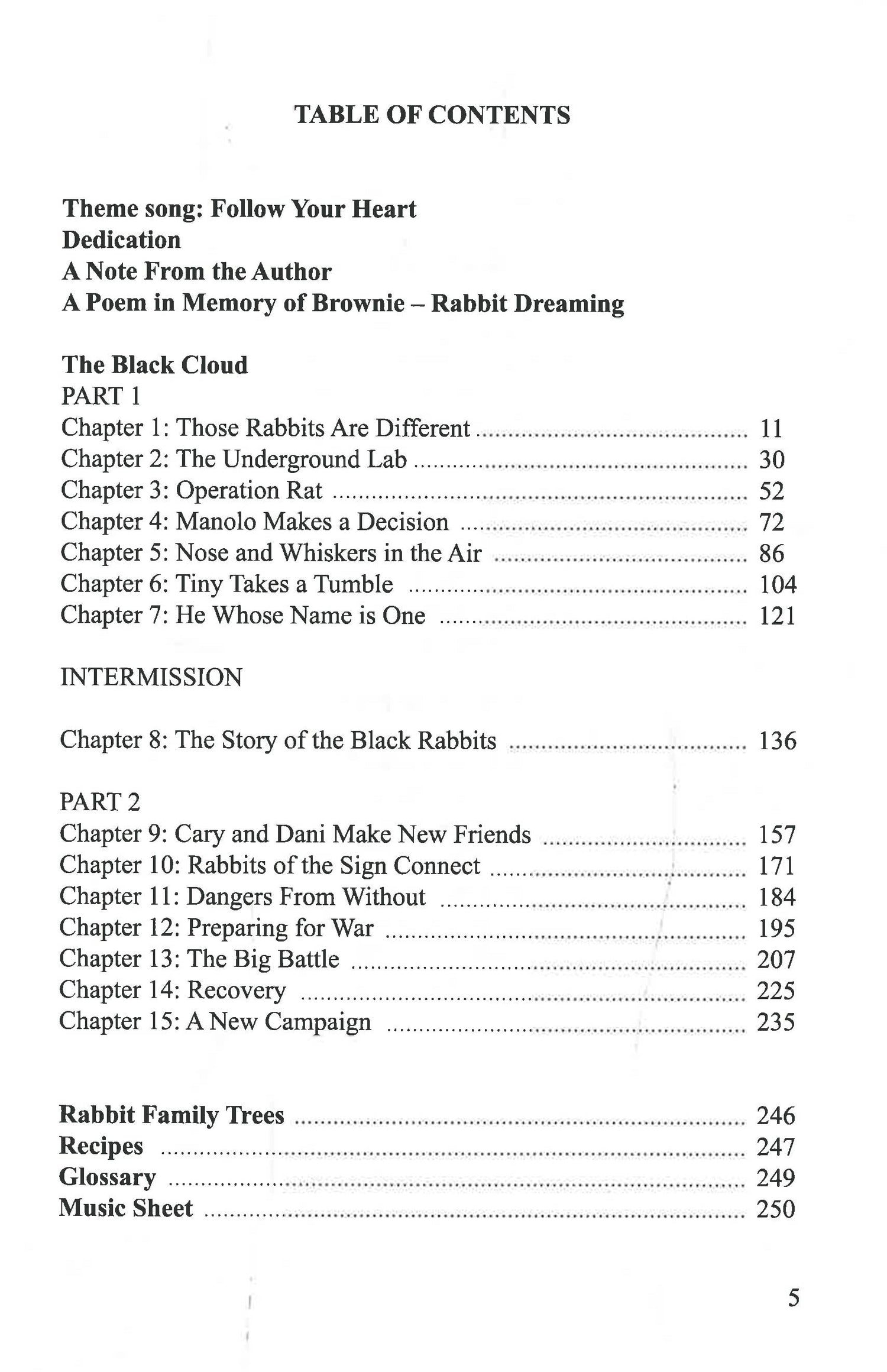 A fantasy science fiction book where the battle between good and evil is played out by rabbits of the Sign versus the death rats. The evil lord through the rats and other vile servants seeks to obliterate mankind while The One, who is the sum of all good in the universe, prevents that through the rabbits and golden spirits. The humans, whom the rabbits are protecting, have no clue as to what their seemingly docile pets are up to.
