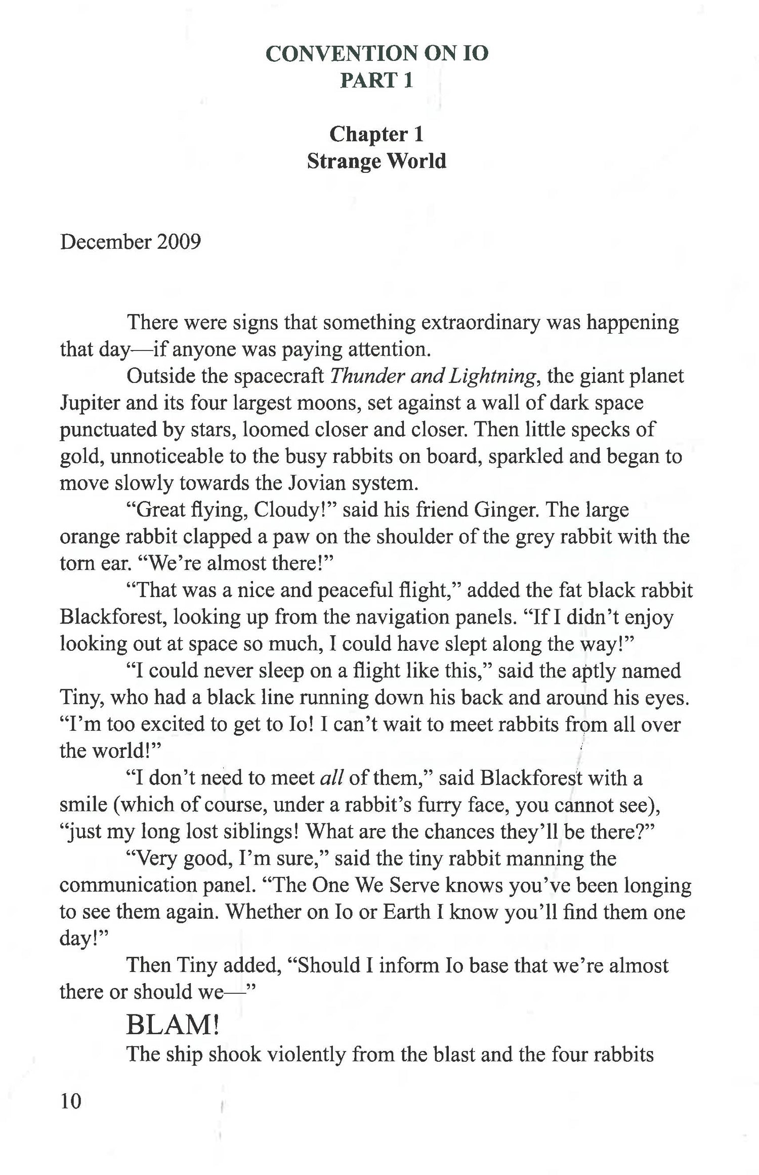 Convention on Io opens with a team of rabbits from Banaba base heading to the strange Jovian moon Io to meet up with rabbits from all over the world. There they will share information and technology as part of their strategies against the rats.