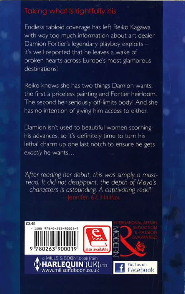 Taking what is rightfully his Endless tabloid coverage has left Reiko Kagawa with way too much information about art dealer Damion Fortier's legendary playboy exploits - it's well reported that he leaves a wake of broken hearts across Europe's most glamorous destinations! Reiko knows she has two things Damion wants: the first a priceless painting and Fortier heirloom. The second her seriously offlimits body! And she has no intention of giving him access to either. Damion isn't used to beautiful women scorning his advances, so it's definitely time to turn his lethal charm up one last notch to ensure he gets exactly he wants...'After reading her debut, this was simply a mustread. It did not disappoint, the depth of Maya's characters is astounding. A captivating read!' - Jennifer, 67, Halifax