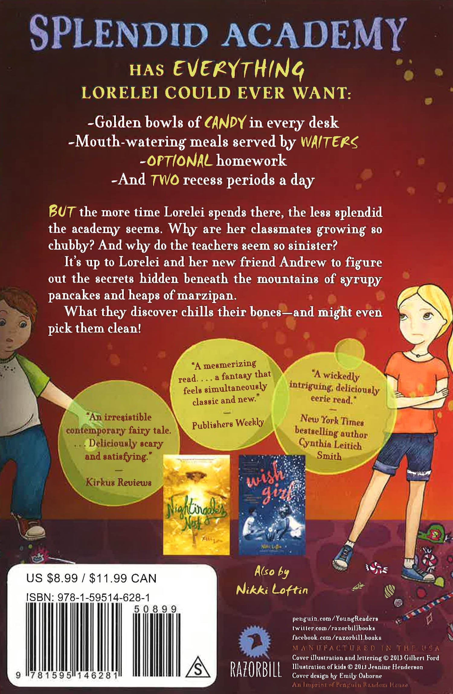 Spooky twists and soaring prose make this foodie update on Hansel and Gretel an unforgettable must-read. Lorelei is bowled over by Splendid Academy--Principal Trapp encourages the students to run in the hallways, the classrooms are stocked with candy dishes, and the cafeteria serves lavish meals featuring all Lorelei's favorite foods. But the more time she spends at school, the more suspicious she becomes. Why are her classmates growing so chubby? And why do the teachers seem so sinister? It's up to Lorelei and her new friend Andrew to figure out what secret this supposedly splendid school is hiding. What they discover chills their bones--and might even pick them clean! Mix one part magic, one part mystery, and just a dash of Grimm, and you've got the recipe for a cozy-creepy read that kids will gobble up like candy. *This book may have remainder mark*