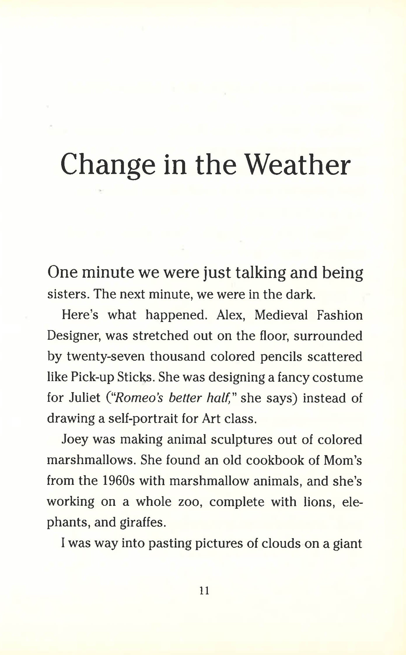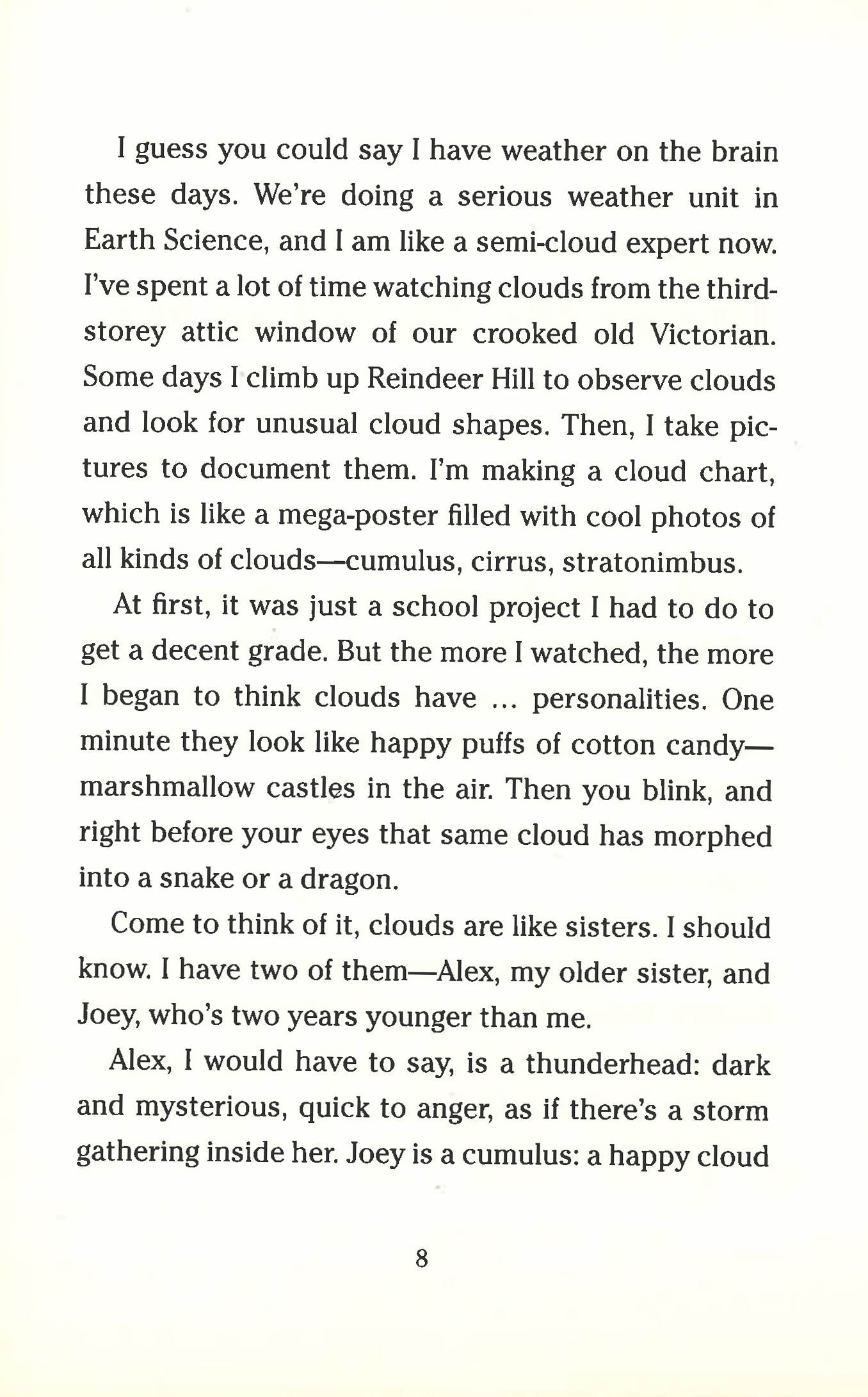 As the middle sister in a family with three girls, Stevie Reel doesn't know much about boys, and that's always been just fine with her. But lately, things have been changing: kids at school are starting to pair up, and Owen, the new boy in her class, seems to have his sights set on Stevie. The trouble is, Stevie doesn't want a boyfriend - she's not even sure that she's ready to have a boy friend. And her sisters are no help: drama-queen Alex is too busy trying to sort out her own love life, while Joey can't understand why anyone would prefer a boy over a frog anyway. If only figuring out boys was as easy as predicting the weather!
