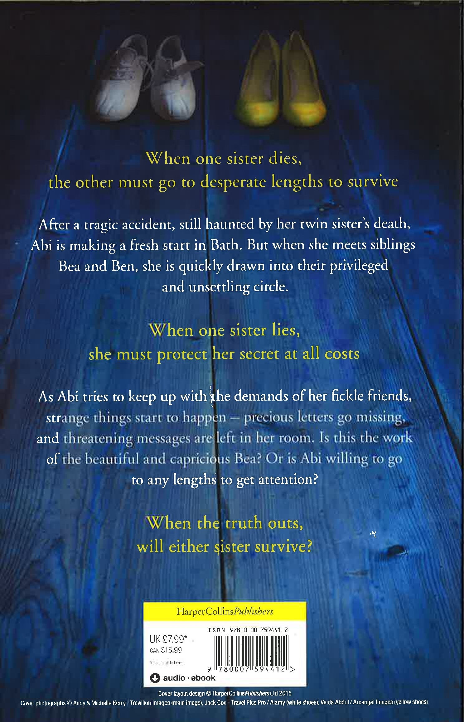 After a tragic accident, still haunted by her twin sister’s death, Abi is making a fresh start in Bath. But when she meets siblings Bea and Ben, she is quickly drawn into their privileged and unsettling circle.As Abi tries to keep up with the demands of her fickle friends, strange things start to happen – precious letters go missing and threatening messages are left in her room. Is this the work of the beautiful and capricious Bea? Or is Abi willing to go to any lengths to get attention?