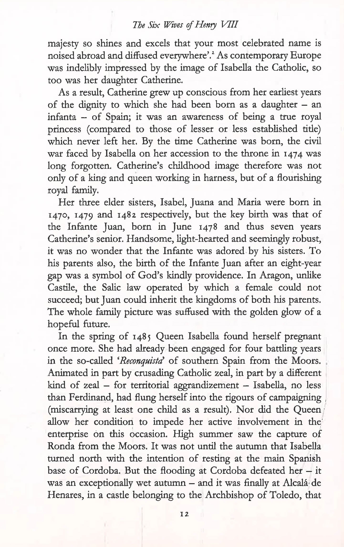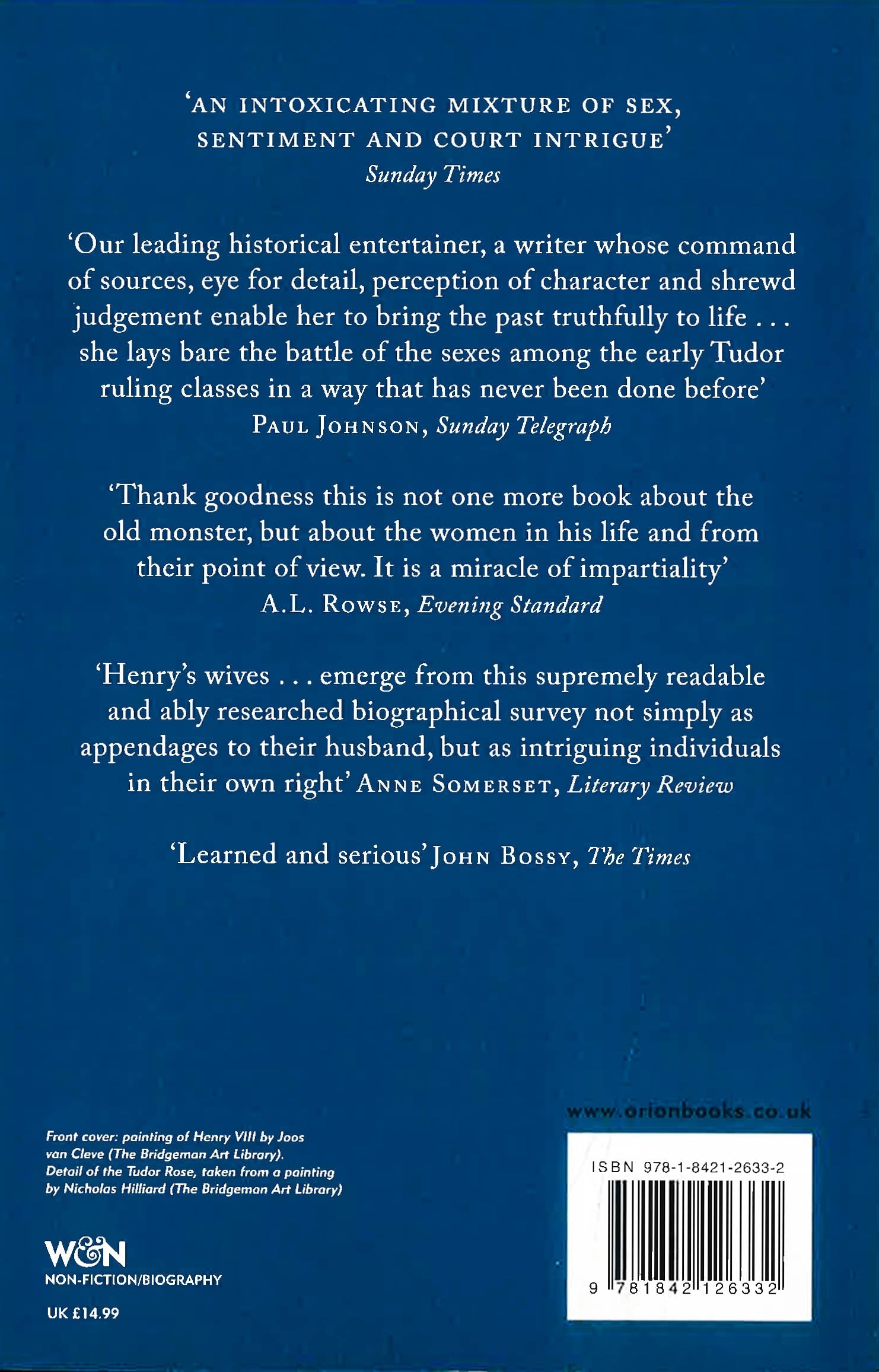 The six wives of Henry VIII- Catherine of Aragon, Anne Boleyn, Jane Seymour, Anna of Cleves, Katherine Howard and catherine Parr- have become defined in popular sense not so much by their lives but by the the way their lives ended. But, as Antonia Fraser conclusively proves, they were rich and feisty characters. They may have been victims of Henry's obsession with a male heir, but they were not willing victims. On the contrary, they displayed considerable strength and intelligence at a time when their sex supposedly possessed little of either. Inevitably there was great rivalry between them, and there was jealousy too- the desperate jealousy of the King who discovered himself betrayed. The story Antonia Fraser tells is romantic and cruel, funny and sad, dramatic and enthralling.