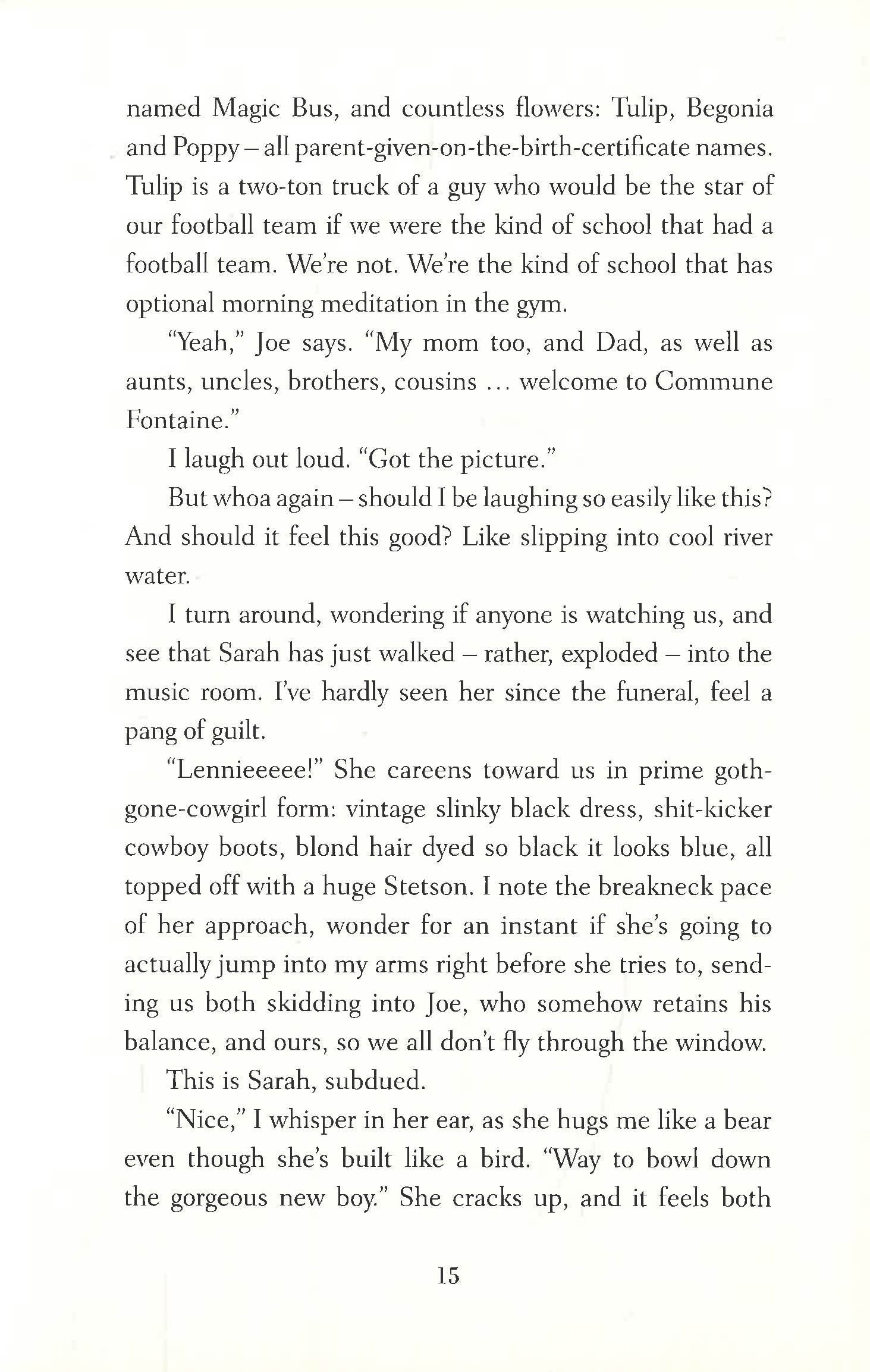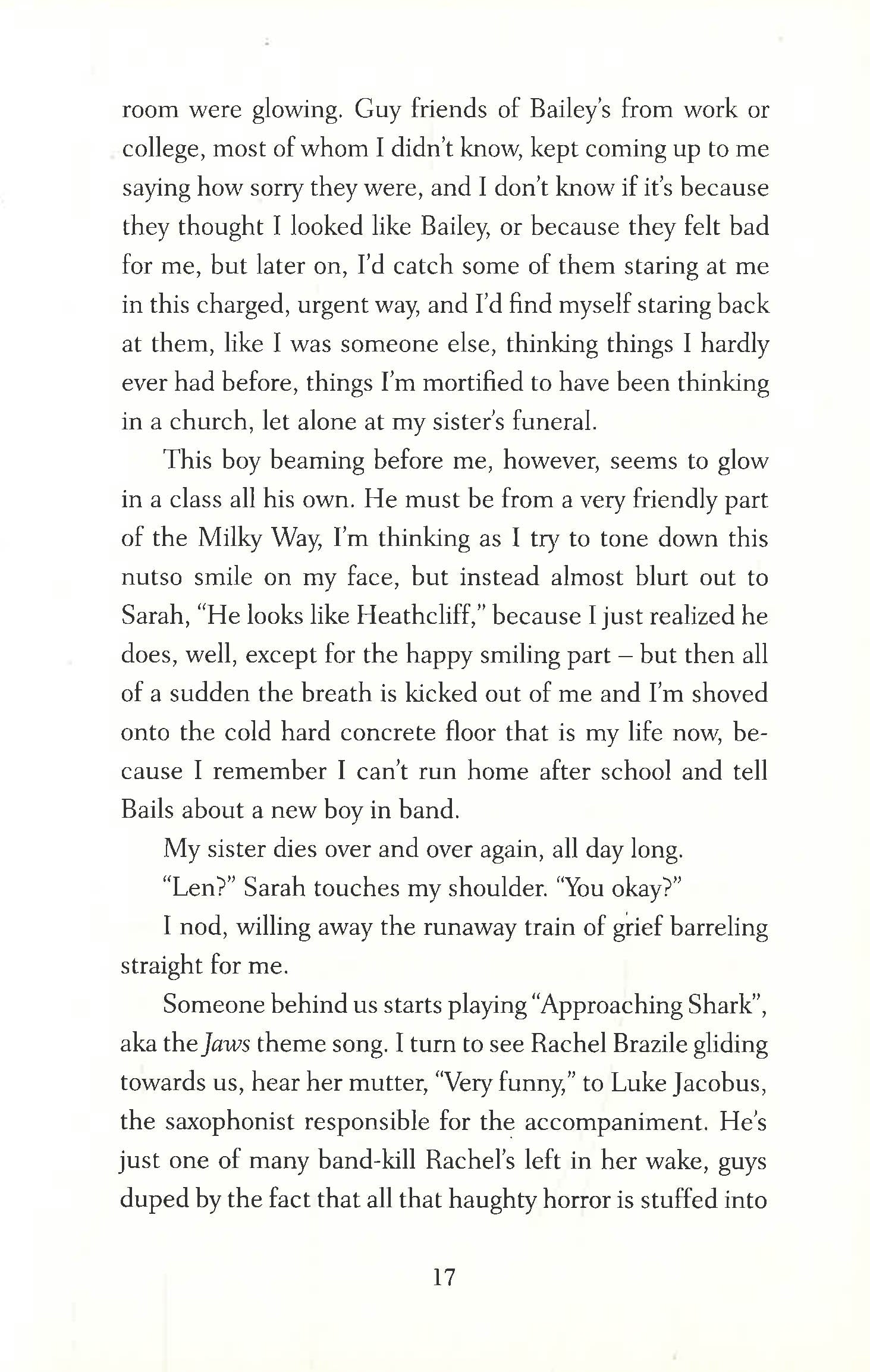 Seventeen-year-old Lennie Walker spends her time tucked safely and happily in the shadow of her fiery older sister, Bailey. But when Bailey dies abruptly, Lennie is catapulted to centre stage of her own life – and suddenly finds herself struggling to balance two boys. One boy takes Lennie out of her sorrow; the other comforts her in it. But the two can't collide without Lennie's world exploding...