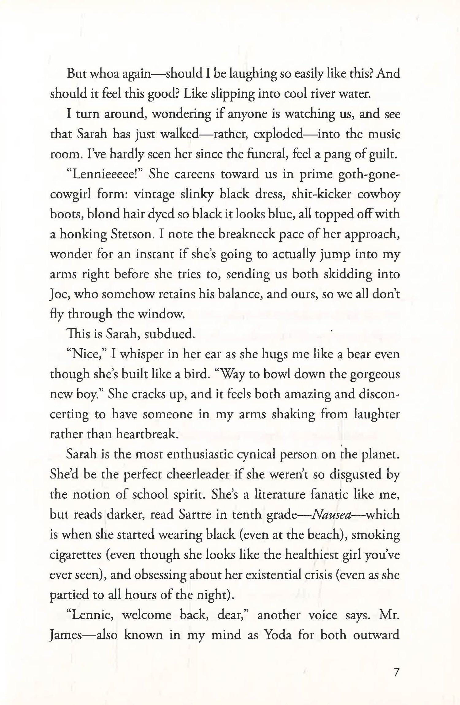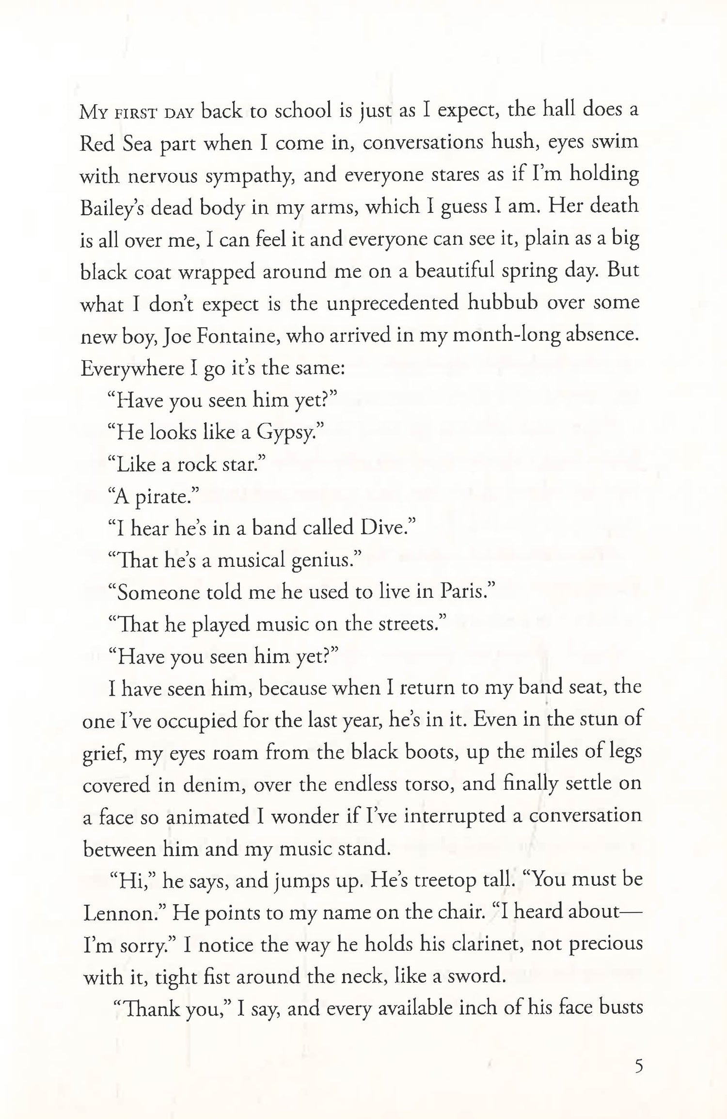 Adrift after her sister Bailey’s sudden death, Lennie finds herself torn between quiet, seductive Toby—Bailey’s boyfriend who shares Lennie's grief—and Joe, the new boy in town who bursts with life and musical genius. Each offers Lennie something she desperately needs. One boy helps her remember. The other lets her forget. And she knows if the two of them collide, her whole world will explode.