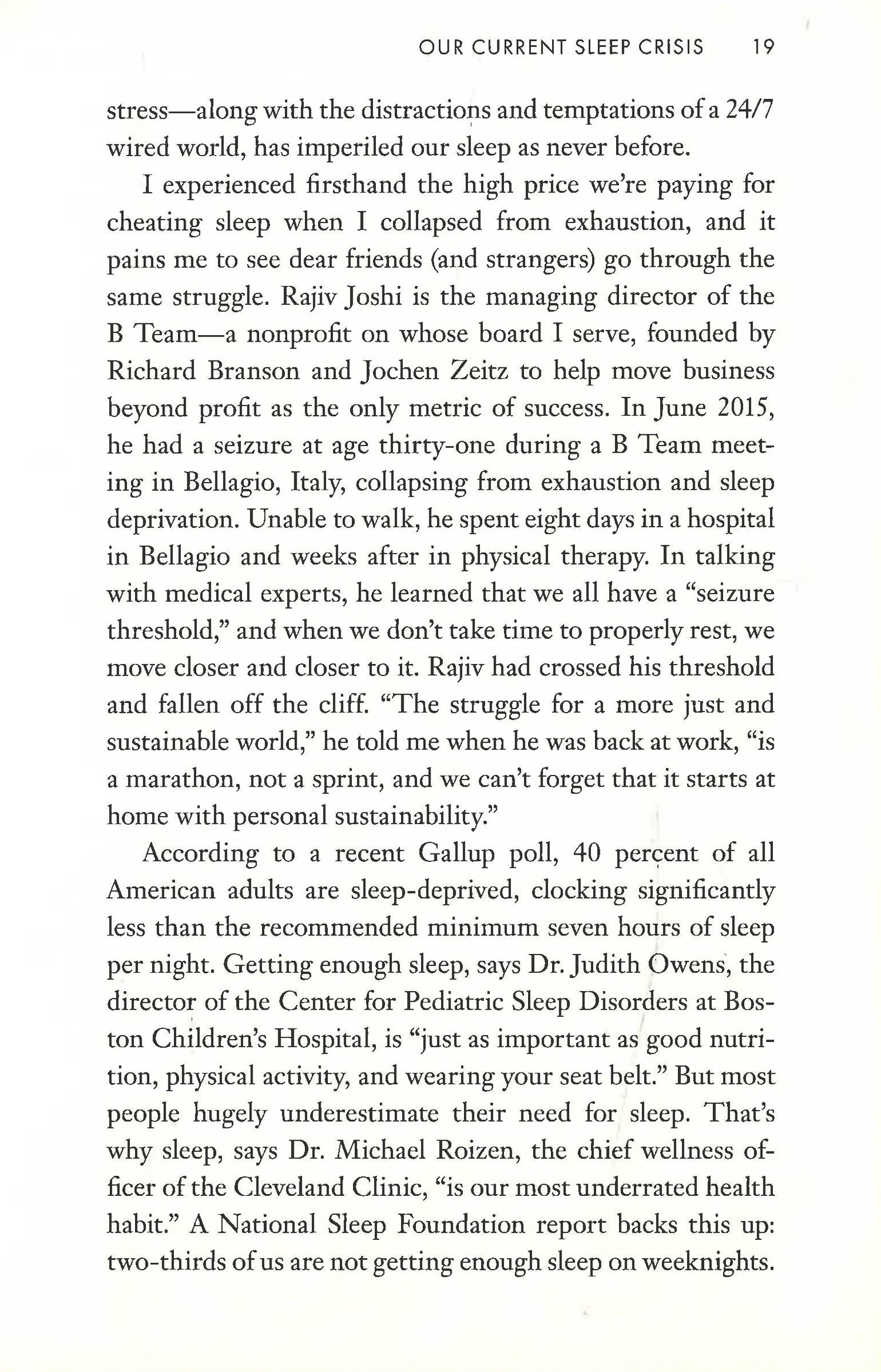 Co-founder and editor in chief of The Huffington Post Arianna Huffington shows how our cultural dismissal of sleep as time wasted compromises our health and our decision-making and undermines our work lives, our personal lives--and even our sex lives in this New York Times bestseller. We are in the midst of a sleep deprivation crisis, with profound consequences to our health, our job performance, our relationships and our happiness. What we need is nothing short of a sleep revolution: only by renewing our relationship with sleep can we take back control of our lives. In The Sleep Revolution, Arianna explores all the latest science on what exactly is going on while we sleep and dream. She takes on the sleeping pill industry, and all the ways our addiction to technology disrupts our sleep. She also offers a range of recommendations and tips from leading scientists on how we can get better and more restorative sleep, and harness its incredible power. The result is a sweeping, scientifically rigorous, and deeply personal exploration of sleep from all angles, from the history of sleep, to the role of dreams in our lives, to the consequences of sleep deprivation, and the new golden age of sleep science that reveals the vital role sleep plays in our every waking moment and every aspect of our health--from weight gain, diabetes, and heart disease to cancer and Alzheimer's. In today's fast-paced, always-connected, perpetually-harried and sleep-deprived world, our need for a good night's sleep is more important--and elusive--than ever. The Sleep Revolution both sounds the alarm on our worldwide sleep crisis and provides a detailed road map to the great sleep awakening that can help transform our lives, our communities, and our world.