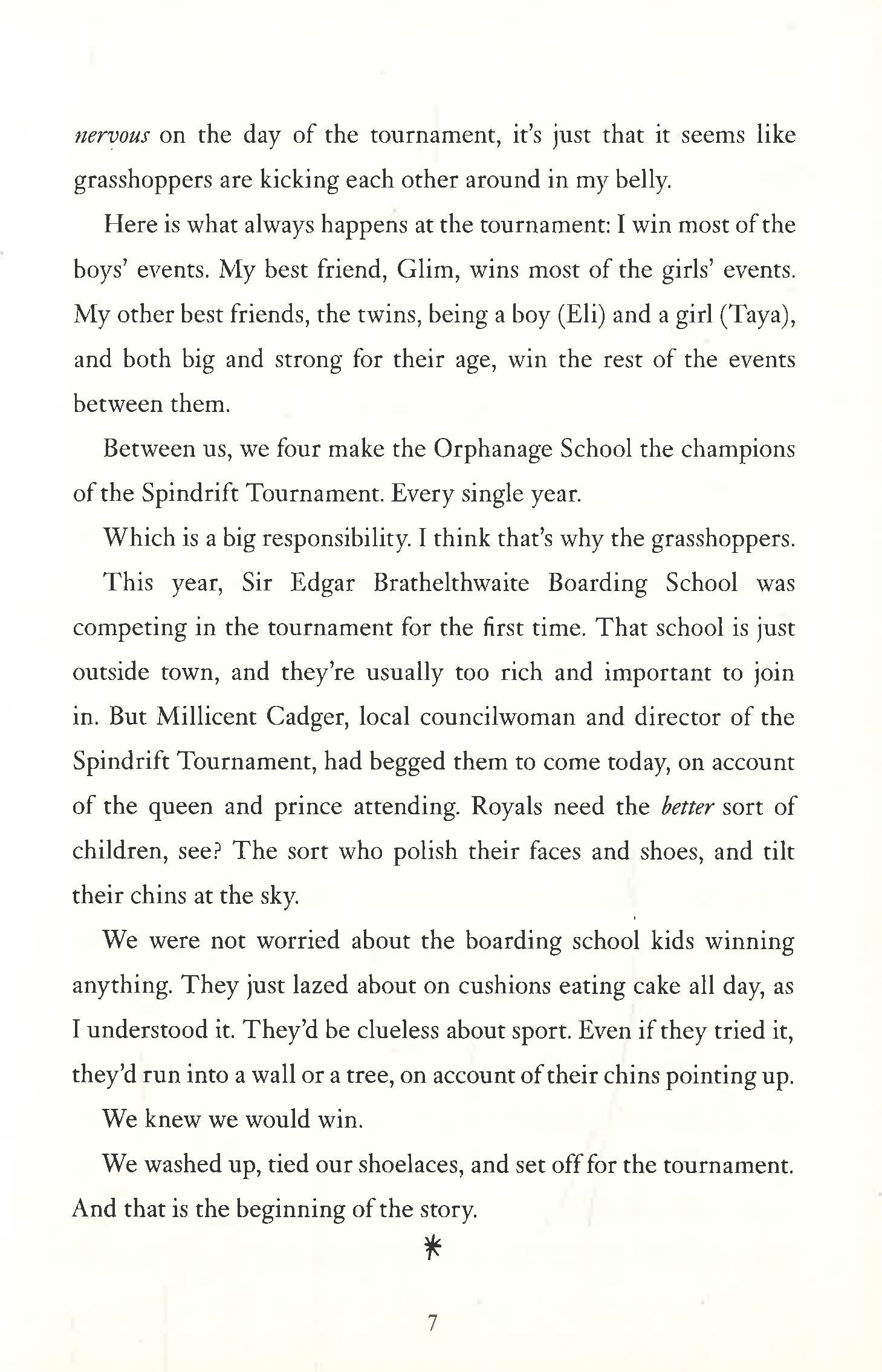 The town of Spindrift is frequented by pirates, Shadow Mages and charlatans. It's also home to the Orphanage School, where Finlay lives with Glim, Taya and Eli. Just outside town is the painfully posh Brathelthwaite Boarding School, home to Honey Bee, Hamish and Victor, Duke of Ainsley. When the two schools compete at the Spindrift Tournament, stakes are high, tensions are higher, and some people are out to win at any cost. Before long, the orphans and the boarding school are in an all-out war.