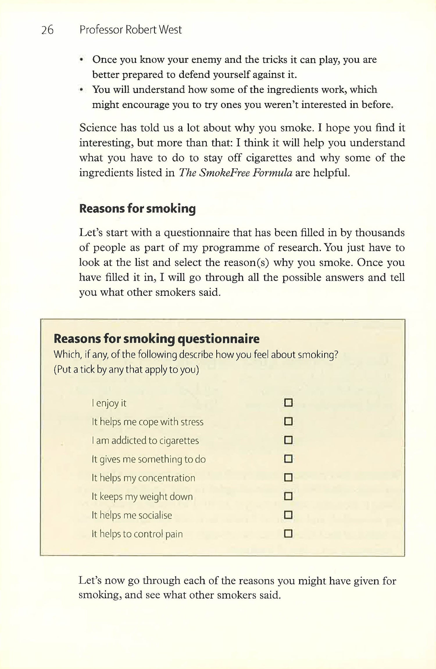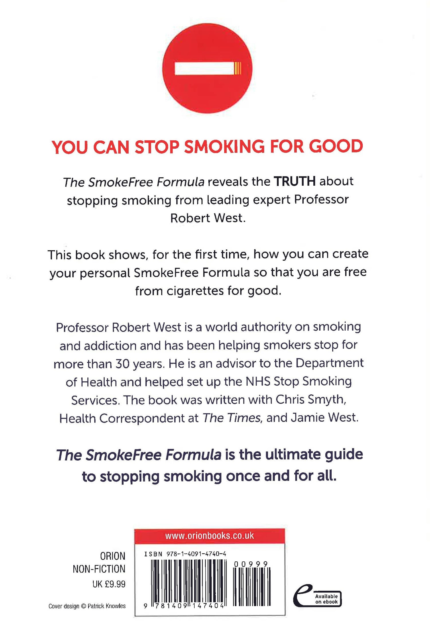 YOU CAN STOP SMOKING FOR GOOD. The SmokeFree Formula reveals the TRUTH about stopping smoking from leading expert Professor Robert West. This book shows, for the first time, how you can create your personal SmokeFree Formula so that you are free from cigarettes for good. Professor Robert West is a world authority on smoking and addiction and has been helping smokers stop for more than 30 years. He is an advisor to the Department of Health and helped set up the NHS Stop Smoking Services. The book was written with Chris Smyth, Health Correspondent at The Times, and Jamie West. The SmokeFree Formula is the ultimate guide to stopping smoking once and for all.