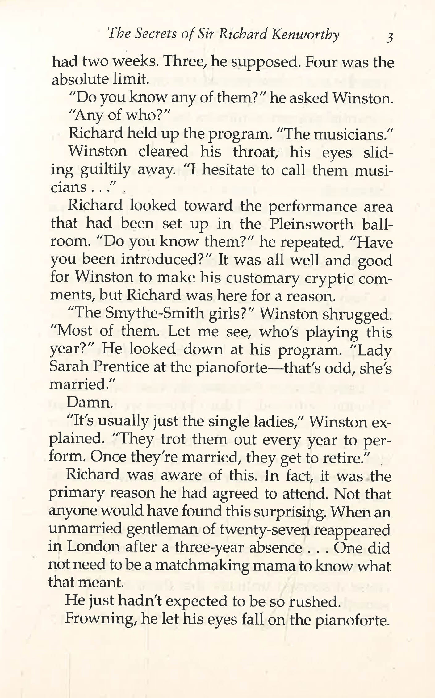 Iris Smythe-Smith is used to being underestimated. With her pale hair and quiet, sly wit she tends to blend into the background, and she likes it that way. So when Richard Kenworthy demands an introduction, she is suspicious. He flirts, he charms, he gives every impression of a man falling in love, but she can't quite believe it's all true. When when he proposes, she feels certain that he's hiding something . . . even as her heart tells her to say yes.