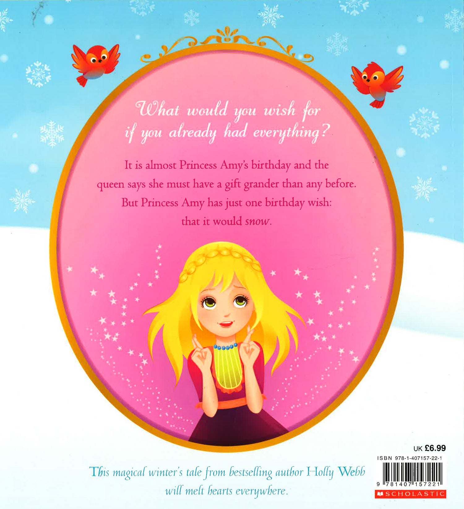 An enchanting new picture book from bestselling author Holly Webb. What would you wish for if you already had everything? As Princess Amy nears her tenth birthday, the queen says she must have a gift grander than any before. No one in the palace talks about anything but cakes and dresses and presents. But Princess Amy has just one birthday wish: that it would snow. All she wants is to spend the day building snowmen with her best friend, Bella. This tale of friendship and sharing will melt hearts everywhere. A magical picture book with a sparkly glittery cover!