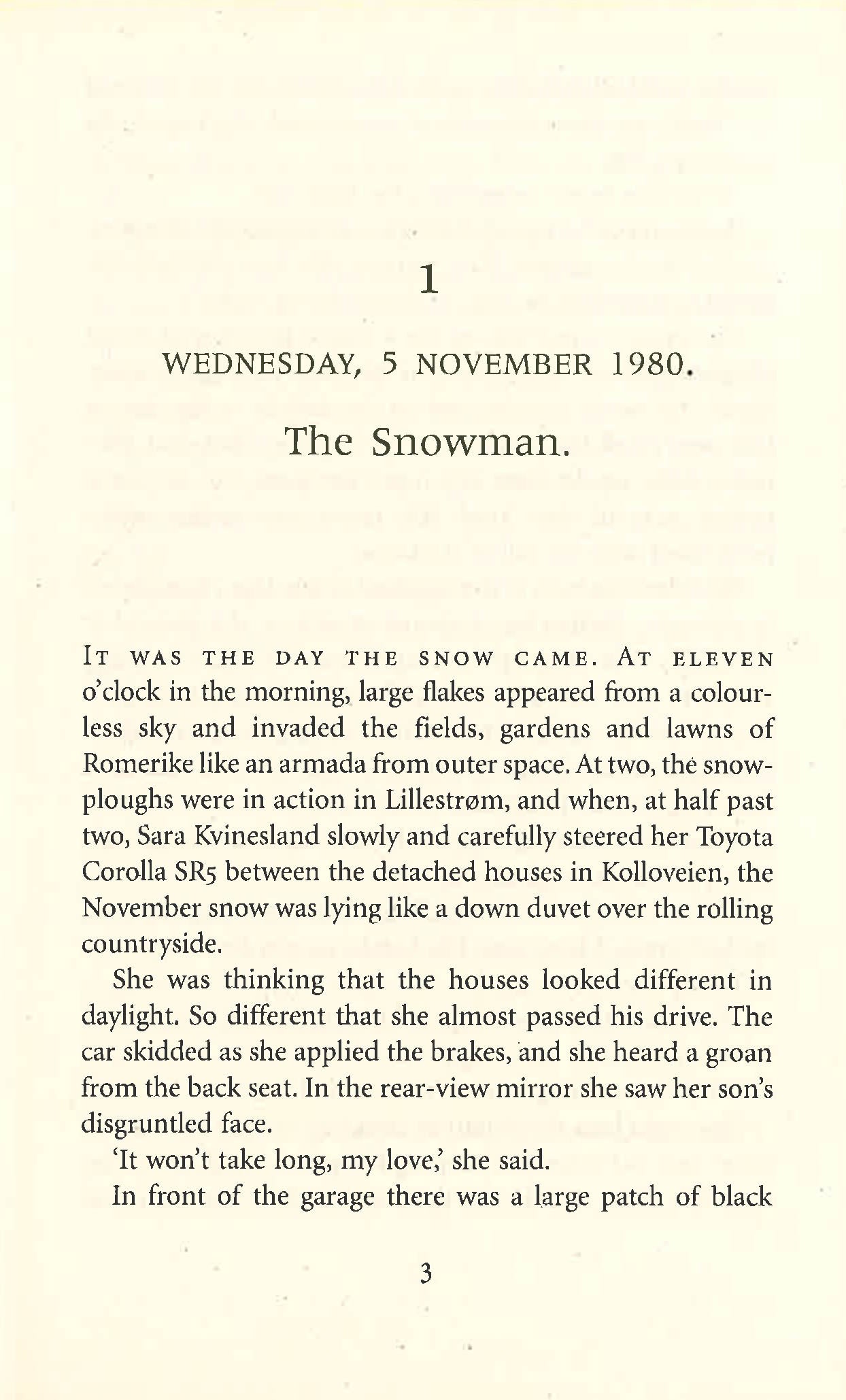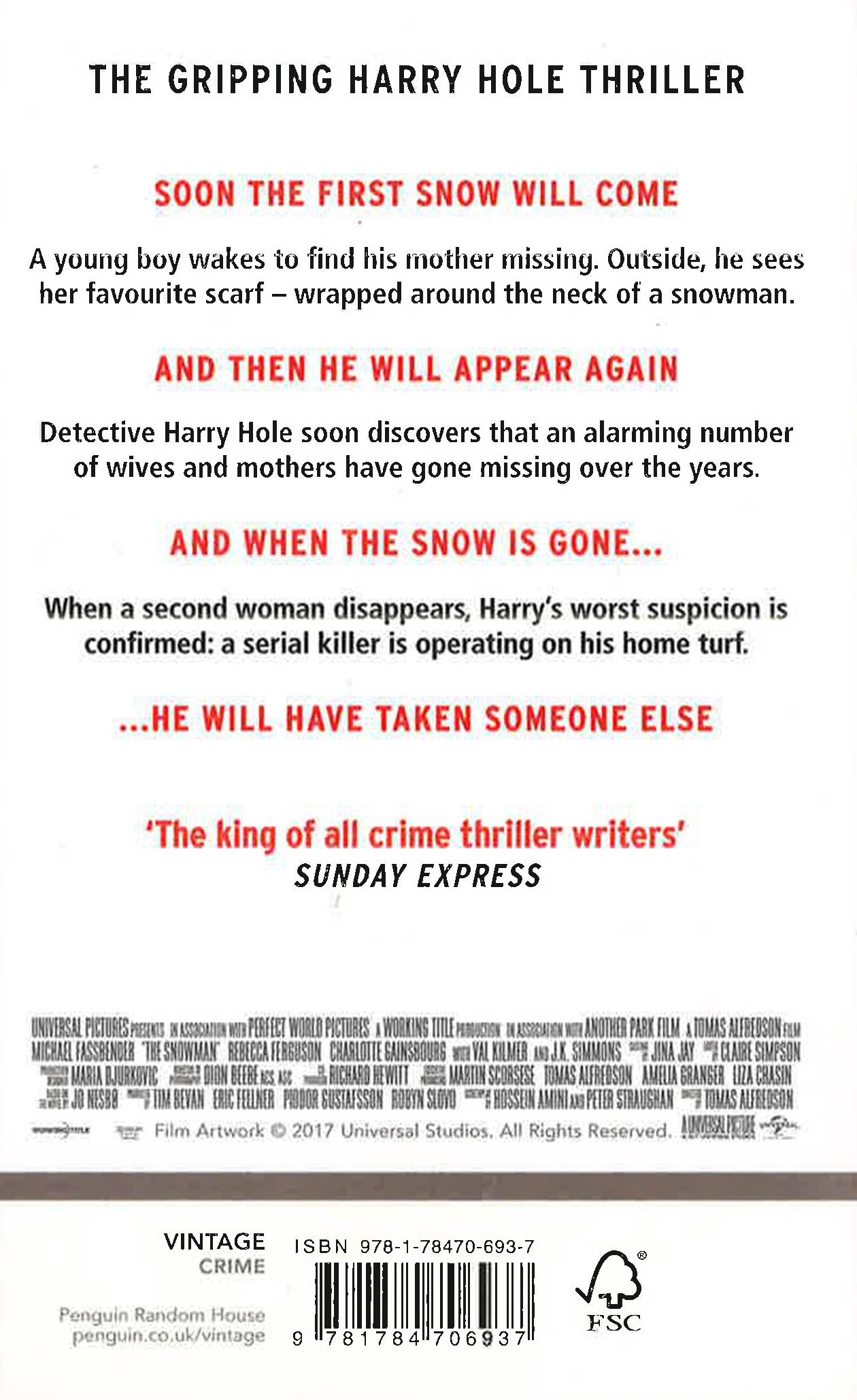 Soon the first snow will come. A young boy wakes to find his mother missing. Outside, he sees her favourite scarf - wrapped around the neck of a snowman. And then he will appear again Detective Harry Hole soon discovers that an alarming number of wives and mothers have gone missing over the years. And when the snow is gone... When a second woman disappears, Harry's worst suspicion is confirmed: a serial killer is operating on his home turf. ...he will have taken someone else.