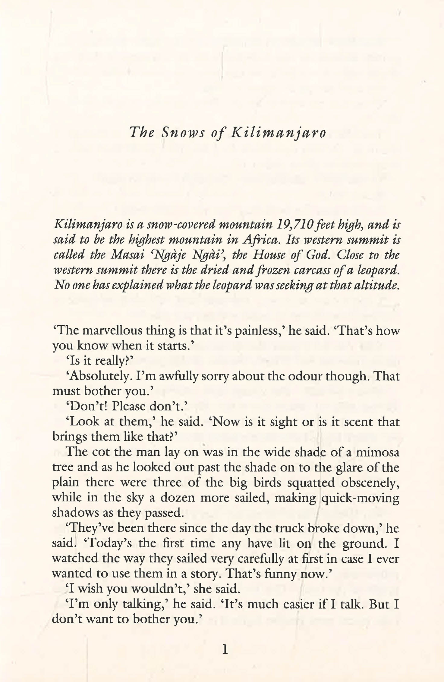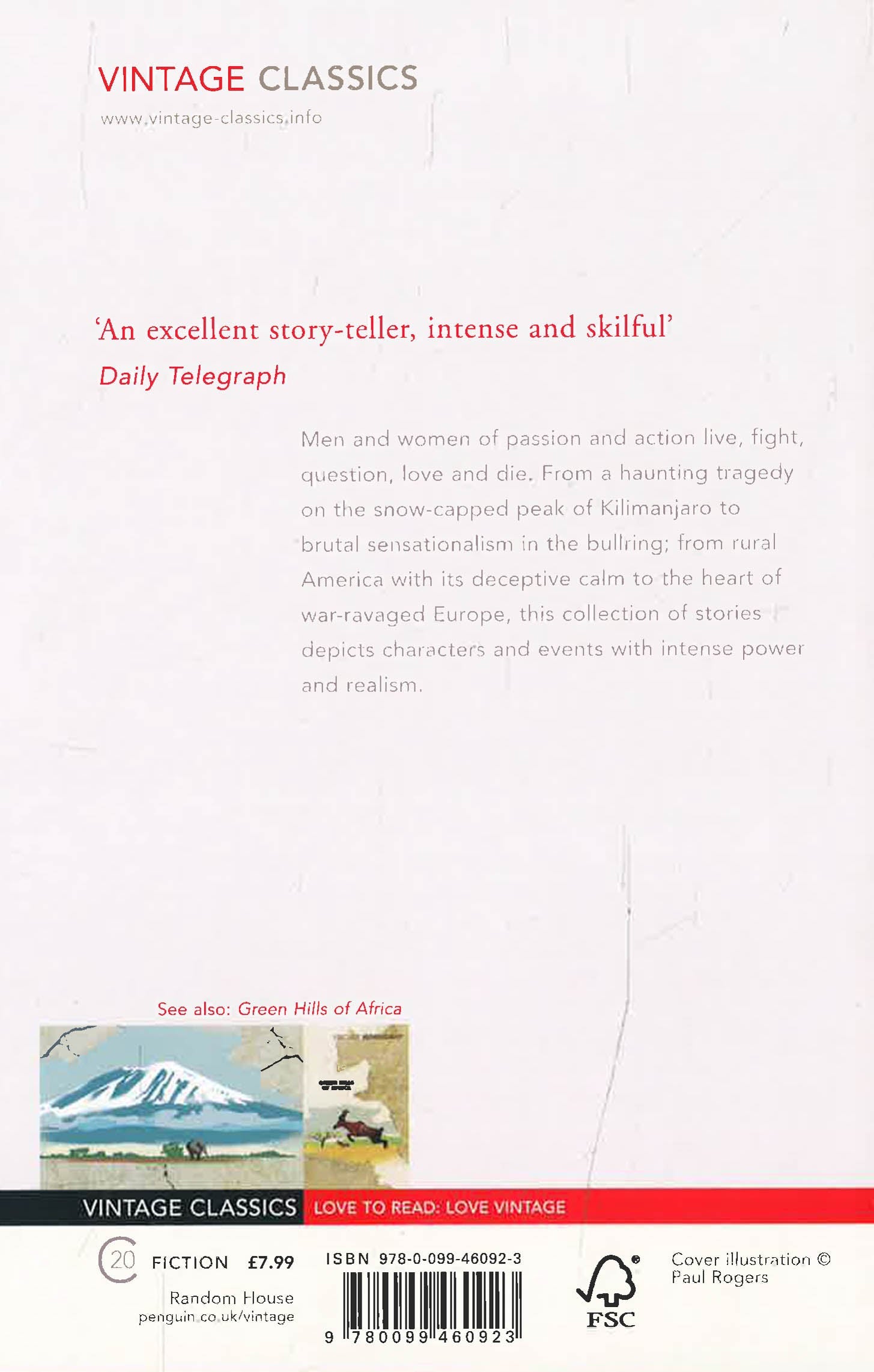 In these early Hemingway stories, which are partly autobiographical, men and women of passion live, fight, love and die in scenes of dramatic intensity. They range from haunting tragedy on the snow-capped peak of Kilimanjaro, to brutal America with its deceptive calm, and war-ravaged Europe.