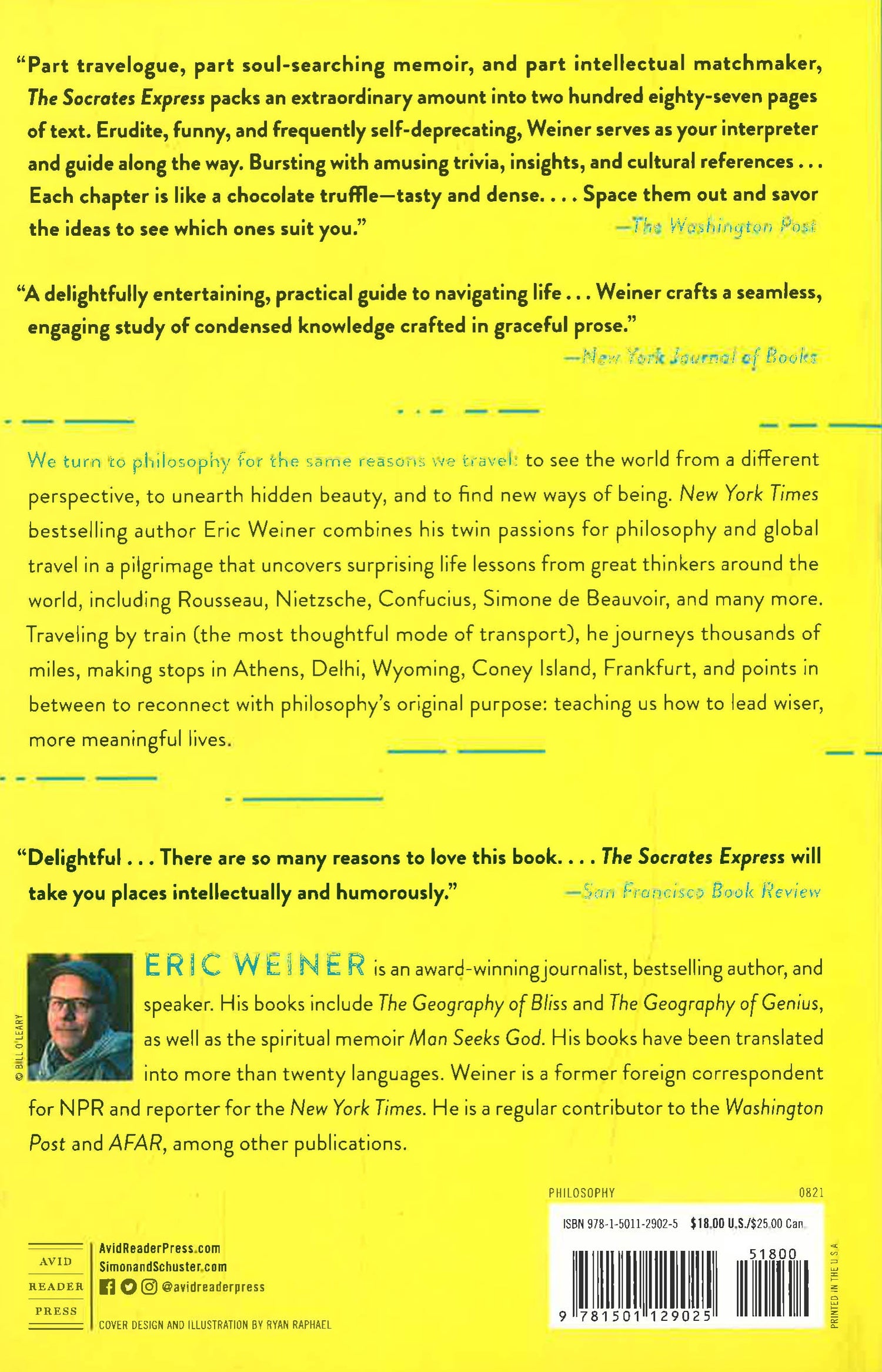 Eric Weiner combines his twin passions for philosophy and travel in a globe-trotting pilgrimage that uncovers surprising life lessons from great thinkers around the world, from Rousseau to Nietzsche, Confucius to Simone Weil. Traveling by train (the most thoughtful mode of transport), he journeys thousands of miles, making stops in Athens, Delhi, Wyoming, Coney Island, Frankfurt, and points in between to reconnect with philosophy’s original purpose: teaching us how to lead wiser, more meaningful lives. From Socrates and ancient Athens to Beauvoir and 20th-century Paris, Weiner’s chosen philosophers and places provide important practical and spiritual lessons as we navigate today’s chaotic times.