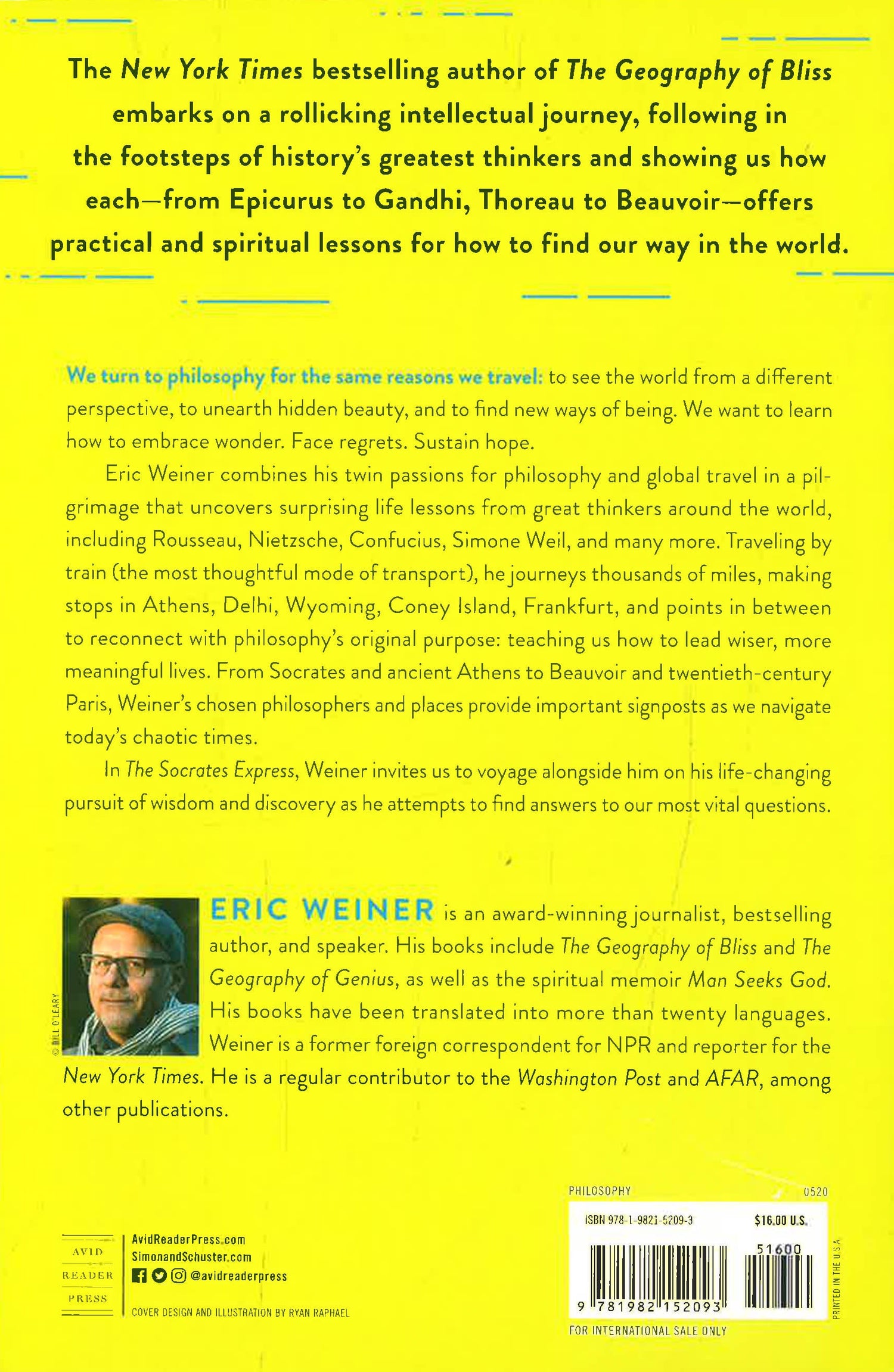 Eric Weiner combines his twin passions for philosophy and global travel in a pilgrimage that uncovers surprising life lessons from great thinkers around the world, from Rousseau to Nietzsche, Confucius to Simone Weil. Traveling by train (the most thoughtful mode of transport), he journeys thousands of miles, making stops in Athens, Delhi, Wyoming, Coney Island, Frankfurt, and points in between to reconnect with philosophy’s original purpose: teaching us how to lead wiser, more meaningful lives. From Socrates and ancient Athens to Simone de Beauvoir and twentieth-century Paris, Weiner’s chosen philosophers and places provide important signposts as we navigate today’s chaotic times.