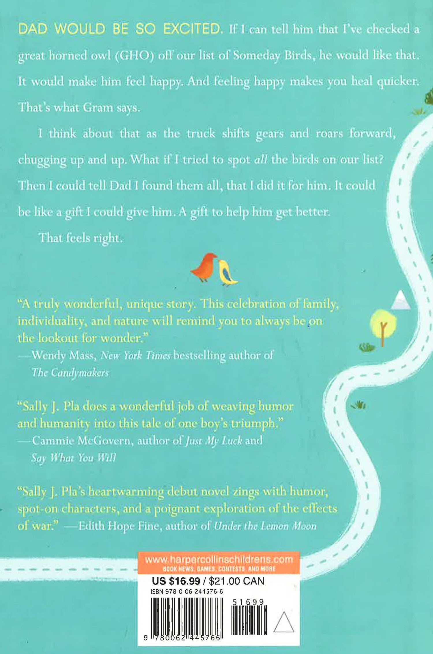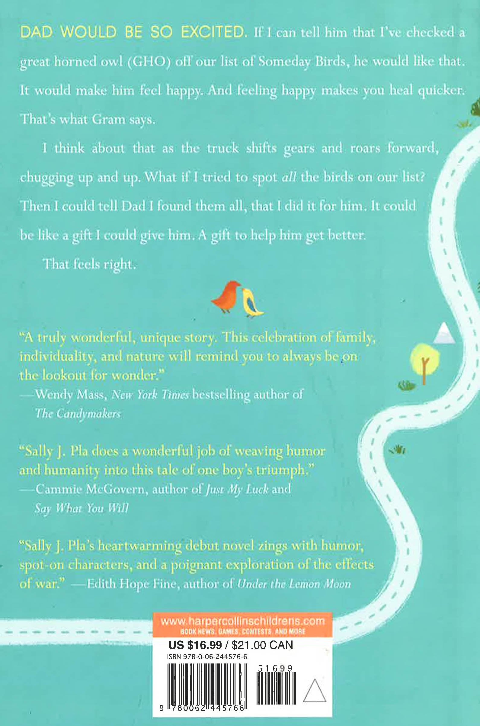 The Someday Birds is a debut middle grade novel perfect for fans of Counting by 7s and Fish in a Tree, filled with humor, heart, and chicken nuggets. Charlie's perfectly ordinary life has been unraveling ever since his war journalist father was injured in Afghanistan. When his father heads from California to Virginia for medical treatment, Charlie reluctantly travels cross-country with his boy-crazy sister, unruly brothers, and a mysterious new family friend. He decides that if he can spot all the birds that he and his father were hoping to see someday along the way, then everything might just turn out okay. Debut author Sally J. Pla has written a tale that is equal parts madcap road trip, coming-of-age story for a boy who feels he doesn't understand the world, and an uplifting portrait of a family overcoming a crisis.