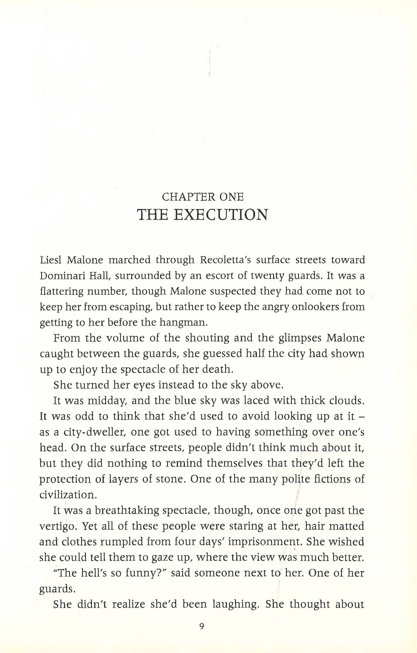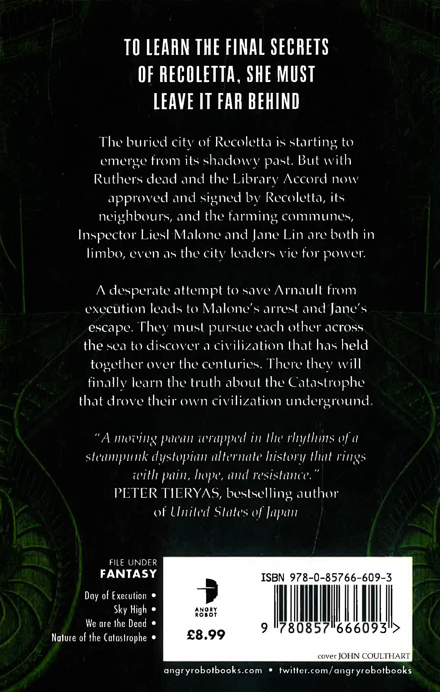 With Ruthers dead and the Library Accord signed by Recoletta, its neighbours, and its farming communes, Inspector Malone and laundress Jane Lin are in limbo as the city leaders around them vie for power.A desperate attempt to save Arnault from execution leads to Malone's arrest and Jane's escape. They must pursue each other across the sea to discover a civilization that has held together over the centuries. There they will finally learn the truths about the Catastrophe that drove their own civilization underground.File Under: Fantasy [ Day of Execution | Sky High | We are the Dead | Nature of the Catastrophe ]
