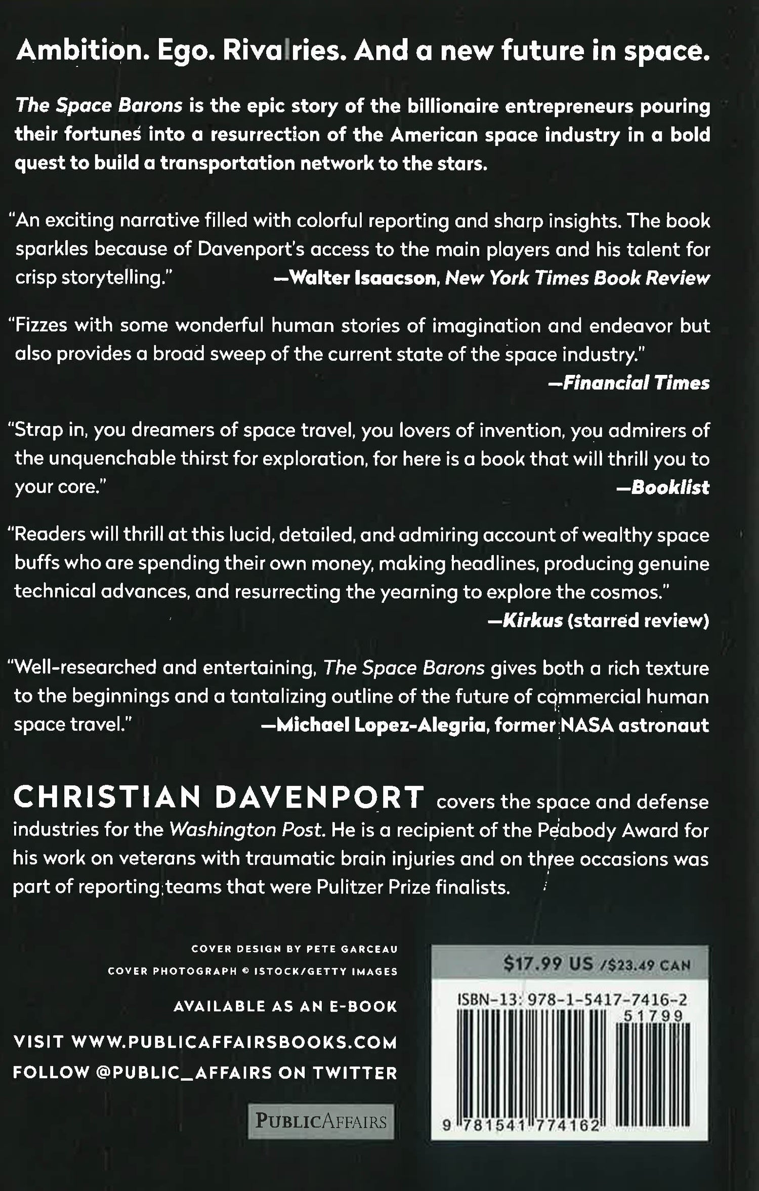 The Space Barons is the story of a group of billionaire entrepreneurs who are pouring their fortunes into the epic resurrection of the American space program. Nearly a half-century after Neil Armstrong walked on the moon, these Space Barons-most notably Elon Musk and Jeff Bezos, along with Richard Branson and Paul Allen-are using Silicon Valley-style innovation to dramatically lower the cost of space travel, and send humans even further than NASA has gone. These entrepreneurs have founded some of the biggest brands in the world-Amazon, Microsoft, Virgin, Tesla, PayPal-and upended industry after industry. Now they are pursuing the biggest disruption of all: space.Based on years of reporting and exclusive interviews with all four billionaires, this authoritative account is a dramatic tale of risk and high adventure, the birth of a new Space Age, fueled by some of the world's richest men as they struggle to end governments' monopoly on the cosmos. The Space Barons is also a story of rivalry-hard-charging startups warring with established contractors, and the personal clashes of the leaders of this new space movement, particularly Musk and Bezos, as they aim for the moon and Mars and beyond.