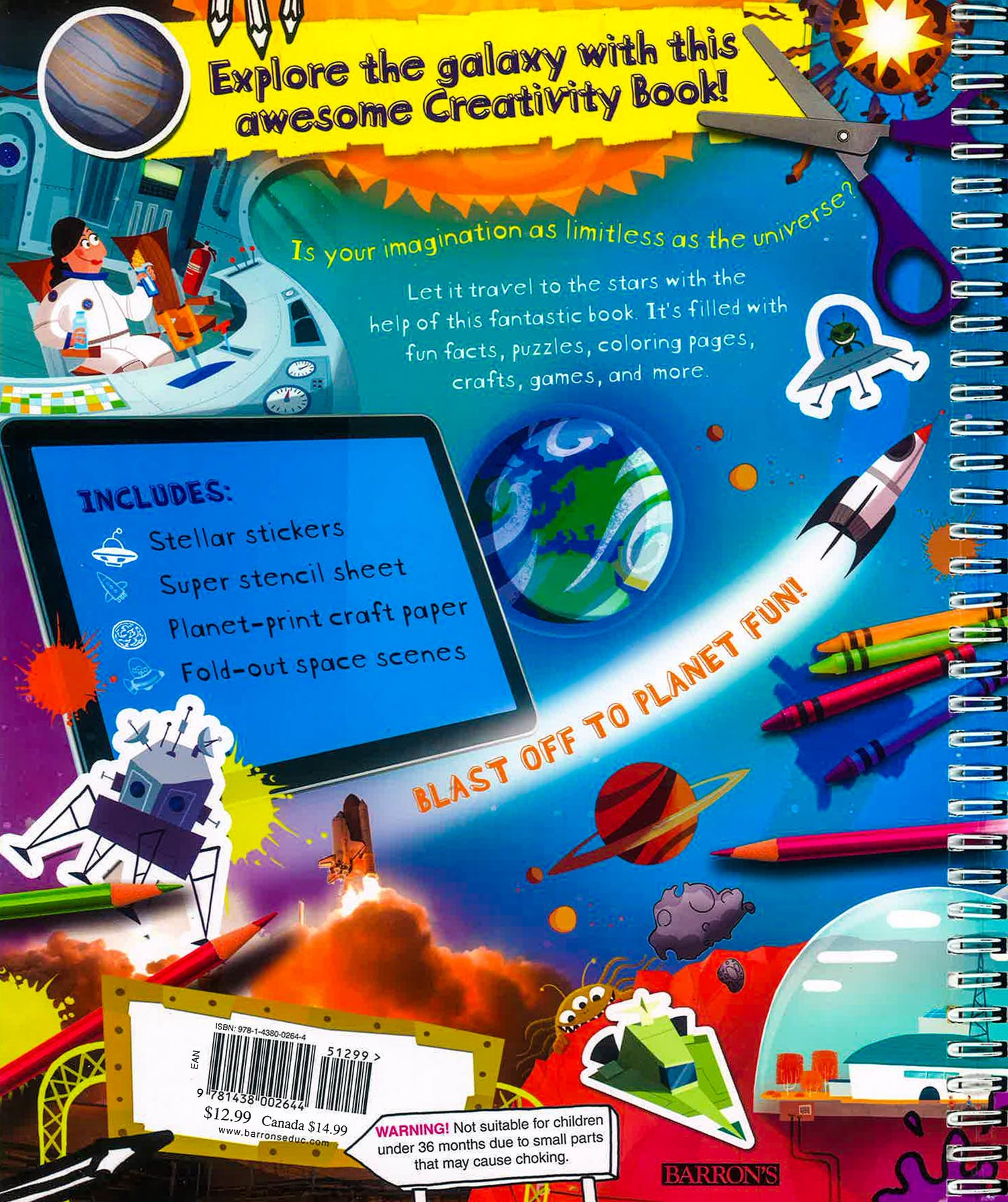 Kids can draw their own pictures of visitors from other planets, use stencils to make rocket ships, make a time capsule, test their knowledge with an outer space quiz, color in the Big Bang, create extra-terrestrial sticker scenes on gatefold illustrations, and much more. This title in Barron's growing list of "Creativity Books" is filled with fun projects to keep kids cheerfully occupied on rainy days, on lengthy car trips, or during quiet time at home. Its features include-- Games, puzzles, stencils, sticker sheets, and an illustrated gatefold page for sticker decorating Special pull-out art paper and art projects to complete Pages for coloring Fun-to-answer quizzes Each " Creativity Book" has a distinctive theme to capture specific interests of boys and girls. Illustrations on virtually every page include 40 pages in color.
