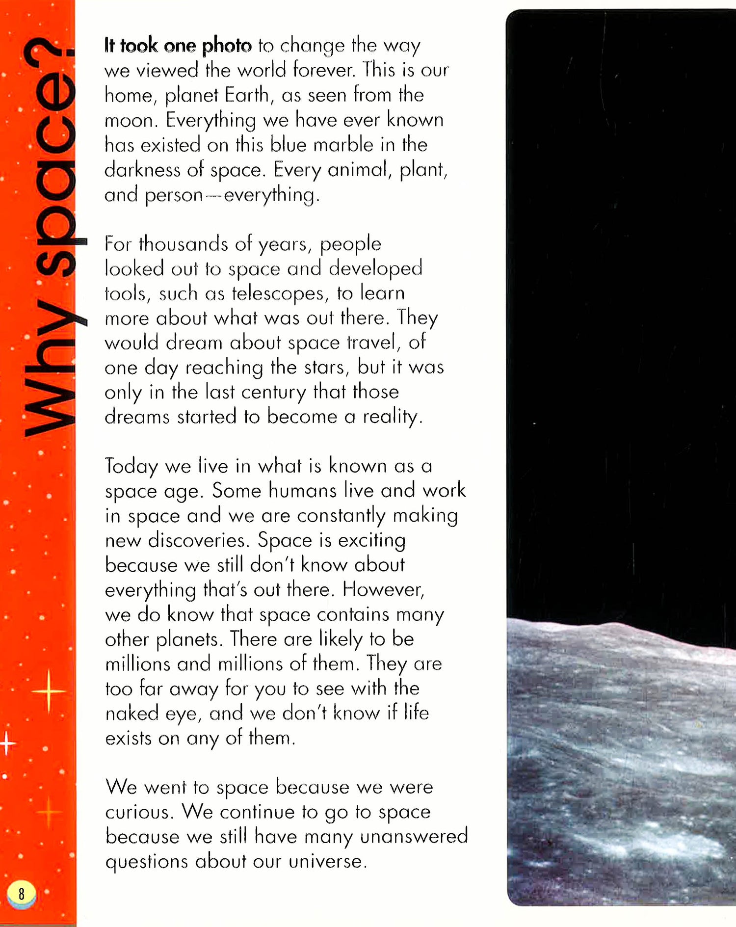 From man's dream on Earth about going into space to man’s first steps on the moon and beyond, satisfy your interest of space by immersing yourself in first-hand thought-provoking stories and jaw-dropping visuals of this high quality, content-rich educational book.