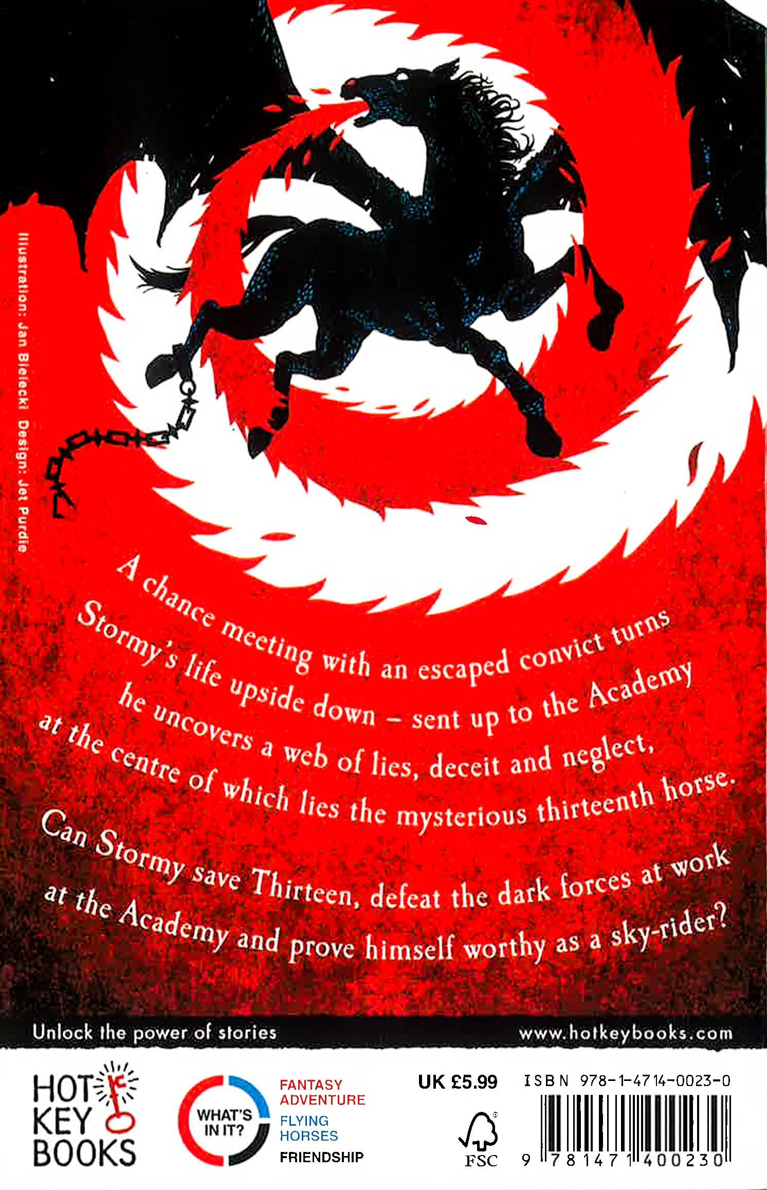 An orphan boy's triumph over adversity, with help from a fire-breathing, winged horse. Stormy is an orphan and a kitchen skivvy. He tends the compost, he scrubs the floors, and watches feasts make their way up the mountain as he survives on bread and water. A skivvy is all that Stormy can hope to be. But Stormy has a secret. He wants to be a sky-rider, to soar amongst the clouds on spitfyres: flying horses that spit fire and smoke, and answer only to their riders. A chance meeting with an escaped convict turns Stormy's life upside down. Sent up to the Academy he uncovers a web of lies, deceits and neglect, at the centre of which lies the mysterious thirteenth horse. Can Stormy save Thirteen, defeat the dark forces at work within the Academy and prove himself worthy as a sky-rider?