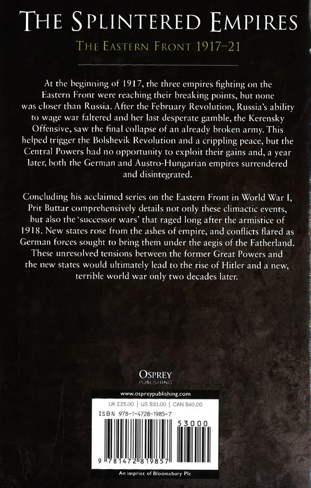 At the beginning of 1917, the three empires fighting on the Eastern Front were reaching their breaking points, but none was closer than Russia. After the February Revolution, Russia's ability to wage war faltered and her last desperate gamble, the Kerensky Offensive, saw the final collapse of her army. This helped trigger the Bolshevik Revolution and a crippling peace, but the Central Powers had no opportunity to exploit their gains and, a year later, both the German and Austro-Hungarian empires surrendered and disintegrated. Concluding his acclaimed series on the Eastern Front in World War I, Prit Buttar comprehensively details not only these climactic events, but also the 'successor wars' that raged long after the armistice of 1918. New states rose from the ashes of empire, and war raged as German forces sought to keep them under the aegis of the Fatherland. These unresolved tensions between the former Great Powers and the new states would ultimately lead to the rise of Hitler and a new, terrible world war only two decades later.