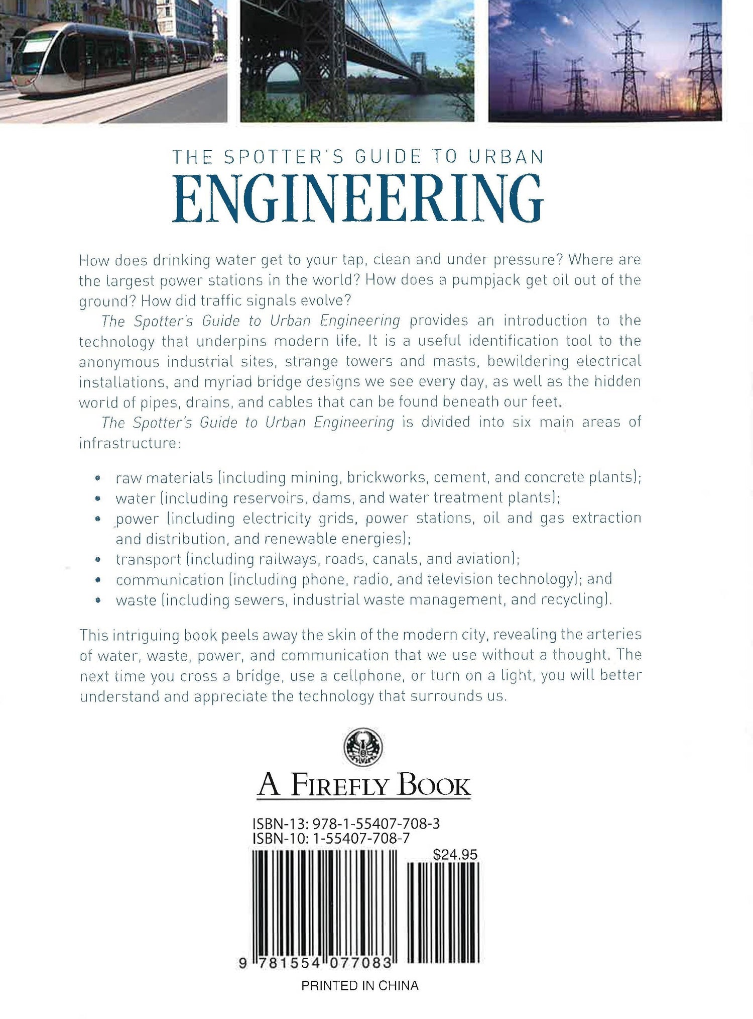 An illustrated field guide to the technology that keeps our cities and towns working. The Spotter's Guide to Urban Engineering is a useful identification tool to the mysteries of how our cities are built and work. Each spread identifies an example of urban engineering and describes what it is, how it works and why it is there. Annotated diagrams explain the technology, and location maps indicate noteworthy real-world examples. Most importantly for spotters, the book gives advice on how to identify these features and tips on where to spot them. The book covers the main areas of engineering infrastructure. Concise descriptions begin with a brief introduction, a timeline tracing that area's development and a synopsis of facts and figures. More than 300 illustrations and a durable flexibound format allow for easy reference in the field. The book covers: Managing raw materials, including mining, agriculture, waterworks and manufacturing Making power, including electricity grids, oil and gas extraction and distribution, and renewable energy Transport, including highways, railways, bridges, tunnels, canals and aviation Communications, including telephone, radio, television, satellites and digital technology Waste, including sewers, industrial and residential waste management, recycling. The Spotter's Guide to Urban Engineering provides lay readers with a fascinating introduction to the technology that underpins modern life. Those contemplating a career in civil engineering will find the book of particular interest.