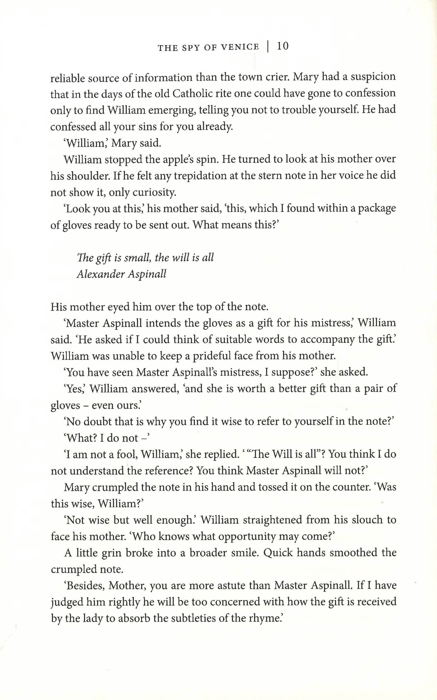 Dazzled by the city's masques - and its beauties - Will little realises the peril in which he finds himself. Catholic assassins would stop at nothing to end his mission on the point of their sharpened knives, and lurking in the shadows is a killer as clever as he is cruel.