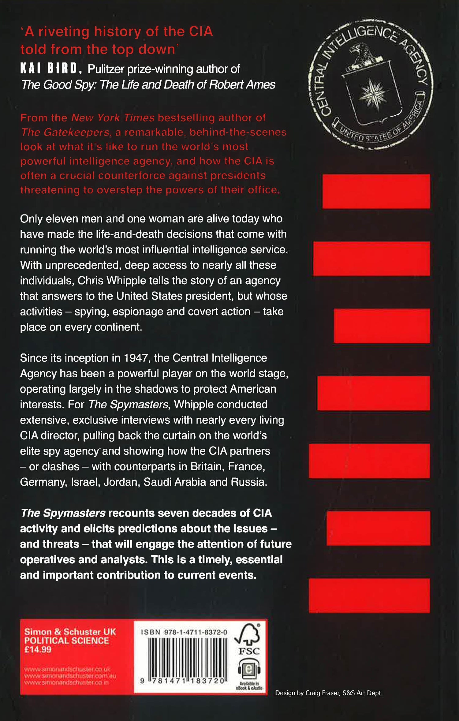 Since its inception in 1947, the Central Intelligence Agency has been a powerful player on the world stage, operating largely in the shadows to protect American interests. For The Spymasters, Whipple conducted extensive, exclusive interviews with nearly every living CIA director, pulling back the curtain on the world's elite spy agency and showing how the CIA partners ― or clashes ― with counterparts in Britain, France, Germany, Israel, Jordan, Saudi Arabia and Russia. Topics covered in the book include attempts by presidents to use the agency for their own ends; simmering problems in the Middle East and Asia; rogue nuclear threats; and cyberwarfare.