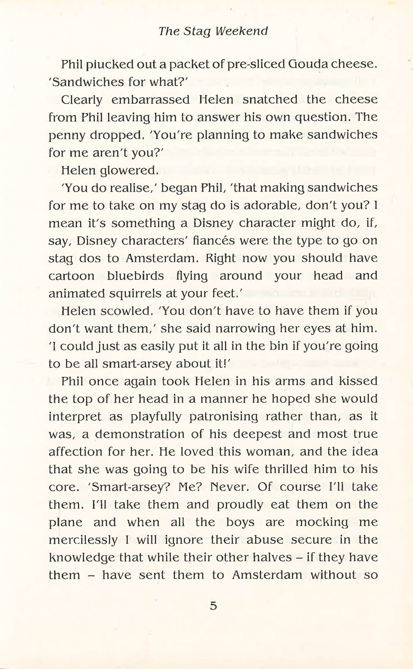 The Stag and Hen Weekend is the story of Phil and Helen, a couple in their thirties about to commit their lives to one another ...that is of course if they can just manage to get through their respective stag and hen weekends (his: Amsterdam; hers: a country house and day spa in the Peak District) without falling apart. Told in the unique form of two separate stories that have common characters as well as themes and conclusion, The Stag and Hen Weekend can be read from front to back or from back to front putting the reader in the driver's seat as to which story they wish to read first. Feisty, fun and thought provoking.