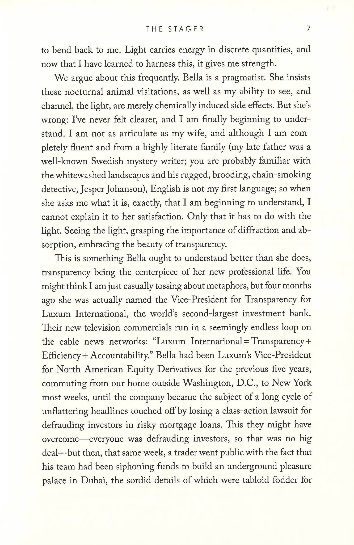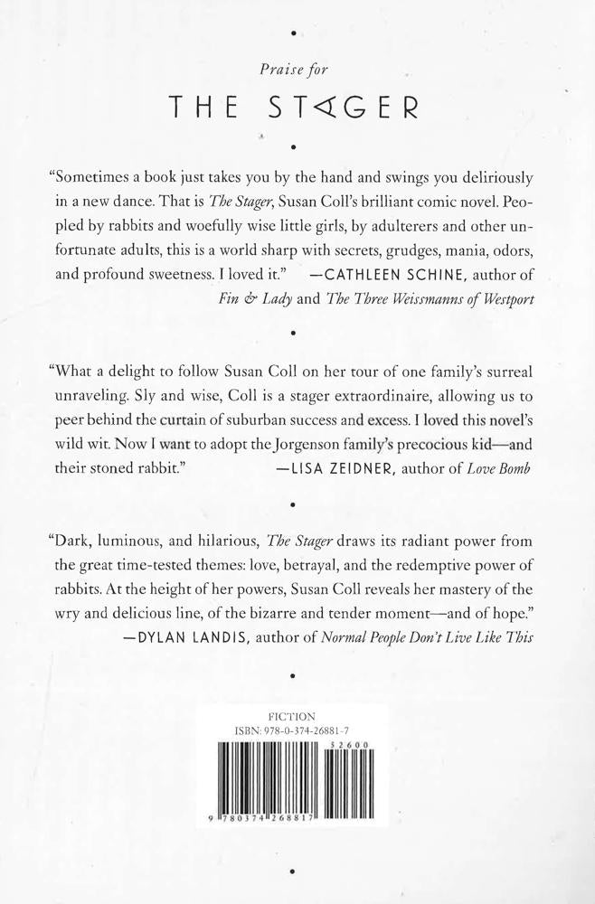 "The Stager "is a comedy of rabbits and real estate in the D.C. suburbs from Susan Coll, the author of Acceptance and Beach WeekDominique is one very bitter rabbit. His owner, Lars Jorgenson, is a former tennis pro who has blown out both knees, become obese, and is now addicted to a cocktail of prescription drugs containing the letters X and Z, one weird side-effect of which is that he has developed an omniscient point of view. Both Dominique and Lars are going crazy in the affluent Maryland suburbs where their faux Tudor home is up for sale. Idle on the market for months, the home is now being "staged" A professional has come in to redecorate and depersonalize the house so that others can imagine themselves living there. Into the messy personal life of Lars and his beautiful wife Bella comes Eve, an unemployed journalist-turned stager who immediately realizes, as she steps into the foyer, that she is in the home of her former best friend. Eve knows way too much about Bella, including the questionable paternity of the meddling young child who lives in this house. Questions of friendship, loyalty, fidelity, sobriety, and sanity are raised to hilarious effect in this dark comedy of how we live now in the age of planned communities, cookie-cutter mansions, and cutthroat careerism.
