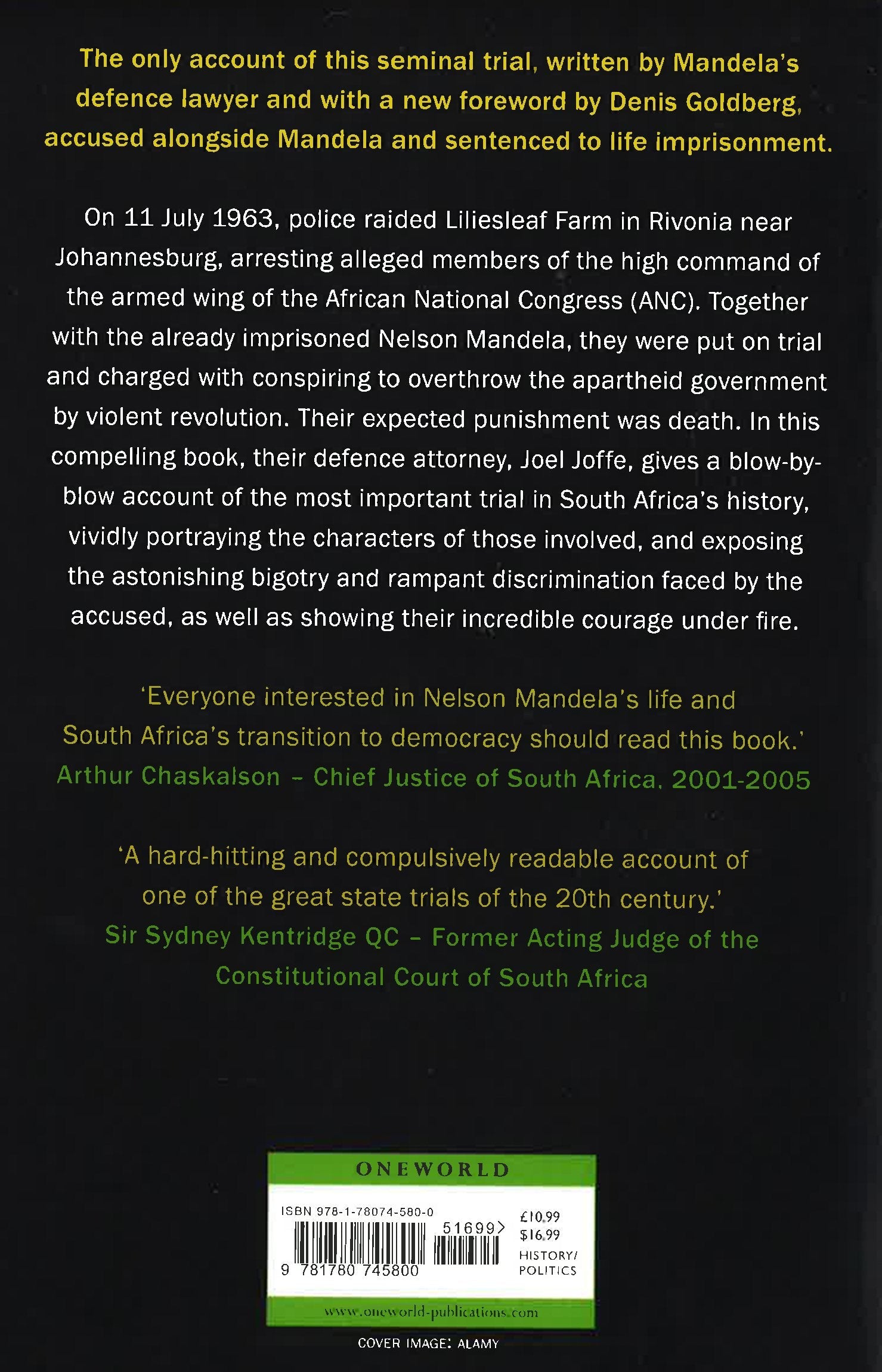 The only account of this seminal trial, written by Mandela's defence lawyer and with a new foreword by Denis Goldberg, accused alongside Mandela and sentenced to life imprisonment. On 11 July 1963, police raided Liliesleaf Farm in Rivonia near Johannesburg, arresting alleged members of the high command of the armed wing of the African National Congress (ANC). Together with the already imprisoned Nelson Mandela, they were put on trial and charged with conspiring to overthrow the apartheid government by violent revolution. Their expected punishment was death. In this compelling book, their defence attorney, Joel Joffe, gives a blow-by-blow account of the most important trial in South Africa's history, vividly portraying the characters of those involved, and exposing the astonishing bigotry and rampant discrimination faced by the accused, as well as showing their incredible courage under fire.