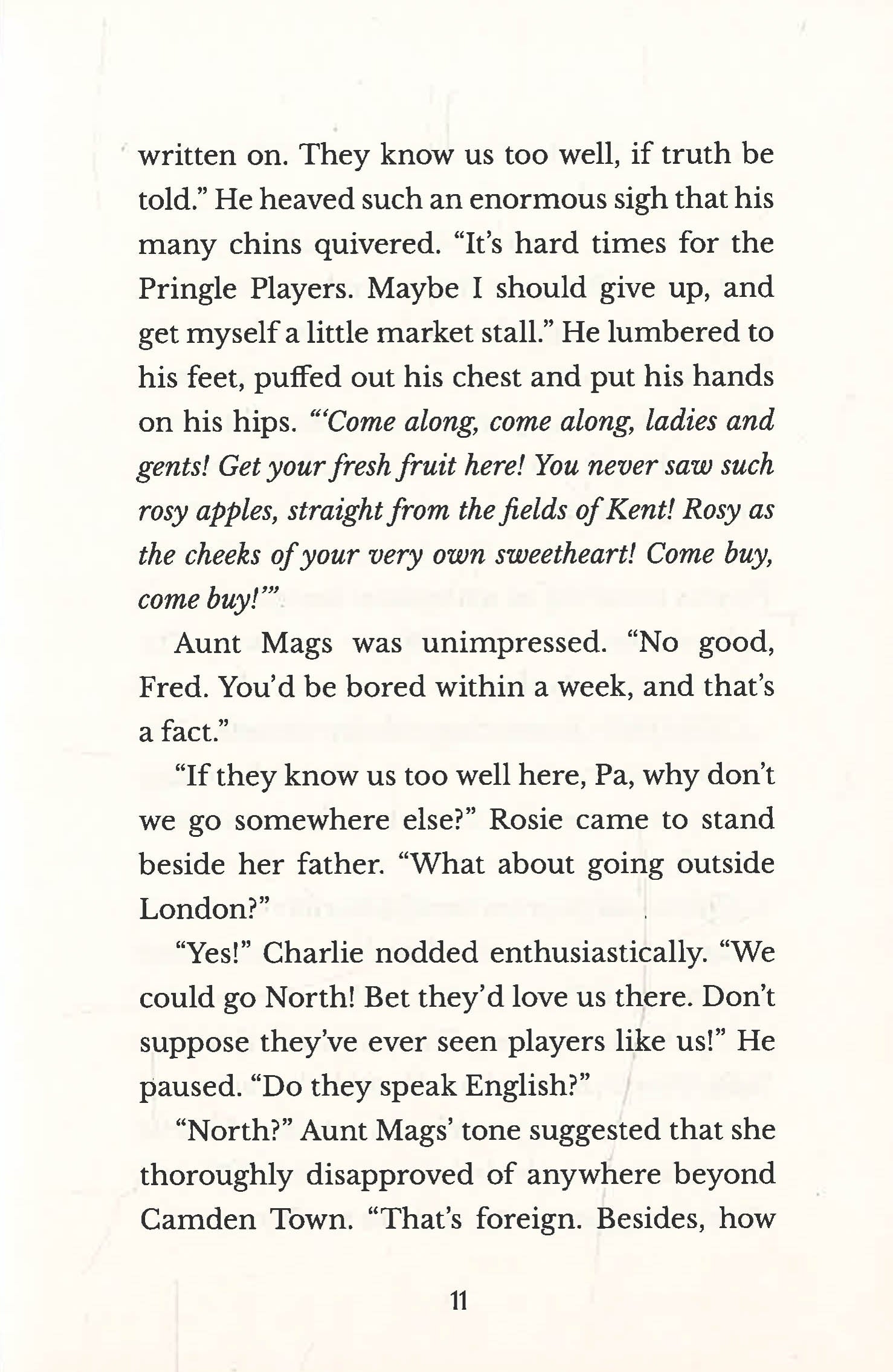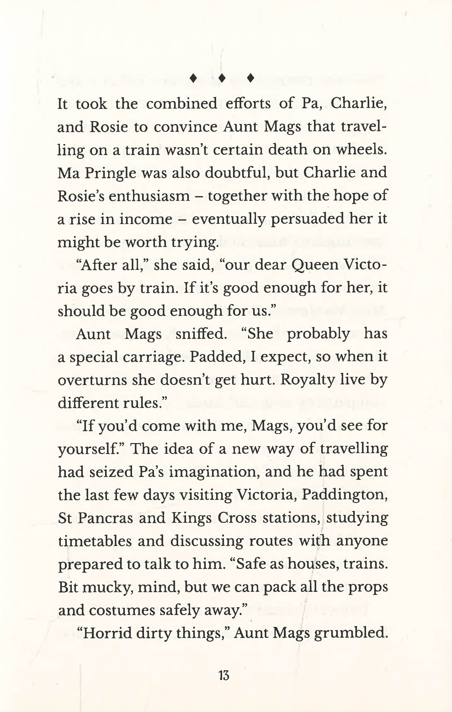 "Delightful ... with its edge-of-your-seat pace, it deserves applause." Sunday Times, Children's Book of the Week"Storytelling at its best ... a classic in the making." The ScotsmanTo avoid financial ruin, the Pringle family's theatre-troupe has left London behind, travelling to the north of England by train. With new audiences to play to, and less competition, they hope to make enough money to pay off their debts back home. But will their plans be foiled by the odious Olio Sleevery? It's time for young actors Rosie and Charlie to save the day - and, with the help of their new friend Edie Boiler, ensure the thunderous success of the company's first performance. A wonderful gallery of eccentric characters and an exuberant plot with a twist at the end ... this is storytelling at its theatrical best!"French is a writer of tremendous charm... Children of nine and upwards will want to jump aboard." The Literary Review"Vivian French is a sublime storyteller." Sunday Telegraph
