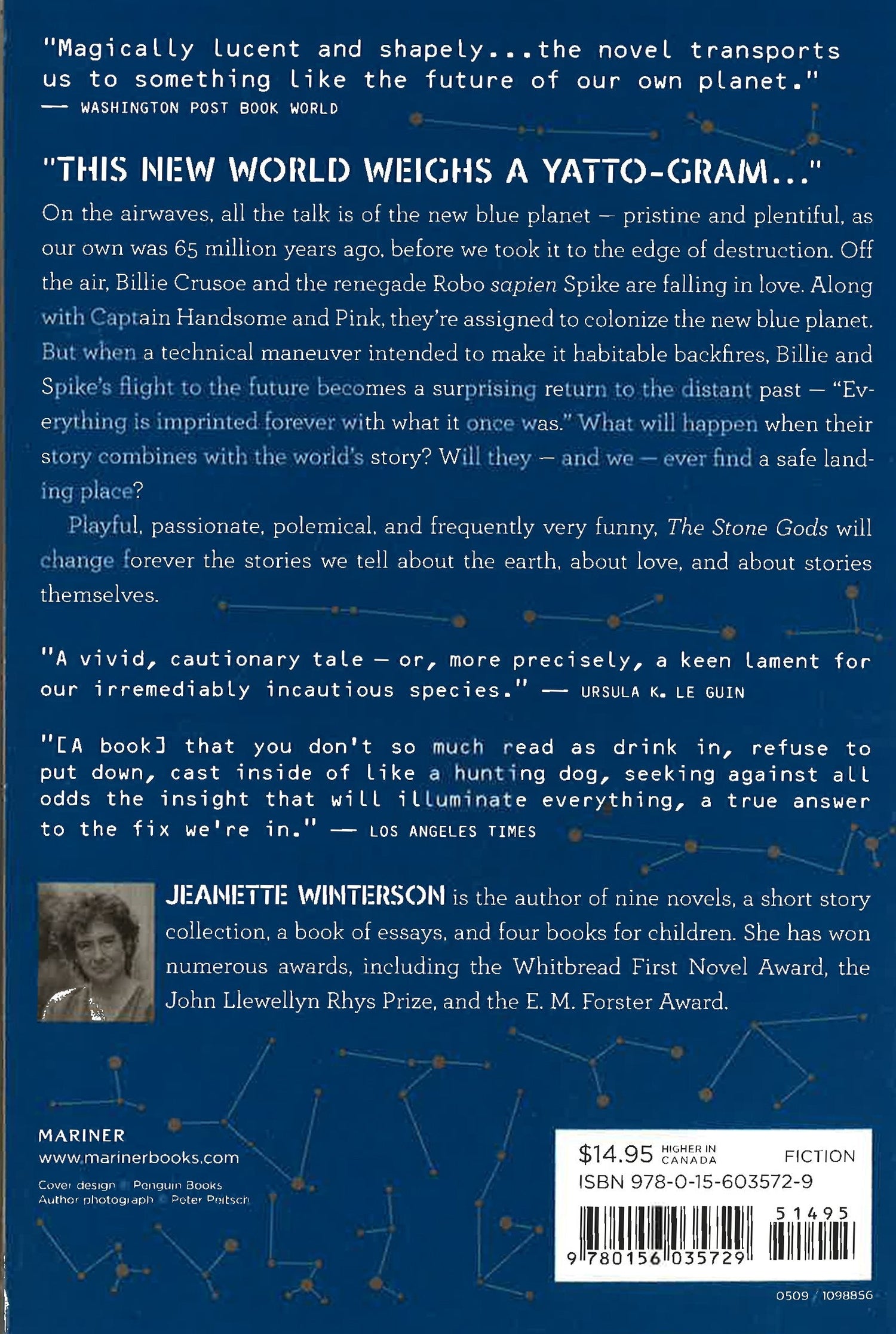 A glimpse into unlikely love braved in the face of the void. On the airwaves, all the talk is of the new blue planet–pristine and habitable, like our own 65 million years ago, before we took it to the edge of destruction. And off the air, Billie and Spike are falling in love. What will happen when their story combines with the world’s story, as they whirl towards Planet Blue, into the future? Will they–and we–ever find a safe landing place?Of immense imaginary and emotional scope, The Stone Gods is Jeanette Winterson at her prescient, playful, muscular best. An interplanetary love story, a traveller’s tale, a hymn to the beauty of the world, this is a novel that will change forever the stories we tell about the earth, about love and about stories themselves.