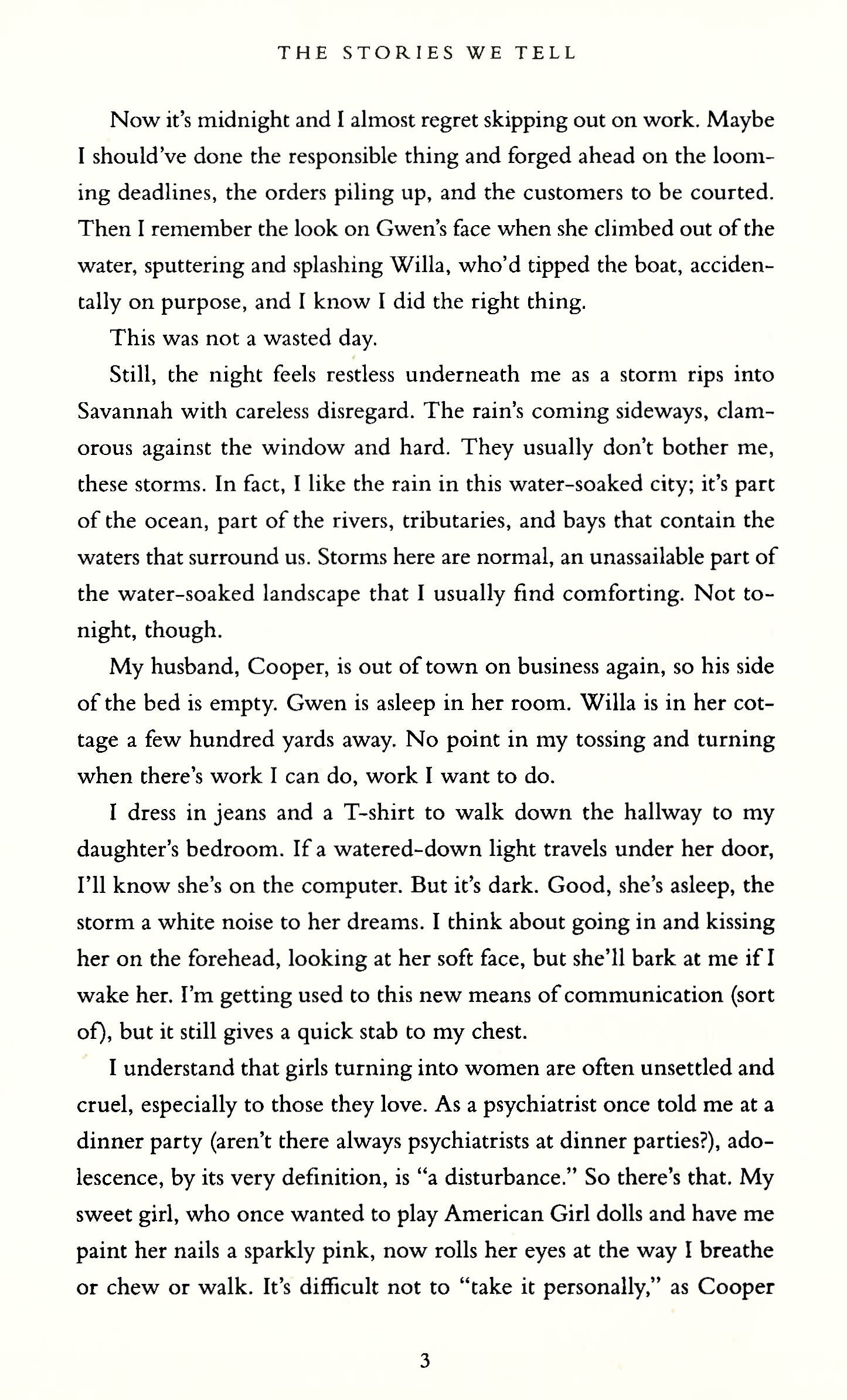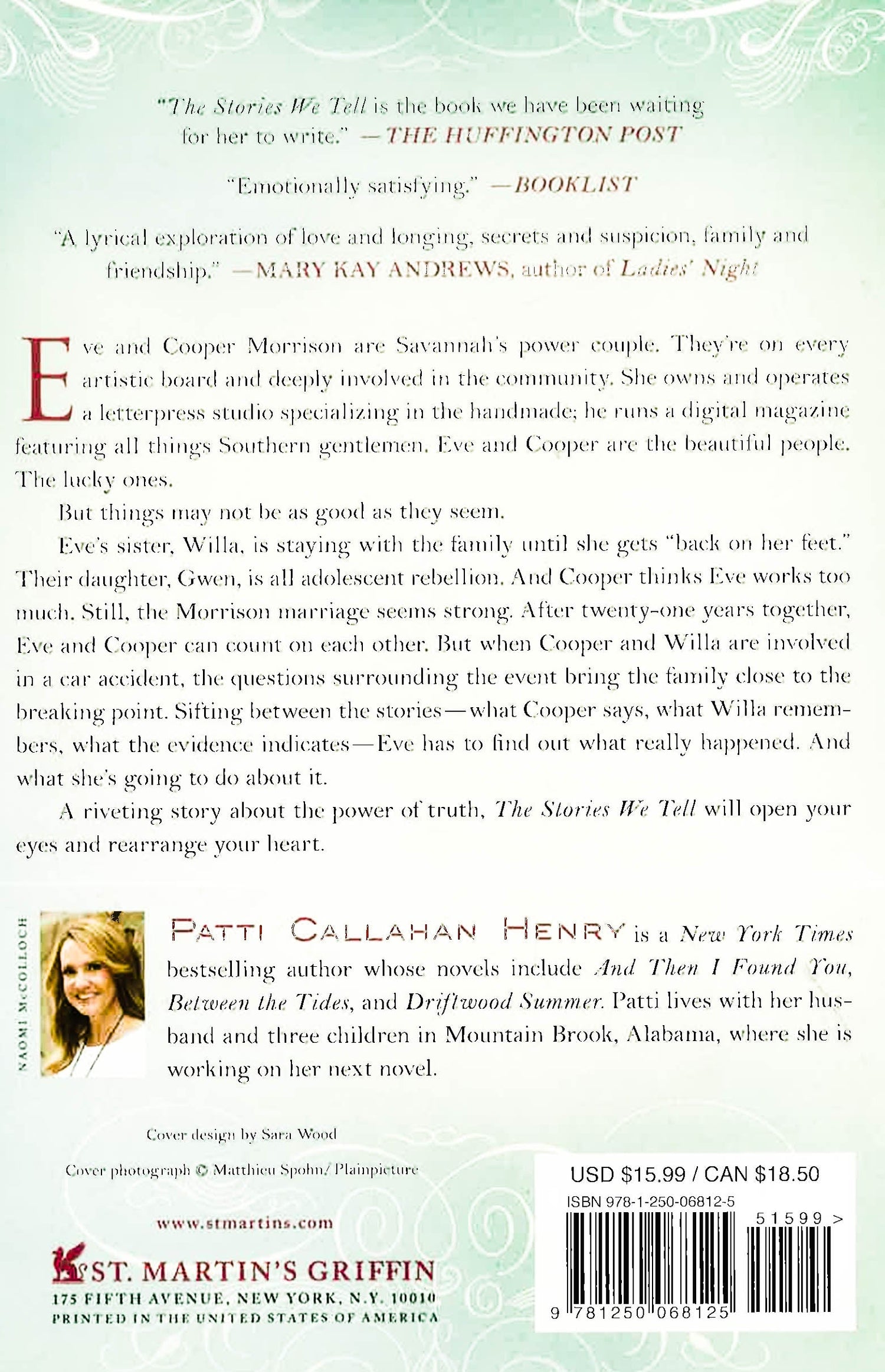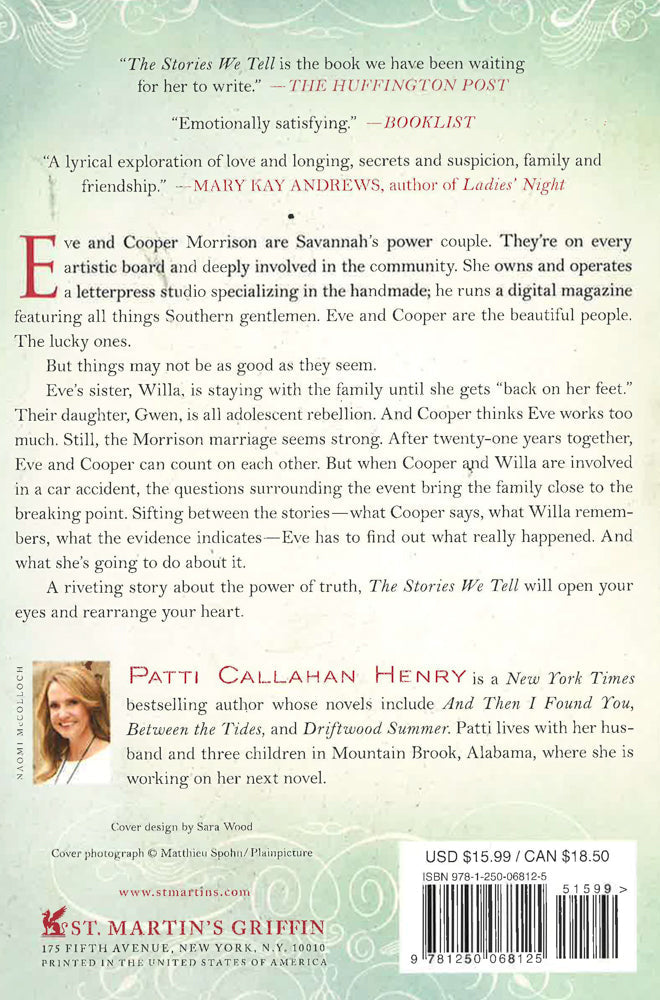 Bestselling author Patti Callahan Henry is back witha powerful novel about the stories we tell and the people we trust.Eve and Cooper Morrison are Savannah's power couple. They're on every artistic board and deeply involved in the community. She owns and operates a letterpress studio specializing in the handmade; he runs a digital magazine featuring all things southern gentlemen. The perfect juxtaposition of the old and the new, Eve and Cooper are the beautiful people. The lucky ones. And they have the wealth and name that comes from being part of an old Georgia family.But things may not be as good as they seem.Eve's sister, Willa, is staying with the family until she gets back on her feet. Their daughter, Gwen, is all adolescent rebellion. And Cooper thinks Eve works too much. Still, the Morrison marriage is strong. After twenty-one years together, Eve and Cooper know each other. They count on each other. They know what to expect. But when Cooper and Willa are involved in a car accident, the questions surrounding the event bring the family close to breaking point. Sifting between the stories--what Cooper says, what Willa remembers, what the evidence indicates--Eve has to find out what really happened. And what she's going to do about it.A riveting story about the power of truth, The Stories We Tell will open your eyes and rearrange your heart.