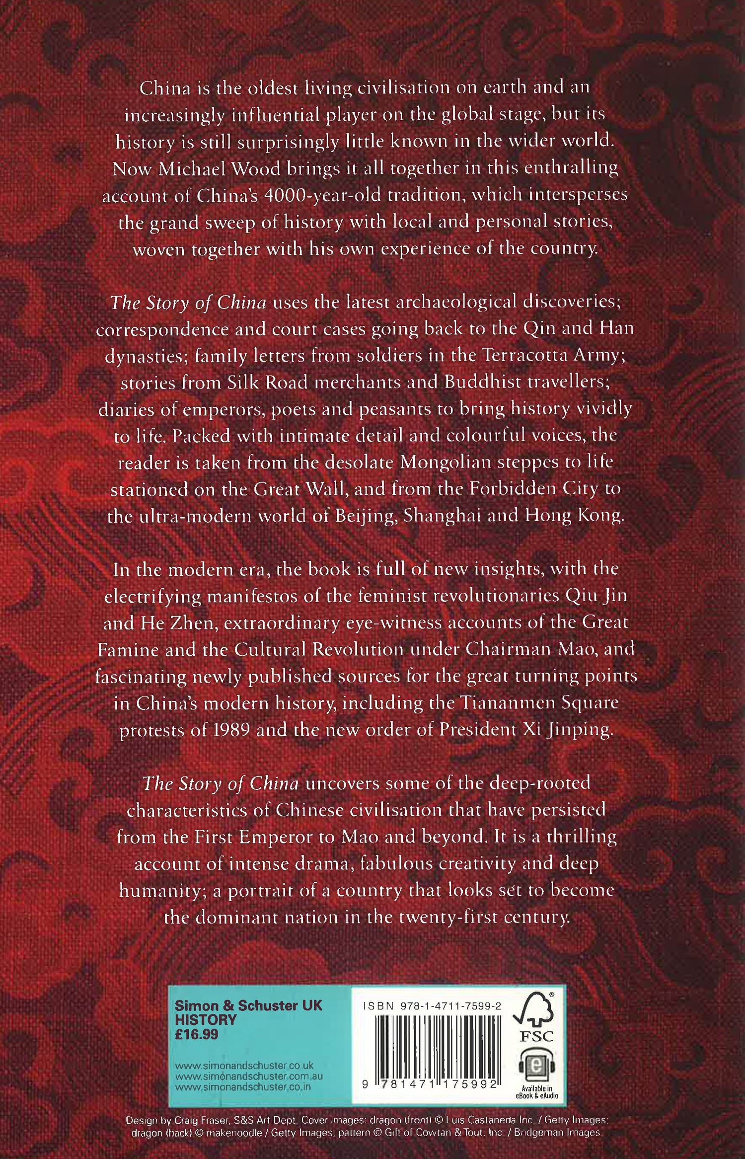 China is the oldest living civilisation on earth, but its history is still surprisingly little known in the wider world. Michael Wood's sparkling narrative, which mingles the grand sweep with local and personal stories, woven together with the author’s own travel journals, is an enthralling account of China’s 4000-year-old tradition, taking in life stationed on the Great Wall or inside the Forbidden City. The story is enriched with the latest archaeological and documentary discoveries; correspondence and court cases going back to the Qin and Han dynasties; family letters from soldiers in the real-life Terracotta Army; stories from Silk Road merchants and Buddhist travellers, along with memoirs and diaries of emperors, poets and peasants.