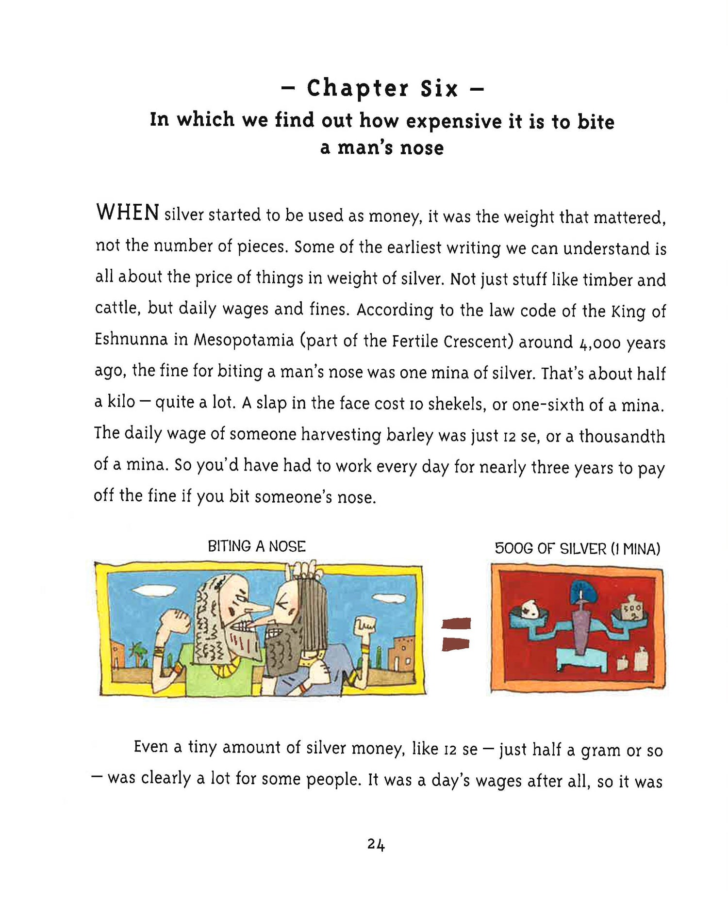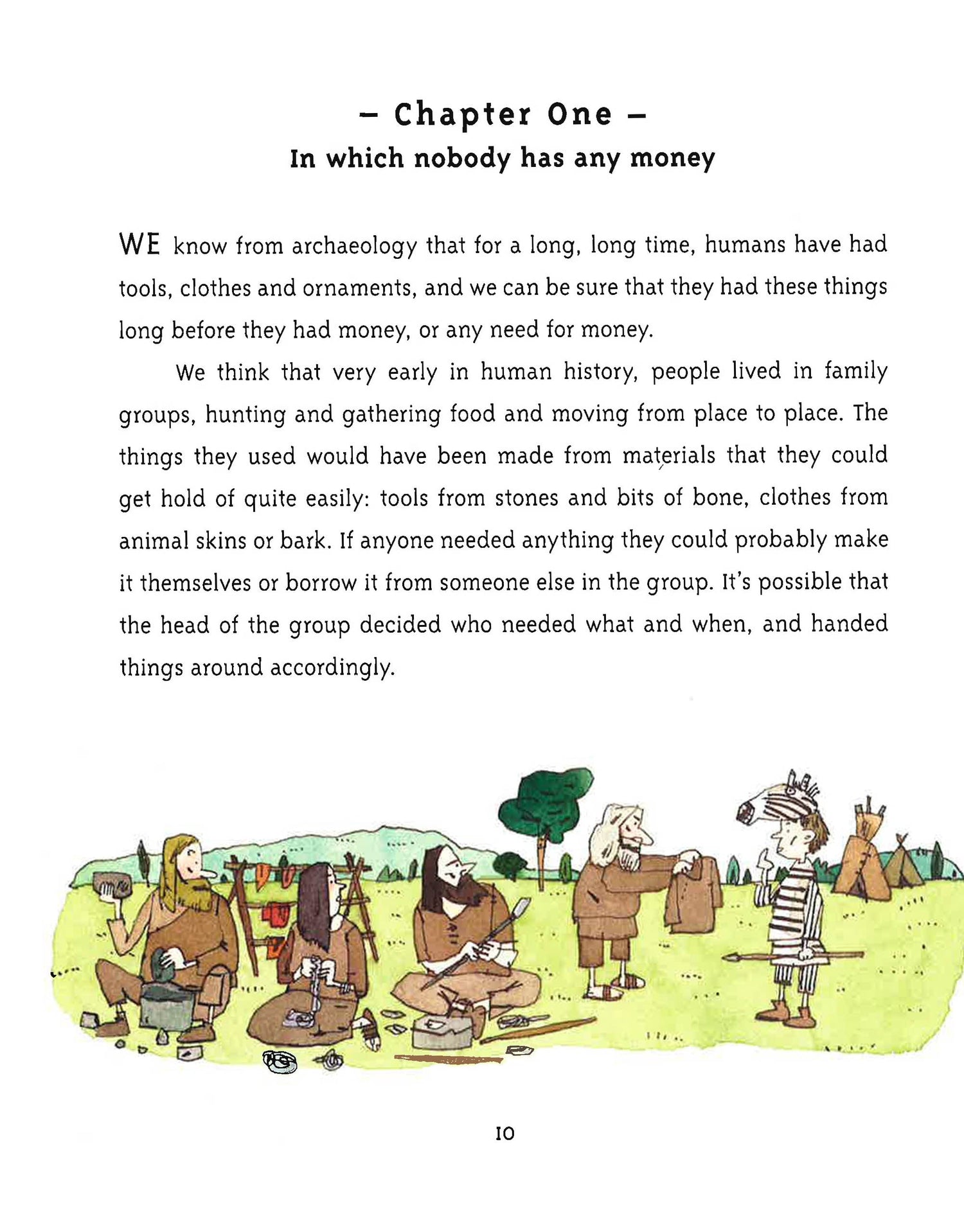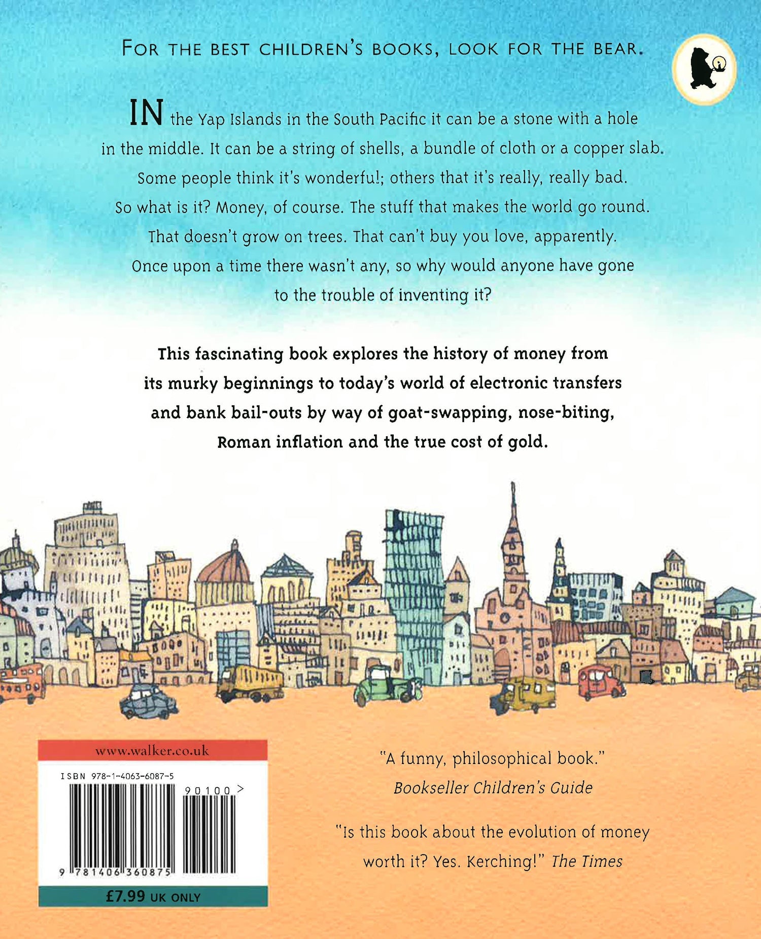 A funny, philosophical book about the universal subject of money, by award-winning non-fiction writer Martin Jenkins. A funny, philosophical look at the universal subject of money by award-winning non-fiction writer Martin Jenkins, illustrated by Satoshi Kitamura. In the Yap Islands in the South Pacific money can be a stone with a hole in the middle. It can be a string of shells, a bundle of cloth or a copper slab. It's the stuff that makes the world go round and doesn't grow on trees. In this fascinating and thought-provoking book, Martin Jenkins explores the history of money from its earliest beginnings to the electronic banking of today. Along the way we learn about hunter gatherers, barter, clay tablets, goat swapping, precious metals, hard bargains, IOUs, interest, coins, Romans, taxes, inflation, paper money, currencies and exchange rates. Satoshi Kitamura's quirky, satirical drawings perfectly complement the dry humour of the text and in the end we are reminded that money only exists because we believe in it.