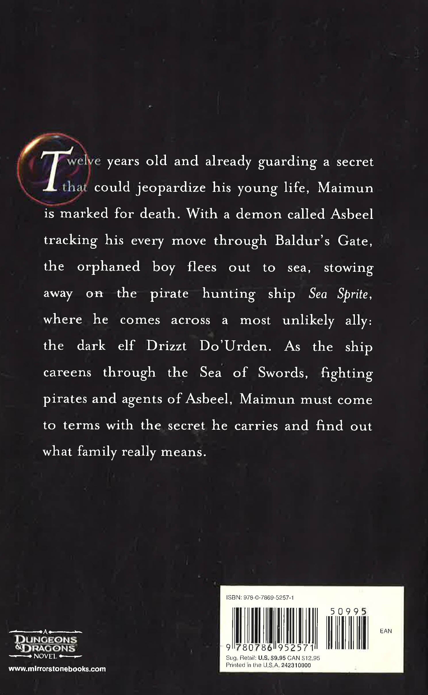 Barely a teen and already guarding a secret that could jeopardize his young life, Maimun is marked for death. With the help of a mysterious stranger, the boy escapes his village and flees out to sea, stowing away on the pirate hunting ship, Sea Sprite, where he comes across a most unlikely ally: the dark elf Drizzt Do'Urden. With a half-demon determined to destroy him, and a crew of sailors resentful of the trouble he's caused, Maimun must find the courage to prove his worth, both to his friends and to himself.