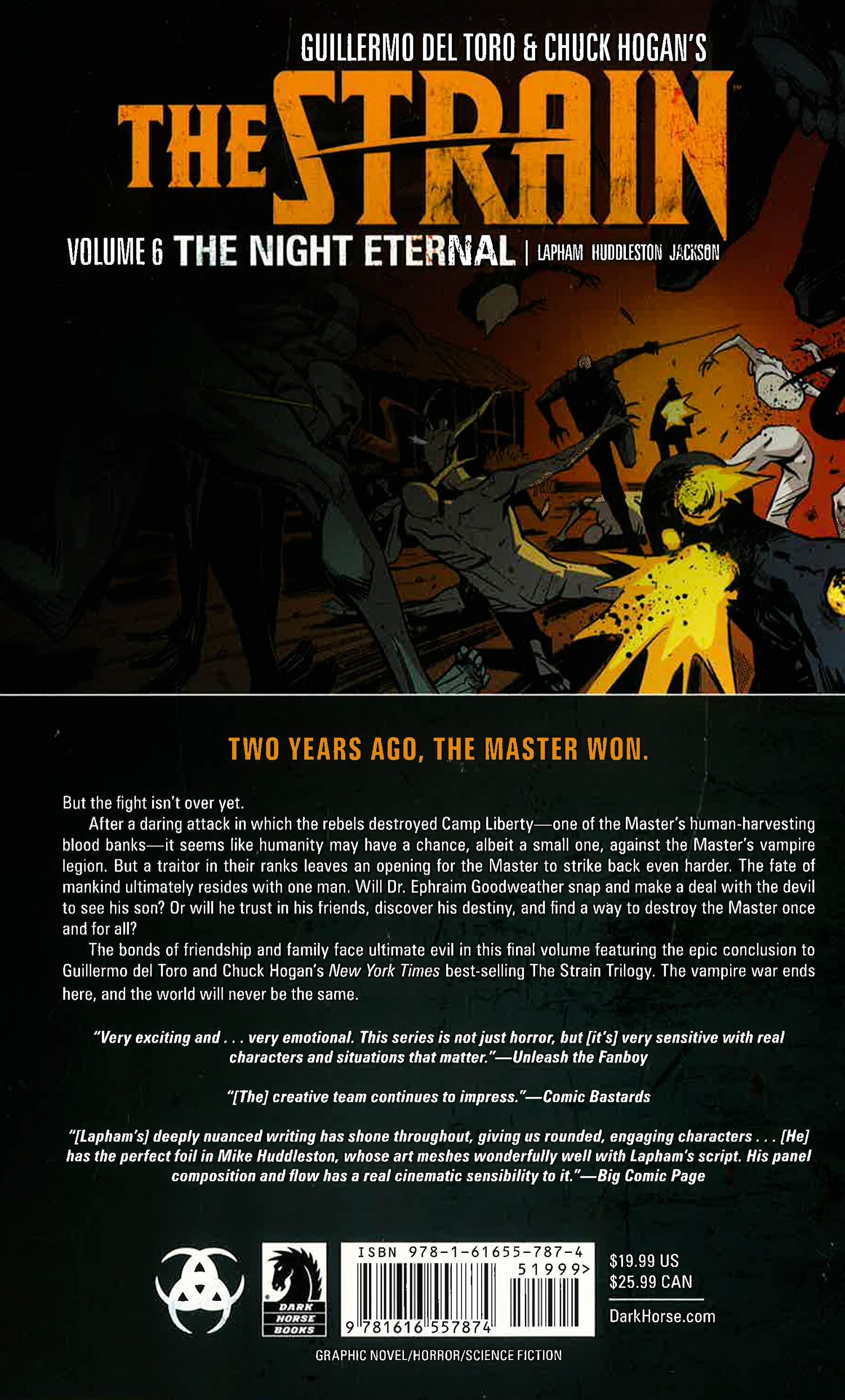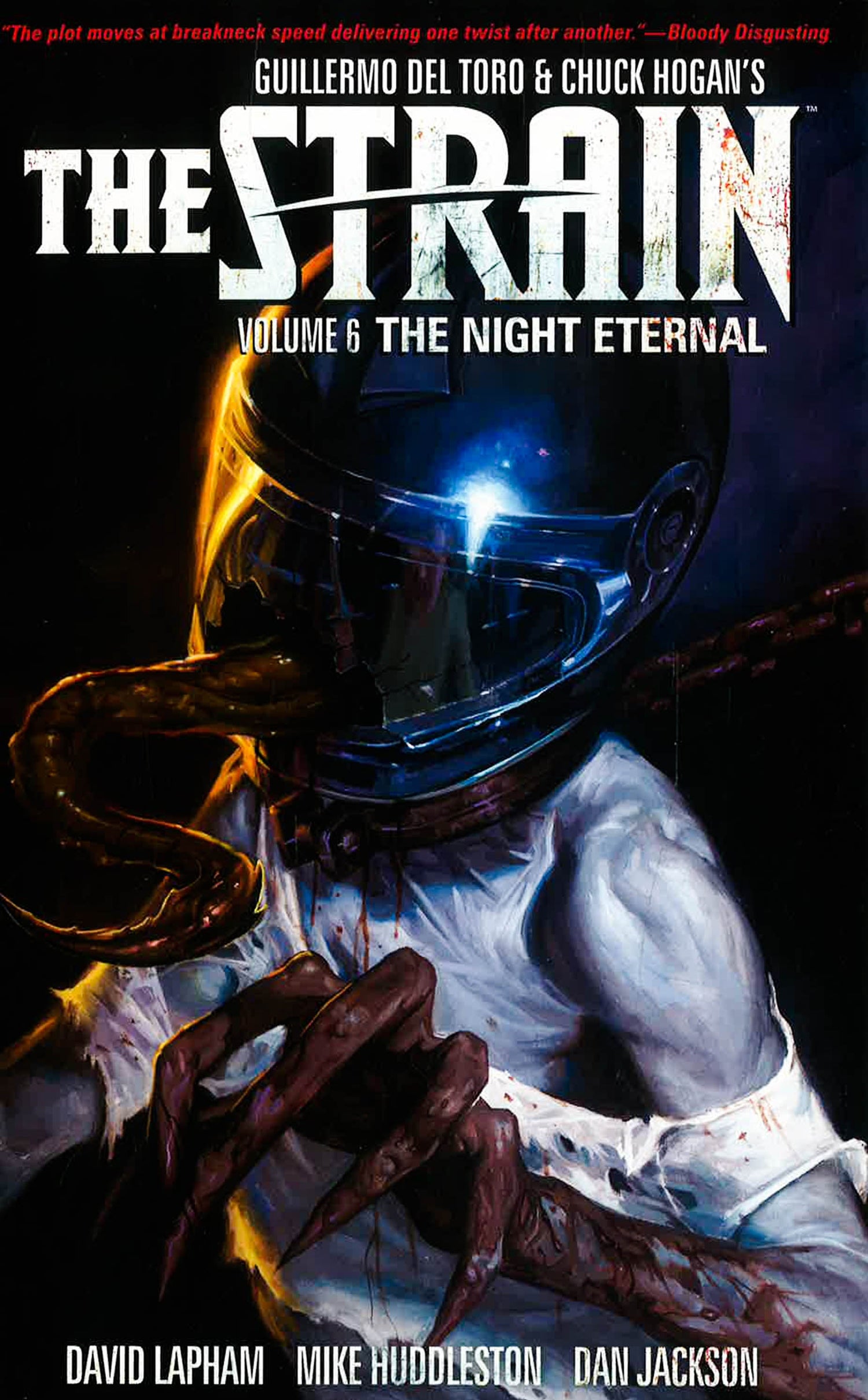 The rebels' victory at Camp Liberty has emboldened their efforts against the Master's vampire army, but a traitor in their ranks leaves an opening for the Master to strike back even harder. The fate of humanity ultimately resides with one man. Will Dr. Ephraim Goodweather finally snap and make a deal to see his son? Or will he use some newfound information to destroy the Master once and for all? This final collection of Guillermo del Toro and Chuck Hogan's epic Strain Trilogy features The Strain: The Night Eternal #7-#12.