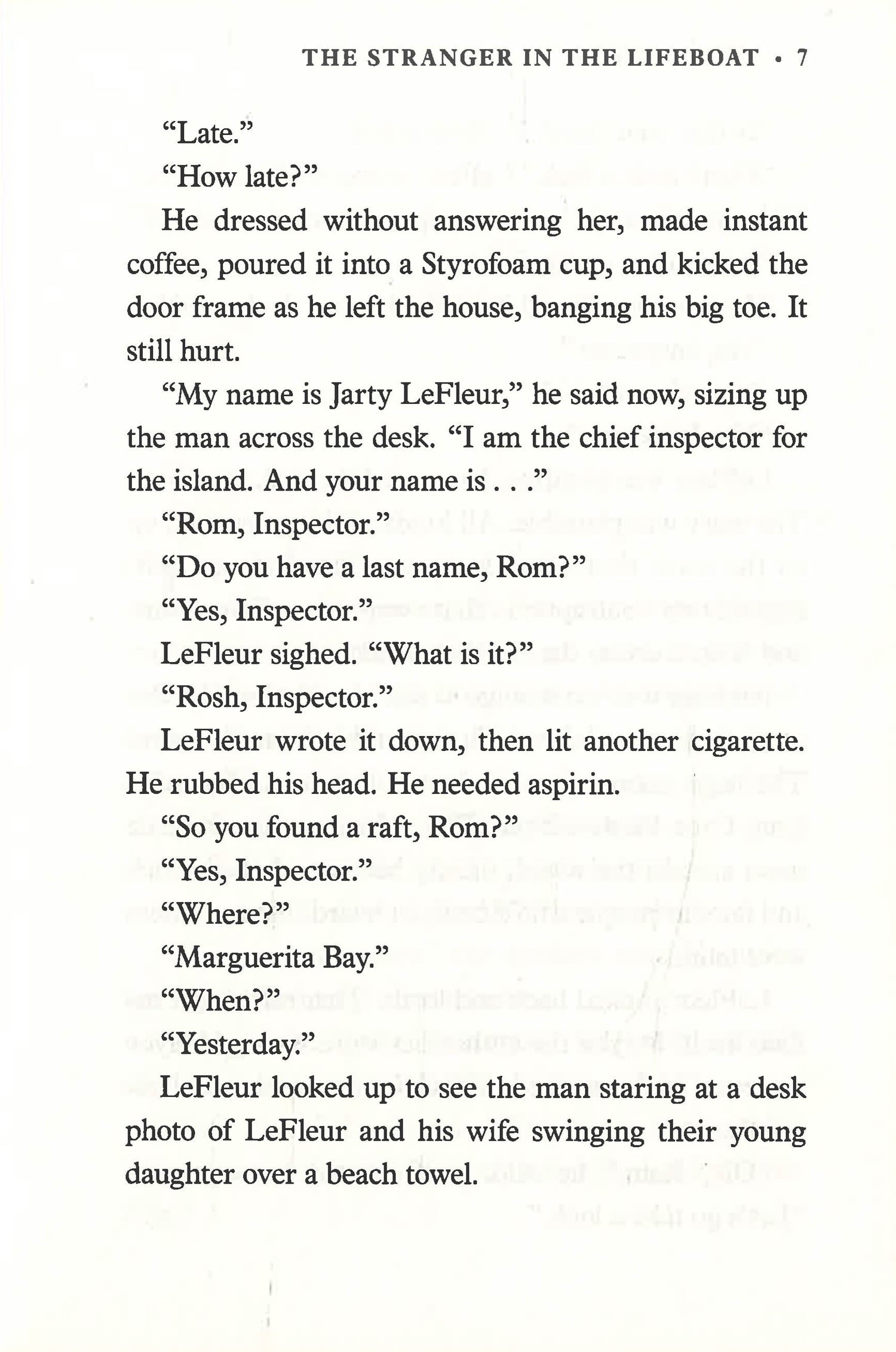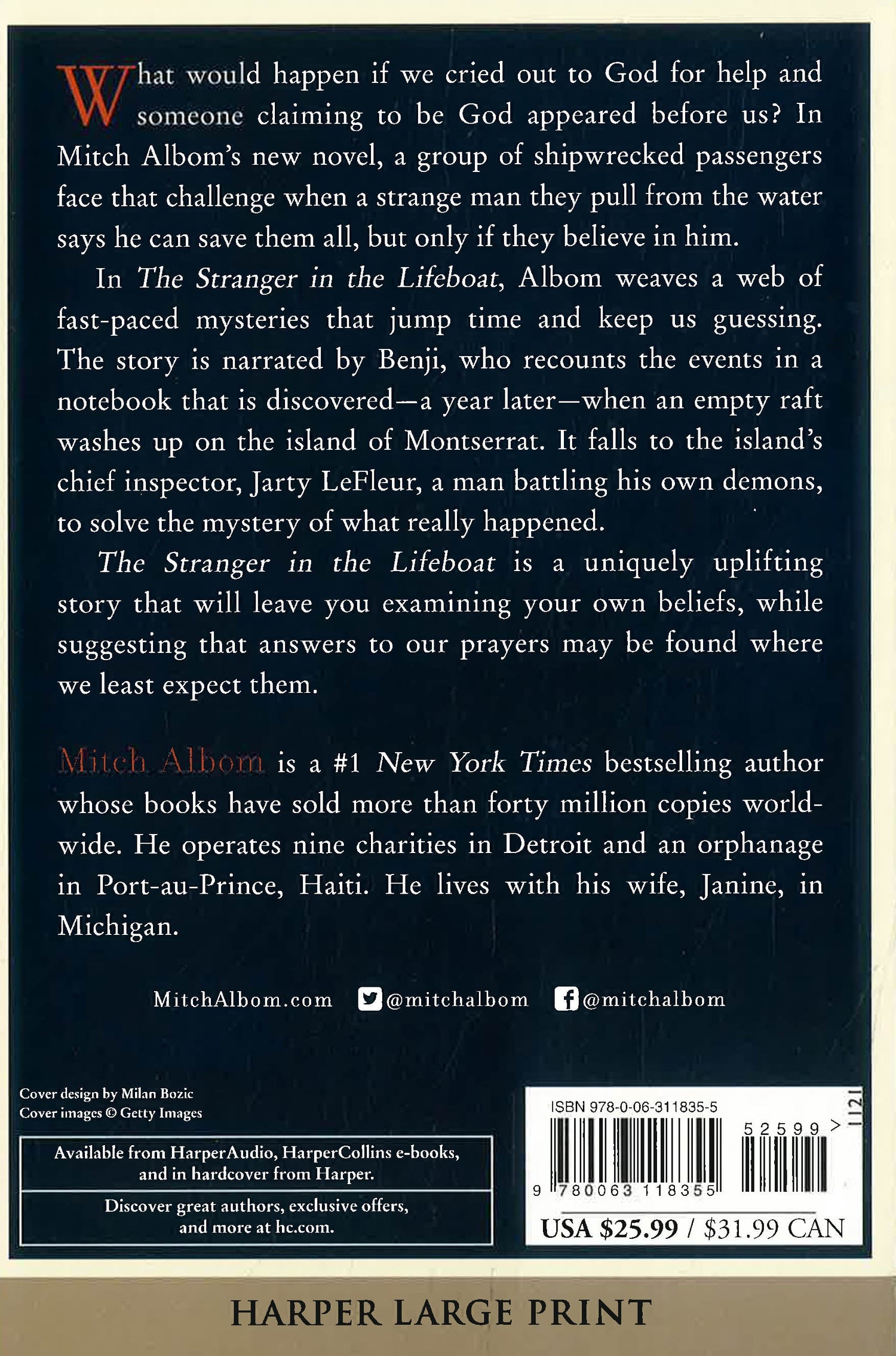 In The Stranger in the Lifeboat, Albom keeps us guessing until the end: Is this strange man really who he claims to be? What actually happened to cause the explosion? Are the survivors in heaven, or are they in hell? The story is narrated by Benji, one of the passengers, who recounts the events in a notebook that is discovered—a year later—when the empty life raft washes up on the island of Montserrat. It falls to the island’s chief inspector, Jarty LeFleur, a man battling his own demons, to solve the mystery of what really happened.